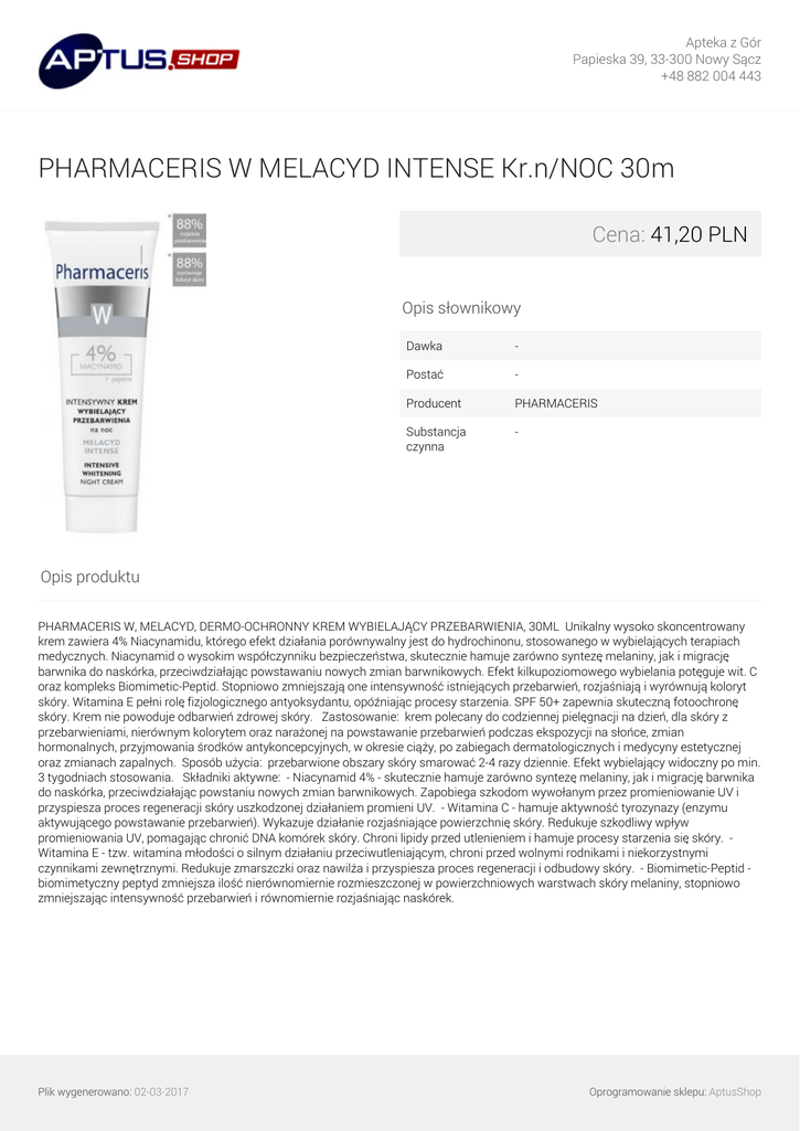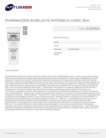 Apteka z Gór Papieska 39, 33-300 Nowy Sącz +48 882 004 443 PHARMACERIS W MELACYD INTENSE Kr.n/NOC 30m Cena: 41,20 PLN Opis słownikowy Dawka - Postać - Producent PHARMACERIS Substancja czynna - Opis produktu PHARMACERIS W, MELACYD, DERMO-OCHRONNY KREM WYBIELAJĄCY PRZEBARWIENIA, 30ML Unikalny wysoko skoncentrowany krem zawiera 4% Niacynamidu, którego efekt działania porównywalny jest do hydrochinonu, stosowanego w wybielających terapiach medycznych. Niacynamid o wysokim współczynniku bezpieczeństwa, skutecznie hamuje zarówno syntezę melaniny, jak i migrację barwnika do naskórka, przeciwdziałając powstawaniu nowych zmian barwnikowych. Efekt kilkupoziomowego wybielania potęguje wit. C oraz kompleks Biomimetic-Peptid. Stopniowo zmniejszają one intensywność istniejących przebarwień, rozjaśniają i wyrównują koloryt skóry. Witamina E pełni rolę fizjologicznego antyoksydantu, opóźniając procesy starzenia. SPF 50+ zapewnia skuteczną fotoochronę skóry. Krem nie powoduje odbarwień zdrowej skóry. Zastosowanie: krem polecany do codziennej pielęgnacji na dzień, dla skóry z przebarwieniami, nierównym kolorytem oraz narażonej na powstawanie przebarwień podczas ekspozycji na słońce, zmian hormonalnych, przyjmowania środków antykoncepcyjnych, w okresie ciąży, po zabiegach dermatologicznych i medycyny estetycznej oraz zmianach zapalnych. Sposób użycia: przebarwione obszary skóry smarować 2-4 razy dziennie. Efekt wybielający widoczny po min. 3 tygodniach stosowania. Składniki aktywne: - Niacynamid 4% - skutecznie hamuje zarówno syntezę melaniny, jak i migrację barwnika do naskórka, przeciwdziałając powstaniu nowych zmian barwnikowych. Zapobiega szkodom wywołanym przez promieniowanie UV i przyspiesza proces regeneracji skóry uszkodzonej działaniem promieni UV. - Witamina C - hamuje aktywność tyrozynazy (enzymu aktywującego powstawanie przebarwień). Wykazuje działanie rozjaśniające powierzchnię skóry. Redukuje szkodliwy wpływ promieniowania UV, pomagając chronić DNA komórek skóry. Chroni lipidy przed utlenieniem i hamuje procesy starzenia się skóry. Witamina E - tzw. witamina młodości o silnym działaniu przeciwutleniającym, chroni przed wolnymi rodnikami i niekorzystnymi czynnikami zewnętrznymi. Redukuje zmarszczki oraz nawilża i przyspiesza proces regeneracji i odbudowy skóry. - Biomimetic-Peptid biomimetyczny peptyd zmniejsza ilość nierównomiernie rozmieszczonej w powierzchniowych warstwach skóry melaniny, stopniowo zmniejszając intensywność przebarwień i równomiernie rozjaśniając naskórek. Plik wygenerowano: 02-03-2017 Powered by TCPDF (www.tcpdf.org) Oprogramowanie sklepu: AptusShop