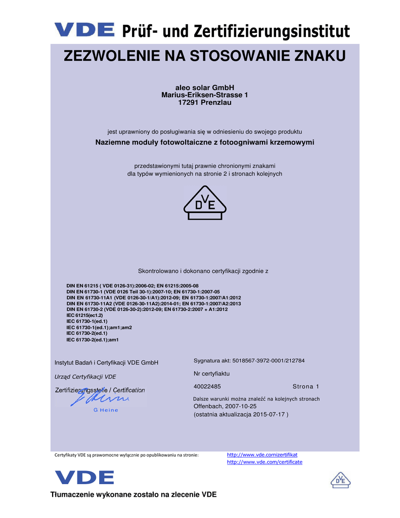 Prüf- und Zertifizierungsinstitut ZEZWOLENIE NA STOSOWANIE ZNAKU aleo solar GmbH Marius-Eriksen-Strasse 1 17291 Prenzlau jest uprawniony do posługiwania się w odniesieniu do swojego produktu Naziemne moduły fotowoltaiczne z fotoogniwami krzemowymi przedstawionymi tutaj prawnie chronionymi znakami dla typów wymienionych na stronie 2 i stronach kolejnych Skontrolowano i dokonano certyfikacji zgodnie z DIN EN 61215 ( VDE 0126-31):2006-02; EN 61215:2005-08 DIN EN 61730-1 (VDE 0126 Teil 30-1):2007-10; EN 61730-1:2007-05 DIN EN 61730-11A1 (VDE 0126-30-1/A1):2012-09; EN 61730-1:2007/A1:2012 DIN EN 61730-11A2 (VDE 0126-30-11A2):2014-01; EN 61730-1:2007/A2:2013 DIN EN 61730-2 (VDE 0126-30-2):2012-09; EN 61730-2:2007 + A1:2012 IEC 61215(ec1.2) IEC 61730-1(ed.1) IEC 61730-1(ed.1);am1;am2 IEC 61730-2(ed.1) IEC 61730-2(ed.1);am1 Instytut Badań i Certyfikacji VDE GmbH Urząd Certyfikacji VDE Sygnatura akt: 5018567-3972-0001/212784 Nr certyfiaktu 40022485 Str o n a 1 Dalsze warunki można znaleźć na kolejnych stronach G Heine . Offenbach, 2007-10-25 (ostatnia aktualizacja 2015-07-17 ) Certyfikaty VDE są prawomocne wyłącznie po opublikowaniu na stronie: VDE Tłumaczenie wykonane zostało na zlecenie VDE http://www.vde.cornizertifikat http://www.vde.com/certificate Instytut Badań i Certyfikacji VDE Zezwolenie na stosowanie znaku Nr certyfikatu Strona 40022485 2 Nazwa i siedziba posiadacza zezwolenia aleo solar GmbH, Marius-Eriksen-Strasse 1, 17291 Prenzlau Sygnatura akt Ostatnia aktualizacja Data 5018567-3972-0001 / 212784 / ET2 / BWL 2015-07-17 2007-10-25 Ta strona jest ważna jedynie w połączeniu ze stroną 1 certyfikatu nr 40022485. Naziemne moduły fotowoltaiczne z fotoogniwami krzemowymi Typ(y) A) A) A) A) B) B) C) C) C) C) D) S18YXXXZ P18YXXXZ S19YXXXZ / S79YXXXZ / S59YXXXZ P19YXXXZ L18YXXXZ L19YXXXZ / L79YXXXZ S24YXXXZ P24YXXXZ S25YXXXZ / S75YXXXZ P25YXXXZ / P75YXXXZ L24YXXXZ Struktura oznakowania typu Patrz załączniki nr 1 - 2 XXX w oznakowaniu typu zastępuje rzeczywistą moc modułu w standardowych warunkach testowych (STC), zaokrągloną w dół do liczby będącej wielokrotnością 5. "Y" w oznakowaniu typu zastępuje ".", "U", "G", "H", "J", "K" lub "L" i oznacza istotne właściwości elektryczne lub / i różne obszary sprzedaży. "Z" w oznakowaniu typu zastępuje „.", „G", „T" lub "puste miejsce“ I oznacza różne właściwości mechaniczne. Dodatek do oznakowania typu Opcjonalnie – dodatek "sol" dla modułów z ramą Solrif (montaż poziomy) Ciąg dalszy na stronie 3 Doument ten ważny jest tylko wraz z oryginalnym certyfikatem nr 40022485. Tłumaczenie wykonane zostało na zlecenie VDE Instytut Badań i Certyfikacji VDE Zezwolenie na stosowanie znaku Nr certyfikatu Strona 40022485 3 Nazwa i siedziba posiadacza zezwolenia aleo solar GmbH, Marius-Eriksen-Strasse 1, 17291 Prenzlau Sygnatura akt Ostatnia aktualizacja Data 5018567-3972-0001 / 212784 / ET2 / BWL 2015-07-17 2007-10-25 Dodatek do oznakowania typu Opcjonalnie – dodatek "ulr" dla modułów o różnych obszarach sprzedaży. Opcjonalnie – dodatek "gen2" dla modułow innej generacji modułowej. Max. napięcie systemowe Klasa ochronności Klasa zastosowania Odporność ogniowa DC 1000 V II A Class C 20 A Max. prąd wsteczny Informacje dodatkowe Moduły mogą być stosowane w przypadku grubszych warstw śniegu i lodu (5400 Pa). Dla A), C) Dalsze dane Patrz załączniki nr 1 - 2 __________________________________________________________________________________ Certyfikat zezwolenia na stosowanie znaku stanowi dla producenta lub jego pelnomocnika podstawę do deklaracji zgodności WE oraz oznakowania CE i zaświadcza o zgodności z podstawowymi wymogami dyrektywy niskonapięciowej WE (2006/95/EG do 19.04.2016, 2014/35/EU od 20.04.2016). Instytut Badań i Certyfikacji VDE Sekcja ET2 Doument ten ważny jest tylko wraz z oryginalnym certyfikatem nr 40022485. Tłumaczenie wykonane zostało na zlecenie VDE Instytut Badań i Certyfikacji VDE Zezwolenie na stosowanie znaku Nr certyfikatu Dodatek 40022485 Nazwa i siedziba posiadacza zezwolenia aleo solar GmbH, Marius-Eriksen-Strasse 1, 17291 Prenzlau Sygnatura akt Ostatnia aktualizacja Data 5018567-3972-0001 / 212784 / ET2 / BWL 2015-07-17 2007-10-25 Ta strona jest ważna jedynie w połączeniu ze stroną 1 certyfikatu nr 40022485. Naziemne moduły fotowoltaiczne z fotoogniwami krzemowymi Miejsce (miejsca) produkcji Nr referencyjny 30014341 aleo solar GmbH Marius-Eriksen-Strasse 1 D-17291 PRENZLAU Instytut Badań i Certyfikacji VDE Sekcja ET2 Doument ten ważny jest tylko wraz z oryginalnym certyfikatem nr 40022485. Tłumaczenie wykonane zostało na zlecenie VDE Instytut Badań i Certyfikacji VDE Zezwolenie na stosowanie znaku Nr certyfikatu Strona informacyjna 40022485 Nazwa i siedziba posiadacza zezwolenia aleo solar GmbH, Marius-Eriksen-Strasse 1, 17291 Prenzlau Sygnatura akt Ostatnia aktualizacja Data 5018567-3972-0001 / 212784 / ET2 / BWL 2015-07-17 2007-10-25 Ta strona jest ważna jedynie w połączeniu ze stroną 1 certyfikatu nr 40022485. Zezwolenie na wykorzystanie prawnie chronionego znaku VDE przedstawionego na stronie 1: Podstawą dla korzystania ze znaku są Ogólne Warunki Handlowe Instytutu Badań i Certyfikacji VDE – VDE Prüf- und Zertifizierungsinstitut GmbH (www.vde.com\AGB-Institut). Prawo do korzystania ze znaku posiada tylko wymieniona firma wraz z wymienionym miejscem produkcji oraz wyżej wymienione produkty z przyporządkowanymi im oznakowaniami. Miejsce produkcji musi zostać tak przygotowane, by zapewniona została ciągła produkcja sprawdzonej i certyfikowanej wersji produktu. Zezwolenie obowiązuje tak długo, dopóki ważne są postanowienia VDE, które przyjęte zostały za podstawę certyfikacji, o ile nie zostaną one uchylone na podstawie innych warunków wynikających z regulaminu certyfikacji (PM102). Okres ważności zezwolenia na znak VDE-GS może zostać przedłużony na podstawie wniosku. W przypadku prawnych i / lub norma