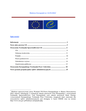 Biuletyn Europejski nr 12(35)/2016* Spis treści Informacje .......................................................................................................... 2 Nowe akty prawne UE .......................................................................................... 5 Orzeczenia Trybunału Sprawiedliwości UE ...................................................... 6 Cła ............................................................................................................... 6 Ochrona środowiska ................................................................................... 9 Podatki ....................................................................................................... 10 Prawa podstawowe .................................................................................... 13 Szkolnictwo wyższe .................................................................................. 14 Zamówienia publiczne .............................................................................. 15 Orzeczenia Europejskiego Trybunału Praw Człowieka ................................. 18 Nowe pytania prejudycjalne sądów administracyjnych .................................. 25 * Biuletyn opracowywany przez Wydział VII Prawa Europejskiego w Biurze Orzecznictwa NSA stanowi informację o wybranych aktach prawnych Unii Europejskiej i orzeczeniach Trybunału Sprawiedliwości Unii Europejskiej oraz aktach prawnych Rady Europy i orzeczeniach Europejskiego Trybunału Praw Człowieka, mogących mieć znaczenie dla orzecznictwa sądów administracyjnych; jest dostępny w bazie CBOIS oraz na stronie http://www.nsa.gov.pl/biuletyn-europejski.php. Biuletyn Europejski nr 12(35)/2016 Informacje stawkę 1 grudnia 2016 r. Parlament Europejski tego opowiedział się za przyjęciem tzw. umowy drukowane, parasolowej, czyli i czasopisma. porozumienia między całościowego UE a USA jak na publikacje książki, Jednak gazety elektroniczne wydania tych publikacji muszą już być w sprawie ochrony danych osobowych objęte przekazywanych z wyjątkiem w podatku postępowaniach karnych. podstawową stawką książek VAT, cyfrowych dostarczanych na nośniku fizycznym, jak np. CD. Jeżeli zaproponowane przez KE 1 grudnia 2016 r. Parlament Europejski przepisy zostaną przyjęte, to umożliwią przegłosował przyszłoroczny budżet UE. zrównanie stawek VAT na publikacje Przewiduje on zwiększone wydatki na drukowane bezpieczeństwo odpowiedniki. oraz radzenie sobie i ich elektroniczne z kryzysem migracyjnym. Zobowiązania UE w 2017 r. mają wynieść 157,8 mld 2 grudnia 2016 r. z inicjatywy Polski 14 euro, czyli o prawie 3 mld euro mniej niż krajów UE podpisało list do Komisji chciał Europejskiej z apelem o zaproponowanie Parlament Europejski. Za przyjęciem budżetu w takim kształcie przepisów, opowiedziało się 438 europosłów, przeciw przepływ danych w Unii oraz zniosą był 194, a 7 wstrzymało się od głosu. bariery dla przedsiębiorców, związane z miejscem 1 grudnia 2016 r. Komisja Europejska i dostępem które zapewnią swobodny przechowywania do nich. Oprócz danych Polski zaproponowała nowe zasady dotyczące podpisały go: Belgia, Bułgaria, Czechy, VAT w sektorze e-handlu, które umożliwią Dania, Estonia, Holandia, Irlandia, Litwa, objęcie elektronicznych wydań książek Luksemburg, Łotwa, Słowenia, Szwecja i gazet obniżoną stawką tego podatku. i Wielka Brytania. O zmiany w przepisach w sprawie VAT na e-booki apelowała m.in. Polska. Obecnie 4 grudnia 2016 r. Supply&Trading zgodnie z dyrektywą o VAT państwa GmbH, spółka zależna PGNiG (należąca unijne mogą stosować obniżoną, a w w 100 proc. do PGNiG SA) złożyła do niektórych przypadkach nawet zerową Trybunału Sprawiedliwości UE pozew ws. 2 Biuletyn Europejski nr 12(35)/2016 wyłączenia gazociągu wymogów Opal trzeciego spod 8 grudnia 2016 r. kraje UE uzgodniły pakietu przepisy o zwalczaniu oszustw energetycznego. Polska strona chce, by finansowych na szkodę budżetu. Prace nad Trybunał wstrzymał wykonanie decyzji dyrektywą KE w sprawie umożliwienia Gazpromowi finansowych UE, nazywaną w skrócie zwiększenia dyrektywą PIF (ang. protection of the wykorzystania gazociągu o ochronie interesów financial interest of the EU), trwały cztery Opal. lata. Przepisy wprowadzają wspólną 7 grudnia 2016 r. negocjatorzy państw definicję przestępstw przeciwko budżetowi członkowskich i PE uzgodnili przepisy UE. Obejmują one oszustwa finansowe, dotyczące przejrzystości międzyrządowych korupcję aktywną i pasywną (wręczanie umów Porozumienia, i przyjmowanie korzyści majątkowych), zanim zostaną podpisane, będą sprawdzane sprzeniewierzenie funduszy czy pranie przez KE pod kątem tego, czy nie brudnych pieniędzy. Przewidziano także zawierają klauzul sprzecznych z prawem minimalne UE. Przegląd będzie obejmował umowy przestępstwa mają być zbadane i ścigane, dotyczące dostaw gazu i ropy naftowej. a także minimalne sankcje, w tym karę energetycznych. więzienia 8 grudnia 2016 r. przedstawiciele państw członkowskich za w których najcięższe takie przestępstwa przeciwko budżetowi UE. zatwierdzili ustanowienie nowych limitów głównych grudnia 2016 r. KE wydała uzasadnioną opinię wzywającą Polskę do państw UE, w tym dwutlenku siarki, pełnego wprowadzenia w życie przepisów cząstek stałych i tlenków azotu. Dzięki tym UE o kredytach hipotecznych w ciągu regulacjom stopniowo ma się poprawiać dwóch miesięcy. Po tym czasie KE może jakość powietrza. Formalna zgoda Rady skierować UE kończy poziomie proces unijnym. powietrza 9 dla źródeł zanieczyszczeń okresy, legislacyjny Regulacje na sprawę do Trybunału Sprawiedliwości UE. Wniosek KE ma zostaną formę uzasadnionej opinii, ponieważ opublikowane w najbliższym czasie, dzięki przeważająca część przepisów dyrektywy czemu nowelizacja dyrektywy o krajowych 2014/17/EU z 4 lutego 2014 r. w sprawie 