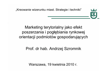 „Kreowanie wizerunku miast. Strategie i techniki” Marketing terytorialny jako efekt poszerzania i pogłębiania rynkowej orientacji podmiotów gospodarujących Prof. dr hab. Andrzej Szromnik Warszawa, 19 kwietnia 2010 r. Plan wystąpienia 1) Marketing terytorialny – definicje 2) Marketing terytorialny – podmioty i przepływy zasobów 3) Makroekonomiczne czynniki rozwoju marketingu terytorialnego 4) Model jedenastu rynków miast i regionów 5) Narzędzia marketingowe, ogólny cel i szczegółowe cele marketingu terytorialnego 6) Wzajemne powiązania marketingu jednostek osadniczych 7) Podmioty marketingu terytorialnego 8) Etapy rozwoju marketingowego systemu myślenia i działania 9) Reguły marketingowej reorientacji miasta / regionu 10) Warunki – przejawy rozwoju miasta / regionu 11) Poznawanie klientów (mieszkańców, turystów, inwestorów) 12) Scenariusze rozwoju i upadku miasta / regionu MARKETING TERYTORIALNY to: – rynkowa koncepcja zarządzania miastem / regionem – miasto / region jako koncern, – zespół środków – narzędzi za pomocą których moŜna pozyskiwać czynniki rozwojowe dla miasta / regionu, – „filozofia” obsługi interesantów – najwaŜniejsza jest satysfakcja naszych klientów! PODMIOTY I PRZEPŁYWY ZASOBÓW W MARKETINGU TERYTORIALNYM strumień czynników rozwojowych Dobra materialne Rynki Klienci Nieruchomości Środki pienięŜne Mieszkańcy MIASTO rozpoznanie, kształtowanie, kreowanie, przewidywanie potrzeb oraz Ŝyczeń Turyści Inwestorzy Przedsiębiorcy promocja miast i regionów REGION strumień wartości – oferta terytorialna zgodna z potrzebami Technologie Usługobiorcy Dysponenci Informacje wiedza Właściciele zasobów Ludzie strumień czynników Źródło: opracowanie własne Kadry rozwojowych Zmiana opinii, postaw, sposobów zachowania się Decyzje przestrzenne: lokalizacje, podróŜe, przemieszczenia. MAKROEKONOMICZNE CZYNNIKI ROZWOJU MARKETINGU TERYTORIALNEGO ― wyodrębnienie i stabilizacja własności komunalnej, ― uznanie miast i regionów jako podmiotów rynku, ― rosnąca świadomość odrębności terytorialnej i związku mieszkańców ze swoim miastem / regionem, ― ograniczenie roli Państwa w zaspokojeniu potrzeb materialnych i duchowych społeczności lokalnych i regionalnych, ― wzrost konkurencji miast i regionów w dostępie do deficytowych czynników ich rozwoju, ― rozwój systemu samorządowego zarządzania w miastach i regionach (demokracji lokalnej i regionalnej). Model 11-stu rynków Potencjalny rynek wysokokwalifikowanych pracowników miast i regionów Rynek dostawców technologii Rynek wpływowych instytucji Rynek mieszkańców Rynek instytucji oraz przedsiębiorstw lokalnych Rynek inwestorów zewnętrznych Rynek pracowników oraz działaczy samorządowych Rynek usługobiorców zewnętrznych Rynek zewnętrznych dostawców dóbr i usług Rynek turystów Rynek migrantów Środki – narzędzia marketingowe wg. Ph. Kotlera (i innych) (model „ILIA”) • Infrastruktura – techniczna, ekonomiczna, społeczna; • Ludzie – cechy, zwyczaje, tradycje; • Image i jakość Ŝycia (warunki Ŝycia); • Atrakcje: – środowiskowo-naturalne (przyrodnicze), – obiekty dziedzictwa kulturowego (kultury materialnej), – osoby i zespoły (grupy społeczne), – ekspozycje i pokazy, – imprezy, wydarzenia, przedsięwzięcia (events), – legendy i opowiadania, – inscenizacje historyczne. Ogólny cel marketingu terytorialnego wg. H.Mefferta Celem marketingu terytorialnego jest wpływanie na opinie, postawy i sposoby zachowania się „zewnętrznych” i „wewnętrznych” grup zainteresowanych klientów poprzez kształtowanie właściwego zestawu środków oraz instrumentów stymulowania kontaktów wymiennych Podobnie jak w przypadku klasycznego marketingu, jest to kwestia „CO, KTO, KOMU OFERUJE?” Priorytetowe cele szczegółowe marketingu terytorialnego ―spójność (i zgodność), ―koordynacja, ―integracja. Wzajemne powiązania marketingu jednostek osadniczych KRAJ •UNIFIKACJA Województwo •KOORDYNACJA •INTEGRACJA Powiat marketing ogólnokrajowy marketing województwa – regionu lub ich grup (związku) marketing powiatu – rejonu lub grupy powiatów Gmina / Miasto / Wieś marketing miasta - wsi STRUKTURA MARKETINGU JEDNOSTKI TERYTORIALNEJ – marketing własny a inne elementy składowe Podmioty marketingu terytorialnego • Obszary specjalne Jednostki osadnicze (jednostki przestrzenno-administracyjne, funkcjonalne oraz urbanistyczne) • obszary ekonomicznie, wieś – gmina lub (sołectwo, kolonia), • parki technologiczne, • strefy przemysłowe, • euroregiony, • parki narodowe i rezerwaty, • parki krajobrazowe, • wspólnoty etniczne, • obszary historyczne. jej część • zespół, stowarzyszenie wiejskich, gmin • miasto-gmina lub jego część (dzielnica, osiedle, jednostka urbanistyczna), • powiaty – rejony oraz ich zespoły, • województwa – regiony oraz ich zespoły (makroregiony, krainy). uprzywilejowane ETAPY ROZWOJU MARKETINGOWEGO SYSTEMU MYŚLENIA I DZIAŁANIA I Orientacja administracyjno - biurokratyczna II Orientacja obsługowa III Orientacja promocyjna IV Orientacja marketingowa V Orientacja społeczna, humanistyczna, ekologiczna REGUŁY MARKETINGOWEJ REORIENTACJI MIASTA/REGIONU (dedykacja dla wójta, burmistrza, prezydenta, starosty, marszałka i innych ) 1. Opanuj wiedzę współczesnego menedŜera – w tym marketing, ucz się; 2. Edukuj wszystkich swoich współpracowników; 3. Poznaj swoich „klientów” wewnętrznych i zewnętrznych; 4. Stwórz atmosferę i warunki przyjaznej instytucji (biura, urzędu); 5. Wprowadź normy jakości obsługi „klientów-interesantów”; 6. Ustal listę unikalnych zasobów własnego miasta (gminy) / regionu; 7. Opracuj unikalne oferty dla najwaŜniejszych „klientów-interesantów”; 8. Ogranicz bariery wejścia – społeczne, ekonomiczne, socjalne (lokalizacji, przyjazdu, pobytu); 9. Akcentuj sukce