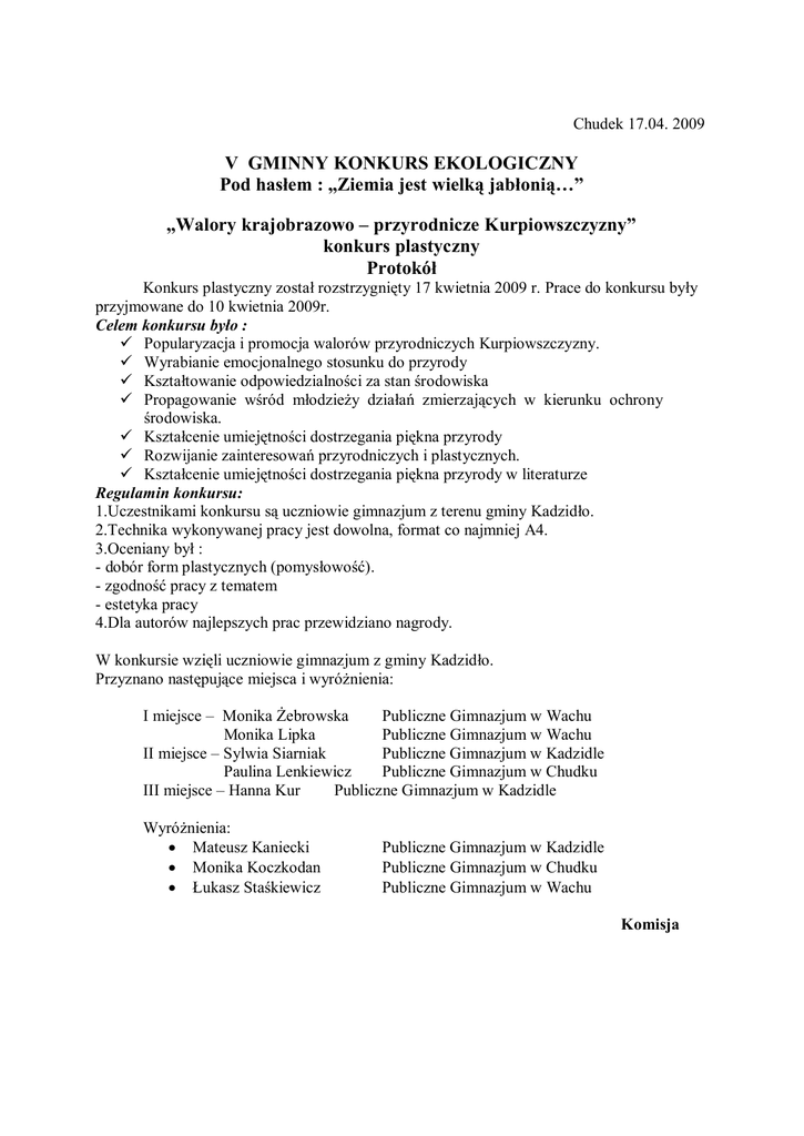 Chudek 17.04. 2009 V GMINNY KONKURS EKOLOGICZNY Pod has em : „Ziemia jest wielk jab oni …” „Walory krajobrazowo – przyrodnicze Kurpiowszczyzny” konkurs plastyczny Protokó Konkurs plastyczny zosta rozstrzygni ty 17 kwietnia 2009 r. Prace do konkursu by y przyjmowane do 10 kwietnia 2009r. Celem konkursu by o : Popularyzacja i promocja walorów przyrodniczych Kurpiowszczyzny. Wyrabianie emocjonalnego stosunku do przyrody Kszta towanie odpowiedzialno ci za stan rodowiska Propagowanie w ród m odzie y dzia zmierzaj cych w kierunku ochrony rodowiska. Kszta cenie umiej tno ci dostrzegania pi kna przyrody Rozwijanie zainteresowa przyrodniczych i plastycznych. Kszta cenie umiej tno ci dostrzegania pi kna przyrody w literaturze Regulamin konkursu: 1.Uczestnikami konkursu s uczniowie gimnazjum z terenu gminy Kadzid o. 2.Technika wykonywanej pracy jest dowolna, format co najmniej A4. 3.Oceniany by : - dobór form plastycznych (pomys owo ). - zgodno pracy z tematem - estetyka pracy 4.Dla autorów najlepszych prac przewidziano nagrody. W konkursie wzi li uczniowie gimnazjum z gminy Kadzid o. Przyznano nast puj ce miejsca i wyró nienia: I miejsce – Monika ebrowska Publiczne Gimnazjum w Wachu Monika Lipka Publiczne Gimnazjum w Wachu II miejsce – Sylwia Siarniak Publiczne Gimnazjum w Kadzidle Paulina Lenkiewicz Publiczne Gimnazjum w Chudku III miejsce – Hanna Kur Publiczne Gimnazjum w Kadzidle Wyró nienia: Mateusz Kaniecki Monika Koczkodan ukasz Sta kiewicz Publiczne Gimnazjum w Kadzidle Publiczne Gimnazjum w Chudku Publiczne Gimnazjum w Wachu Komisja Chudek 28.04. 2009 V GMINNY KONKURS EKOLOGICZNY Pod has em : „Ziemia jest wielk jab oni …” Protokó z konkursu wiedzowego Konkurs wiedzowy odby si 28 kwietnia 2009 r. Wzi y w nim udzia dru yny uczniów z: Publicznego Gimnazjum w Kadzidle, Publicznego Gimnazjum w Dylewie, Publicznego gimnazjum w Wachu i Publicznego Gimnazjum w Chudku. Celem konkursu by o : Wyrabianie emocjonalnego stosunku do przyrody Kszta towanie odpowiedzialno ci za stan rodowiska Propagowanie w ród m odzie y dzia zmierzaj cych w kierunku ochrony rodowiska. Rozwijanie zainteresowa przyrodniczych. Kszta cenie umiej tno ci dostrzegania pi kna przyrody Popularyzacja i promocja walorów przyrodniczych Kurpiowszczyzny. Regulamin konkursu: 1. W konkursie uczestnicz czteroosobowe dru yny zg oszone do konkursu w wyznaczonym terminie. 2. Ka da dru yna wyznacza kapitana, który udziela odpowiedzi lub wyznacza osob do jej udzielenia. 3. Konkurs odbywa si w nast puj cych etapach: 1) Dru yny odpowiadaj na 10 pyta typu „prawda – fa sz” .Za ka prawid ow odpowied dru yna uzyskuje 1 punkt.(W sumie w tym etapie mo na zdoby maksymalnie 10 punktów). 2) Dru yny odpowiadaj na 10 wylosowanych pyta testowych. Za ka prawid ow odpowied uzyskuj po 1 punkcie. (W sumie w tym etapie mo na zdoby maksymalnie 10 punktów). 3) Dru yny przygotowuj i prezentuj krótk pisemn wypowied na temat „Wymie jak najwi cej walorów przyrodniczo – krajobrazowych Kurpiowszczyzny, które mog yby zach ci turystów do pobytu w tym regionie”. Za ka dy wymieniony walor komisja przyznaje 1 punkt. 4) Dru yny odpowiadaj na 4 wylosowane pytania za 2 punkty (ka dy uczestnik odpowiada na jedno pytanie). Za ka pe odpowied uzyskuj po 2 punkty, za udzielenie niepe nej odpowiedzi przyznaje si po 1 punkcie. Dodatkowo po udzieleniu pe nej lub cz ciowej odpowiedzi – uzyskaniu 2 lub 1 punktu – dru yna mo e strzela do bramki unihokejowej i zdoby dodatkowo 1 punkt. W przypadku gdy strza jest niecelny, dru yna traci 1 uzyskany podczas odpowiedzi punkt. (W sumie w tym etapie mo na zdoby maksymalnie 12 punktów). 5) Dru yny uzupe niaj o nazwy zwierz t fragmenty wierszy ksi dza Jana Twardowskiego. Losuj po 3 pytania z trzema lukami. Za ka poprawn nazw uzyskuj 1 punkt. (W sumie w tym etapie mo na zdoby maksymalnie 9 punktów). 4. Nad prawid owym przebiegiem konkursu czuwa powo ana przez organizatorów komisja. 5. Kolejne miejsca w dru ynowym konkursie wiedzowym przyznaje si na podstawie sumy uzyskanych przez dru yny punktów. Je li dojdzie do remisu, przeprowadzona zostanie dogrywka, w której kapitanowie b odpowiada na pytania zamkni te. Przyznano nast puj ce miejsca: I miejsce – Publiczne Gimnazjum w Kadzidle Publiczne Gimnazjum w Dylewie II miejsce – Publiczne Gimnazjum w Chudku III miejsce – Publiczne Gimnazjum w Kadzidle Publiczne Gimnazjum w Wachu IV miejsce – Publiczne Gimnazjum w Dylewie Komisja: