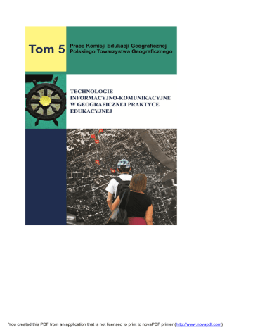 You created this PDF from an application that is not licensed to print to novaPDF printer (http://www.novapdf.com) You created this PDF from an application that is not licensed to print to novaPDF printer (http://www.novapdf.com) EO C GR. LONI PO A G SOC PRACE KOMISJI EDUKACJI GEOGRAFICZNEJ POLSKIEGO TOWARZYSTWA GEOGRAFICZNEGO Tom 5 TECHNOLOGIE INFORMACYJNO-KOMUNIKACYJNE W GEOGRAFICZNEJ PRAKTYCE EDUKACYJNEJ Łódź 2015 You created this PDF from an application that is not licensed to print to novaPDF printer (http://www.novapdf.com) You created this PDF from an application that is not licensed to print to novaPDF printer (http://www.novapdf.com) EO C GR. LONI PO A G SOC WORKSOF GEOGRAPHICAL EDUCATION COMMISSION POLISH GEOGRAPHICAL SOCIETY Volume 5 INFORMATION AND COMMUNICATIONS TECHNOLOGIES IN GEOGRAPHICAL EDUCATION PRACTICE Łódź 2015 You created this PDF from an application that is not licensed to print to novaPDF printer (http://www.novapdf.com) dr Rafał Kroczak, prof. dr hab. Wiesław Maik, prof. dr hab. Tadeusz Palmowski, dr Mariola Tracz, dr Paweł Wojtanowicz Adam Hibszer, Elżbieta Szkurłat Joanna Angiel, Maria Groenwald, Adam Hibszer, David Lambert, Marten Lößner, Wiktor Osuch, Iwona Piotrowska, Sławomir Piskorz, Florian Plit, Zbigniew Podgórski, Zdenek Szczyrba, Elżbieta Szkurłat, Anke Uhlenwinkel, Bożena Wójtowicz Anna Araszkiewicz Anna Wosiak Paweł Kramarz Marek Angiel You created this PDF from an application that is not licensed to print to novaPDF printer (http://www.novapdf.com) SPIS TREŚCI Wstęp ………………………………………………………………………………. 7 Introduction ………………………………………………………………………… 9 Część I TIK – ZAŁOŻENI A, DYSK USJA, OCENA ……………………………………. 11 Par t 1 I CT – ASSUM PTIONS, DISCUSSION, ASSESSM ENT ………………………. 11 Joanna ANGIEL Szkice myślowe jako obrazy struktury myśli – ich wykorzystanie w edukacji geograficznej …………………………………………………………………… 13 Sketches of thought as images the structures of thought – their use in geographical education ……………………………………………………… 27 Anna KOT Racjonalności edukacyjne uczestników kształcenia metodą e-learningu zbiorowe studium przypadku studentów i ich nauczycieli akademickich ……… 29 Educational rationales of the e-learning participants collective case study of students and their teachers ……………………………………………….….. 41 Florian PLIT Czy pierwszeństwo formy nad treścią w nauczaniu geografii? ………………… 43 Is form more important than content in teaching of geography? ………………. 53 Elżbieta SZKURŁAT E-learning w geograficznym kształceniu akademickim – szanse, wyzwania, 55 zagrożenia ………………………………………………………………………. E-learning in the geographical academic education – opportunities, challenges, threats …………………………………………………………………………... 71 Arkadiusz GŁOWACZ Teoretyczne i praktyczne aspekty wykorzystania GIS w szkolnej edukacji geograficznej …………………………………………………………………… 73 Theoretic and practical aspects of GIS use in school geography education …… 87 Marta SAMULOWSKA, Edyta WYKA Nauczanie z wykorzystaniem narzędzi GIS – przykłady rozwijania umiejętności analizowania informacji przestrzennych ………………………… 89 Teaching using GIS tools – examples of ways to develop skills to analyse spatial information ……………………………………………………………… 104 You created this PDF from an application that is not licensed to print to novaPDF printer (http://www.novapdf.com) Część II TIK – DOBRE PRAK TYK I EDUK ACYJNE …………………………………… Par t 2 I CT – BEST PRACTI CE IN EDUCATION …………………………………….. Wiktor OSUCH, Remigiusz PACYNA Multimedialny geograficzny atlas świata – walory i funkcje edukacyjne ……… Multimedia geographic atlas of the world – educational values and functions … Katarzyna KOWALSKA Przykłady zastosowania nowoczesnych technologii w nauczaniu-uczeniu się przyrody i geografii …………………………………………………………….. Opportunities and threats of the use of modern technology in teaching science and geography ………………………………………………………………….. Mirosław MULARCZYK Zajęcia e-learningowe w geografii – refleksje na przykładzie projektu „Świętokrzyski System Wspierania Talentów – Fascynujący Świat Nauki” ….. E-learning courses in geography – afterthoughts on the example of „Świętokrzyski Talent Support System – Fascinating Science World” ……….. Małgorzata PIETRZAK Chmura edukacyjna w praktyce akademickiej ………………………………… A cloud of academic education in practice …………………………………….. Katarzyna DACY-IGNATIUK Platforma edukacyjna Edmodo w praktyce szkolnej …………………………... Learning platform Edmodo in school practice …………………………………. Małgorzata KOPEK Gamifikacja jako metoda efektywnego nauczania-uczenia się geografii ……… Gamification as a method of effective teaching in geography …………………. Wojciech KOMAN Technologie informacyjno-komunikacyjne w pracy nauczycieli geografii i przyrody – wnioski i spostrzeżenia …………………………………………… Information-communicative technologies in geography and nature teacher’ s job – conclusions and observation ……………………………………………… Afiliacje …………………………………………………………………………….. 105 105 107 120 