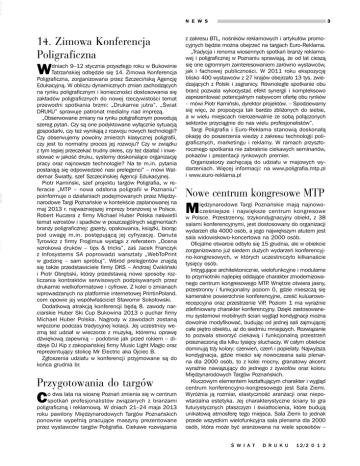 3 N E W S 14. Zimowa Konferencja Poligraficzna W dniach 9–12 stycznia przyszłego roku w Bukowinie Tatrzańskiej odbędzie się 14. Zimowa Konferencja Poligraficzna, zorganizowana przez Szczecińską Agencję Edukacyjną. W obliczu dynamicznych zmian zachodzących na rynku poligraficznym i konieczności dostosowania się zakładów poligraficznych do nowej rzeczywistości temat przewodni spotkania brzmi: „Drukarnie jutra”. „Świat DRUKU” sprawuje patronat medialny nad imprezą. „Obserwowane zmiany na rynku poligraficznym powodują szereg pytań. Czy są one podyktowane wyłącznie sytuacją gospodarki, czy też wynikają z rozwoju nowych technologii? Czy obserwujemy powolny zmierzch klasycznej poligrafii, czy jest to normalny proces jej rozwoju? Czy w związku z tym lepiej przeczekać trudny okres, czy też działać i inwestować w jakość druku, systemy doskonalące organizację pracy oraz najnowsze technologie? Na te m.in. pytania postarają się odpowiedzieć nasi prelegenci” – mówi Waldemar Światły, szef Szczecińskiej Agencji Edukacyjnej. Piotr Kamiński, szef projektu targów Poligrafia, w referacie „MTP – nowa odsłona poligrafii w Poznaniu” poinformuje o działaniach podejmowanych przez Międzynarodowe Targi Poznańskie w kontekście zaplanowanej na maj 2013 r. najważniejszej imprezy branżowej w Polsce. Robert Kuczera z firmy Michael Huber Polska naświetli temat wzrostów i spadków w poszczególnych segmentach branży poligraficznej: gazety, opakowania, książki, biorąc pod uwagę m.in. postępującą jej cyfryzację. Danuta Tyrowicz z firmy Frogimus wystąpi z referatem „Ocena wzrokowa druków – tips & tricks”, zaś Jacek Franczyk z Infosystems SA poprowadzi warsztaty „WebToPrint w godzinę – sam spróbuj”. Wśród prelegentów znajdą się także przedstawiciele firmy DKS – Andrzej Ćwikliński i Piotr Obrębski, którzy przedstawią nowe sposoby rozliczania kontraktów serwisowych podpisywanych przez drukarnie wielkoformatowe i cyfrowe. Z kolei o zmianach wprowadzanych na platformie internetowej PrintinPoland. com opowie jej współwłaściciel Sławomir Sokołowski. Dodatkową atrakcją konferencji będą 8. zawody narciarskie Huber Ski Cup Bukowina 2013 o puchar firmy Michael Huber Polska. Nagrody w zawodach zostaną wręczone podczas tradycyjnej kolacji. Jej uczestnicy wezmą też udział w wieczorze z muzyką, któremu oprawę dźwiękową zapewnią – podobnie jak przed rokiem – didżeje DJ Kip z zakopiańskiej firmy Music Light Magic oraz reprezentujący stolicę Mr Electric aka Ojciec B. Zgłoszenia udziału w konferencji przyjmowane są do końca grudnia br. Przygotowania do targów C o dwa lata na wiosnę Poznań zmienia się w centrum spotkań profesjonalistów związanych z branżami poligraficzną i reklamową. W dniach 21–24 maja 2013 roku pawilony Międzynarodowych Targów Poznańskich ponownie wypełnią pracujące maszyny prezentowane przez wystawców targów Poligrafia. Ciekawe rozwiązania z zakresu BTL, nośników reklamowych i artykułów promocyjnych będzie można obejrzeć na targach Euro-Reklama. „Tradycja i renoma wiosennych spotkań branży reklamowej i poligraficznej w Poznaniu sprawiają, że od lat cieszą się one ogromnym zainteresowaniem zarówno wystawców, jak i fachowej publiczności. W 2011 roku ekspozycję blisko 400 wystawców z 27 krajów obejrzało 13 tys. zwiedzających z Polski i zagranicy. Równoległe spotkanie obu branż pozwala wykorzystać efekt synergii i kompleksowo zaprezentować potencjalnym nabywcom ofertę obu rynków – mówi Piotr Kamiński, dyrektor projektów. – Spodziewamy się więc, że propozycja tak bardzo zbliżonych do siebie, a w wielu miejscach nierozerwalnie ze sobą połączonych sektorów przyciągnie do nas wielu profesjonalistów”. Targi Poligrafia i Euro-Reklama stanowią doskonałą okazję do poszerzenia wiedzy z zakresu technologii poligraficznych, marketingu i reklamy. W ramach przyszłorocznego spotkania nie zabraknie ciekawych seminariów, pokazów i prezentacji rynkowych premier. Organizatorzy zachęcają do udziału w majowych wydarzeniach. Więcej informacji: na www.poligrafia.mtp.pl i www.euro-reklama.pl Nowe centrum kongresowe MTP M iędzynarodowe Targi Poznańskie mają najnowocześniejsze i największe centrum kongresowe w Polsce. Przestrzenny, trzykondygnacyjny obiekt, z 38 salami konferencyjnymi, jest dostosowany do organizacji wydarzeń dla 4000 osób, a jego największym atutem jest sala widowiskowo-koncertowa na 2000 osób. Oficjalne otwarcie odbyło się 15 grudnia, ale w obiekcie zorganizowano już siedem dużych wydarzeń konferencyjno-kongresowych, w których uczestniczyło kilkanaście tysięcy osób. Intrygujące architektonicznie, wielofunkcyjne i modularne to przymiotniki najlepiej oddające charakter zmodernizowanego centrum kongresowego MTP. Wnętrze otwiera jasny, przestronny i funkcjonalny poziom 0, gdzie mieszczą się kameralne powierzchnie konferencyjne, cześć kuluaroworecepcyjna oraz przestrzenie VIP. Poziom 1 ma wyraźnie zdefiniowany charakter konferencyjny. Dzięki zastosowanemu systemowi mobilnych ścian wygląd kondygnacji można dowolnie modyfikować, budując od jednej sali zajmującej całe piętro obiektu, aż do siedmiu mniejszych. Rozwiązanie to pozwala stworzyć ciekawą i funkcjonalną przestrzeń przeznaczoną dla kilku tysięcy słuchaczy. W całym obiekcie dominują trzy kolory: czerwień, czerń i popielaty. Najwyższa kondygnacja, gdzie mieści się nowoczesna sala plenarna dla 2000 osób, to z kolei mocny, granatowy akcent wyraźnie nawiązujący do jednego z żywiołów oraz koloru Międzynarodowych Targów Poznańskich. Kluczowym elementem kształtującym charakter i wygląd centrum konferencyjno-kongresowego jest Sala Ziemi. Wyróżnia ją rozmiar, elastyczność aranżacji oraz niepowtarzalna estetyka. Jej charakterystyczne ściany to gra futurystycznych płaszczyzn i światłocienia, któ