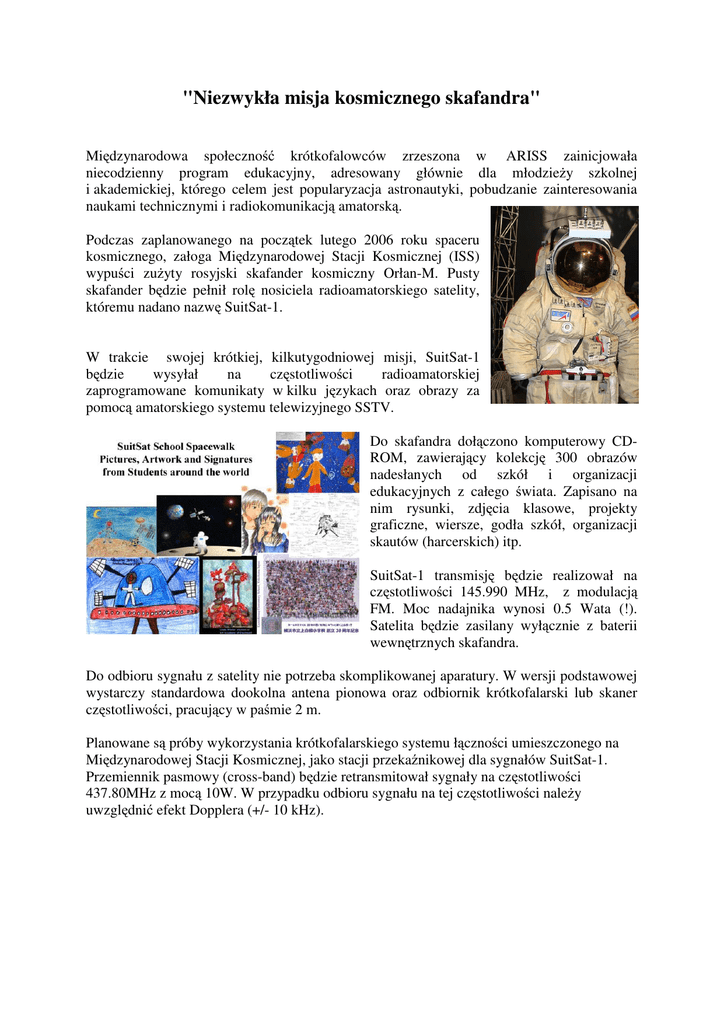 "Niezwykła misja kosmicznego skafandra" Międzynarodowa społeczność krótkofalowców zrzeszona w ARISS zainicjowała niecodzienny program edukacyjny, adresowany głównie dla młodzieży szkolnej i akademickiej, którego celem jest popularyzacja astronautyki, pobudzanie zainteresowania naukami technicznymi i radiokomunikacją amatorską. Podczas zaplanowanego na początek lutego 2006 roku spaceru kosmicznego, załoga Międzynarodowej Stacji Kosmicznej (ISS) wypuści zużyty rosyjski skafander kosmiczny Orłan-M. Pusty skafander będzie pełnił rolę nosiciela radioamatorskiego satelity, któremu nadano nazwę SuitSat-1. W trakcie swojej krótkiej, kilkutygodniowej misji, SuitSat-1 będzie wysyłał na częstotliwości radioamatorskiej zaprogramowane komunikaty w kilku językach oraz obrazy za pomocą amatorskiego systemu telewizyjnego SSTV. Do skafandra dołączono komputerowy CDROM, zawierający kolekcję 300 obrazów nadesłanych od szkół i organizacji edukacyjnych z całego świata. Zapisano na nim rysunki, zdjęcia klasowe, projekty graficzne, wiersze, godła szkół, organizacji skautów (harcerskich) itp. SuitSat-1 transmisję będzie realizował na częstotliwości 145.990 MHz, z modulacją FM. Moc nadajnika wynosi 0.5 Wata (!). Satelita będzie zasilany wyłącznie z baterii wewnętrznych skafandra. Do odbioru sygnału z satelity nie potrzeba skomplikowanej aparatury. W wersji podstawowej wystarczy standardowa dookolna antena pionowa oraz odbiornik krótkofalarski lub skaner częstotliwości, pracujący w paśmie 2 m. Planowane są próby wykorzystania krótkofalarskiego systemu łączności umieszczonego na Międzynarodowej Stacji Kosmicznej, jako stacji przekaźnikowej dla sygnałów SuitSat-1. Przemiennik pasmowy (cross-band) będzie retransmitował sygnały na częstotliwości 437.80MHz z mocą 10W. W przypadku odbioru sygnału na tej częstotliwości należy uwzględnić efekt Dopplera (+/- 10 kHz). Dla prostych modelów radiostacji należy odpowiednio zaprogramować kanały w paśmie 70 cm.. Przykładowe rozwiązanie: Pamięć (nr kanału) Kanał A Kanał B Kanał C Kanał D Kanał E częstotliwości odbioru 438.810 MHz 438.805 MHz 438.800 MHz 438.795 MHz 438.790 MHz Dla pasma 2m efekt Dopplera występuje w mniejszy stopniu więc można nasłuchiwać wyłącznie na jednym kanale (145.990 MHz). Do śledzenia trajektorii satelity SuitSat-1 oraz wyznaczania użytecznego dla obserwatora czasu przelotu, należy użyć odpowiednich programów komputerowych służących do precyzyjnego wyznaczenie przelotów, np. darmowego programu Orbitron, do ściągnięcia ze strony: http://www.stoff.pl lub wykorzystać internetowe programy śledzące np.: http://science.nasa.gov/Realtime/jtrack/, http://www.issfanclub.com/modules.php?name=Tracking. Jako obiekt do śledzenia należy wybrać Międzynarodową Stację Kosmiczną (ISS), ponieważ SuitSat-1 będzie poruszał się na zbliżonej orbicie. Uczniowie, nauczyciele, studenci, harcerze, krótkofalowcy oraz wszyscy zainteresowani nietypową misją kosmicznego skafandra, mogą: nasłuchiwać wysyłane komunikaty, monitorować funkcje satelity oraz oglądać wysyłane obrazy. Dla zainteresowanych osób, które potwierdzą odebranie komunikatów oraz pamiątkowych obrazków, organizacja ARISS przygotowała specjalny certyfikat. Dla najbardziej wytrwałych nasłuchowców przygotowano specjalny dyplom. Aby go zdobyć, należy odebrać dodatkowe wiadomości które zostały dołączone do wysyłanych komunikatów. Każdą dodatkową wiadomość nagrano w kilku językach: angielskim, francuskim, niemieckim, rosyjskim i japońskim. SuitSat-1 powstał przy współpracy NASA, RKA. Sfinansowały go regionalne oddziały ARISS i AMSAT. Pomysłodawcą projektu jest ARISS-Rosja, na czele której stoi Siergiej Samburow (RV3DR). Projekt koordynowali A. P. Aleksandrow i A. Poleszczuk z korporacji Energia, budującej elementy do pojazdów i rakiet kosmicznych. Konstrukcję satelity wspólnie realizowały zespoły amerykańskie i rosyjskie. Do budowy satelity wykorzystano powszechnie dostępne komercyjne komponenty, jak np. nadajnik Kenwood TH-K2. Polska Grupa Amatorskiej Łączności Kosmicznej zaprasza wszystkich kolegów krótkofalowców do udziału w tym wydarzeniu i promocji naszego hobby wśród młodzieży szkolnej, jako kroku w przygotowaniach szkół do udziału w łączności z astronautami na pokładzie ISS, w ramach edukacyjnego programu ARISS. Liczymy na wasze wsparcie. Krystian Górski SQ2KL [email protected] Andrzej Kotarski SP5ISS [email protected] PS. Raporty słyszalności SuiSat-1 można zgłaszać na specjalnej stronie www.suitsat.org INFORMACJE TECHNICZNE Odbiór obrazów Amatorski system telewizyjny SSTV do kodowania transmisji wykorzystuje podstawowe pasmo kanału FM. SuitSat-1 wykorzystuje standard SSTV typ "Robot 36" (transmisja obrazu trwa 36 sekund). Więcej informacji na stronach: 1. http://www.ultimatecharger.com/SSTV.html, 2. http://www.marexmg.org/spacecam/spacecam.html, Programy dekodujące SSTV 1. ChromaPix, .: http://www.barberdsp.com/, 2. W95SSTV Silicon Pixels: http://www.barberdsp.com/w95sstv/w95dload.htm, 3. MMSSTV: http://mmhamsoft.ham-radio.ch/, 4. MixW: http://www.mixw.net/. Telemetria skafandra Pomiar temperatury skafandra jest przekazywany do mikrokontrolera, który przekształca dane na komunikat głosowy. Podczas cyklicznych transmisji telemetrii wysyłane są następujące dane: 1. Czas misji, 2. Temperatura skafandra 3. Napięcie baterii Sekwencja nadawania wiadomości SuitSat-1 1. Głosowy identyfikator: "This is SuitSat-1 RS0RS!!" (5 sekund), 2. Międzynarodowa Wiadomość Głosowa, 3. Telemetria lub obraz SSTV (15-45 sekund), 4. 30 sekund przerwy, po której wiadomość jest powtarzana jeszcze raz. Sekwencja Międzynarodowej Wiadomości Głosowej 1. Telemetria głosowa, 2. Komunikat w j. rosyjskim, 3. Komunikat uczniów z Europy (w j. hiszpańskim lub j. niemieckim), 4. Komunikat Instytutu im. Baumana (w j