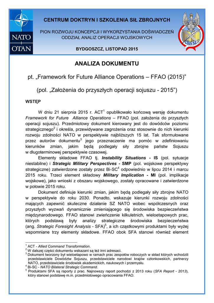 CENTRUM DOKTRYN I SZKOLENIA SIŁ ZBROJNYCH PION ROZWOJU KONCEPCJI I WYKORZYSTANIA DOŚWIADCZEŃ ODDZIAŁ ANALIZ OPERACJI WOJSKOWYCH BYDGOSZCZ, LISTOPAD 2015 ANALIZA DOKUMENTU pt. „Framework for Future Alliance Operations – FFAO (2015)” (pol. „Założenia do przyszłych operacji sojuszu - 2015”) WSTĘP W dniu 21 sierpnia 2015 r. ACT1 opublikowało końcową wersję dokumentu Framework for Future Alliance Operations – FFAO (pol. założenia do przyszłych operacji sojuszu). Przedmiotowy dokument kierowany jest do dowódców poziomu strategicznego2 i określa, przewidywane zagrożenia oraz stosownie do nich kierunki rozwoju zdolności NATO w perspektywie najbliższych 15 lat. Tak sformułowane przez autorów dokumentu3 jego przeznaczenie ma pomóc w zdefiniowaniu kierunków zmian, jakim będą podlegały siły zbrojne państw Sojuszu w długoterminowej perspektywie czasowej. Elementy składowe FFAO tj. Instability Situations - IS (pol. sytuacje niestabilne) i Strategic Military Perspectives - SMP (pol. wojskowe perspektywy strategiczne) zatwierdzone zostały przez Bi-SC4 odpowiednio w lipcu 2014 i marcu 2015 roku. Trzeci element składowy Military Implication - MI (pol. implikacje wojskowe), jako wnioski z obszaru wojskowego, zostały opracowane i zatwierdzone w połowie 2015 roku. Dokument definiuje kierunki zmian, jakim będą podlegały siły zbrojne NATO w perspektywie do roku 2030. Ponadto, wskazuje kierunki rozwoju zdolności mających zapewnić skuteczne działanie SZ NATO wobec współczesnych oraz przyszłych wyzwań dynamicznie zmieniającego się środowiska bezpieczeństwa międzynarodowego. FFAO stanowi zwieńczenie kilkuletnich, wieloetapowych prac, których podstawą były analizy strategiczne środowiska bezpieczeństwa (ang. Strategic Foresight Analysis - SFA)5, a ich cząstkowymi produktami były wyżej wspomniane trzy elementy składowe. FFAO obok SFA stanowi również element 1 ACT - Allied Command Transformation. W dalszej części dokumentu wskazani są też inni adresaci. 3 Dokument tworzony był wieloetapowo w ramach prac zespołów roboczych w skład których wchodzili przedstawiciele Dowództw Sojuszu, przedstawiciele narodowi krajów członkowskich, partnerzy NATO, przedstawiciele środowisk akademickich, naukowych i przemysłu. 4 Bi-SC - NATO Bilateral Strategic Command. 5 Produktami SFA są raporty z prac. Najnowszy raport pochodzi z 2013 roku (SFA Report - 2013), który stanowi podstawę m.in. przedmiotowego opracowania FFAO. 2 składowy procesu Long-Term Military Transformation - LTMT oraz wspiera proces planowania obronnego NATO (NDPP). Sytuacje niestabilne (IS) stanowią ogólny opis działań, przyszłych możliwych do zaistnienia wydarzeń, kryzysów lub konfliktów, w które możliwe jest wojskowe zaangażowanie NATO. Głównym celem IS jest nakreślenie prawdopodobnych kryzysów lub konfliktów, z którymi może zmierzyć się Sojusz do roku 2030. IS obejmuje zaangażowanie Sojuszu od działań na niskim poziomie (np. w usuwanie skutków klęsk żywiołowych i katastrof, powiązanych ze zmasowaną migracją) do wysokiego poziomu zaangażowania NATO związanego np. z zakończeniem konfliktów pomiędzy państwami6. Bi-SC zatwierdza IS jako narzędzie wykorzystywane do rozwoju Strategic Military Perspective. Wojskowe Perspektywy Strategiczne (SMP)7 to wyłaniające się punkty widzenia na poziomie strategicznym, które mogą wskazywać, w jaki sposób SZ NATO powinny realizować główne zadania w przyszłości. Celem SMP jest dostarczenie planistom długoterminowych kierunków, wytycznych i prognoz mających wpływ na rozwój SZ Sojuszu w przyszłości na poziomie strategicznym. W tym względzie intencją ACT jest wsparcie procesu planowania obronnego NATO, szczególnie etapu pierwszego - tworzenie wytycznych politycznych (ang. Political Guidance) i etapu drugiego - określenie wymagań (ang. Determining Requirements). Implikacje Wojskowe (MI) to potencjalne konsekwencje IS i SMP, które mogą wskazywać przyszłe zadania i misje dla NATO oraz sugerować, jak NATO musi zaadoptować sposoby realizacji obecnych zadań i misji w celu wsparcia „Koncepcji Strategicznej NATO”. Celem i przeznaczeniem MI jest przełożenie SMP na szczegóły poziomu operacyjnego i taktycznego w procesie planowania obronnego NATO. Zakres MI nie obejmie pełnej listy wszystkich możliwych scenariuszy zdarzeń, ale w opinii autorów dokumentu jest wystarczający do tego, aby planiści byli w stanie określić na ich podstawie wymagane zdolności dla SZ NATO. Sojusz rozwija implikacje wojskowe wewnątrz kategorii NDPP jako Hierarchię Zdolności (ang. Capability Hierarchy) siedmiu obszarów głównych8. Implikacje nie są definiowane jako specyficzne zdolności operacyjne, ale są wyrażone i opisane jako możliwości, które posłużą do zdefiniowania niezbędnych zdolności operacyjnych SZ Sojuszu. 6 Więcej patrz: pkt 2.3 Sytuacje niestabilne. Aktualnie większość członków NATO realizuje szeroko zakrojone projekty mające na celu analizę przyszłej sytuacji geopolitycznej, ekonomicznej, mogących wystąpić zagrożeń, prognozowanych zmian w środowisku bezpieczeństwa czy też bardziej szczegółowo zmian, które nastąpią w środowisku operacyjnym lub konkretnym środowisku walki (prowadzenie operacji lądowych, morskich czy powietrznych lub specjalnych) w perspektywie najbliższych 2-3 dekad (w niektórych przypadkach prace cykliczne od kilku lat). Przykładem może być Strategic Trends Programme prowadzony przez brytyjski odpowiednik CDiS SZ Development Concepts and Doctrine Centre - DCDC. W ramach tego programu wydana została już piąta edycja „Global Startegic Trends - Out to 2045” oraz „Future Operating Environment 2035”. W SZ RP analizę przedmiotowych dokumentów prowadziło CDiS SZ. 8 Implikacje wojskowe obejmują siedem obszarów głównych: przygotowanie sił NATO, przemieszczenie i tworzenie sił połączonych, prowadzenie działań i