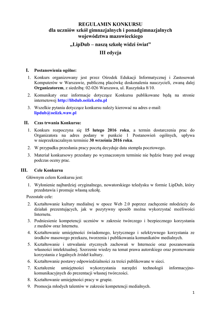REGULAMIN KONKURSU dla uczniów szkół gimnazjalnych i ponadgimnazjalnych województwa mazowieckiego „LipDub – naszą szkołę widzi świat” III edycja I. Postanowienia ogólne: 1. Konkurs organizowany jest przez Ośrodek Edukacji Informatycznej i Zastosowań Komputerów w Warszawie, publiczną placówkę doskonalenia nauczycieli, zwaną dalej Organizatorem, z siedzibą: 02-026 Warszawa, ul. Raszyńska 8/10. 2. Komunikaty oraz informacje dotyczące Konkursu publikowane będą na stronie internetowej http://libdub.oeiizk.edu.pl 3. Wszelkie pytania dotyczące konkursu należy kierować na adres e-mail: [email protected] II. Czas trwania Konkursu: 1. Konkurs rozpoczyna się 15 lutego 2016 roku, a termin dostarczenia prac do Organizatora na adres podany w punkcie 1 Postanowień ogólnych, upływa w nieprzekraczalnym terminie 30 września 2016 roku. 2. W przypadku przesłania pracy pocztą decyduje data stempla pocztowego. 3. Materiał konkursowy przesłany po wyznaczonym terminie nie będzie brany pod uwagę podczas oceny prac. III. Cele Konkursu Głównym celem Konkursu jest: 1. Wyłonienie najbardziej oryginalnego, nowatorskiego teledysku w formie LipDub, który przedstawia i promuje własną szkołę. Pozostałe cele: 2. Kształtowanie kultury medialnej w epoce Web 2.0 poprzez zachęcenie młodzieży do działań prezentujących, jak w pozytywny sposób można wykorzystać możliwości Internetu. 3. Podniesienie kompetencji uczniów w zakresie twórczego i bezpiecznego korzystania z mediów oraz Internetu. 4. Kształtowanie umiejętności świadomego, krytycznego i selektywnego korzystania ze środków masowego przekazu, tworzenia i publikowania komunikatów medialnych. 5. Kształtowanie i utrwalanie etycznych zachowań w Internecie oraz poszanowania własności intelektualnej. Szerzenie wiedzy na temat prawa autorskiego oraz promowanie korzystania z legalnych źródeł kultury. 6. Kształtowanie postawy odpowiedzialności za treści publikowane w sieci. 7. Kształcenie umiejętności wykorzystania narzędzi technologii informacyjnokomunikacyjnych do prezentacji własnej twórczości. 8. Kształtowanie umiejętności pracy w grupie. 9. Promocja młodych talentów w zakresie kompetencji medialnych. 1 IV. Zadanie konkursowe: 1. Zadanie dla uczestników Konkursu polega na przygotowaniu filmu (teledysku) w formie LipDuba, który będzie promować szkołę, służyć utrwalaniu pozytywnego jej wizerunku w społeczności lokalnej oraz upowszechniać jej osiągnięcia. 2. Uczestnicy Konkursu przygotowują jedną pracę konkursową, której czas projekcji nie przekracza 5 minut i nie jest krótszy niż 3 minuty. 3. Szkoła może zgłosić do Konkursu tylko jeden film. 4. Szczegółowe informacje o formie, jaką jest LipDub znajdują się na stronie Konkursu pod adresem: http://lipdub.oeiizk.edu.pl 5. Praca konkursowa powinna być zapisana na nośnikach pamięci zewnętrznych, np.: płycie DVD / pendrive / karcie SD, w formacie zgodnym z odtwarzaczem Windows Media Player, lub innymi, np. QuickTime lub iTunes. Akceptowane formaty pliku to avi, mov i mp4. 6. Uczestnicy mogą wykonać LipDuba za pomocą dowolnego urządzenia posiadającego funkcję nagrywania wideo. 7. Praca konkursowa nie może naruszać praw autorskich oraz prawa do prywatności osób trzecich. Prezentowane w niej treści nie mogą przedstawiać ani propagować zachowań zabronionych przez prawo lub godzących w zasady dobrego wychowania i kultury osobistej. 8. Utwór muzyczny wykorzystany w pracy konkursowej: a. może być własny i samodzielnie nagrany przez uczniów; b. wykorzystany za zgodą instytucji lub autora (-ów), którzy posiadają do niego autorskie prawa majątkowe; c. pozyskany z otwartych i darmowych zasobów muzycznych, d. udostępniony na zasadzie wolnych licencji (np. Creative Commons). 9. Można dostarczyć również prace wykonane przed terminem ogłoszenia Konkursu pod warunkiem, że spełniają wymagania zawarte w Regulaminie Konkursu. 10. Szkoła dostarczając dokumentację: pracę konkursową do Organizatora dołącza następującą a. formularz zgodny z Załącznikiem nr 4, który zawiera listę autorów pracy oraz oświadczenie podpisane przez Dyrektora Szkoły, że przesłana praca nie narusza praw osobistych ani majątkowych osób trzecich, w szczególności praw autorskich, praw pokrewnych, prawa do wizerunku, innych dóbr osobistych ani ich interesów chronionych przepisami prawa; b. oświadczenia autorów lub ich rodziców/prawnych opiekunów, wyrażających zgodę na przeniesienie na Organizatora autorskich praw majątkowych oraz na przetwarzanie danych osobowych (zgodnie z Załącznikami nr 3 i 3A); c. oświadczenia opiekuna grupy realizującej pracę konkursową, że posiada oświadczenia osób występujących w filmie lub ich rodziców/prawnych opiekunów na wykorzystanie wizerunku. V. Zasady uczestnictwa: 1. Konkurs skierowany jest do uczniów gimnazjów oraz szkół ponadgimnazjalnych w województwie mazowieckim i ma charakter zespołowy. 2 2. W tworzenie pracy konkursowej, oprócz uczniów, mogą być zaangażowani wyłącznie nauczyciele, instruktorzy lub rodzice uczniów. 3. Grupa uczniów wykonujących LipDuba musi posiadać opiekuna oficjalnie zgłoszonego przez szkołę. 4. Szkołę do konkursu może zgłosić wyłącznie Dyrektor szkoły. 5. Aby zgłosić szkołę do konkursu, należy pobrać ze strony http://lipdub.oeiizk.edu.pl formularz zgłoszeniowy (Załącznik nr 1), wypełnić go i wydrukować. Podstemplowany przez szkołę i podpisany przez Dyrektora szkoły formularz należy dostarczyć w terminie do 31 marca 2016 roku na adres Organizatora: Ośrodek Edukacji Informatycznej i Zastosowań Komputerów w Warszawie, ul. Raszyńska 8/10, 02-026 Warszawa, z dopiskiem na kopercie „Konkurs LipDub – zgłoszenie”. 6. W przypadku przesłania zgłoszenia pocztą za termin dostarczenia uznaje się datę wpływu przesyłki do Organizatora. 7. Zgłoszenie Szkoły na Konkurs uważa