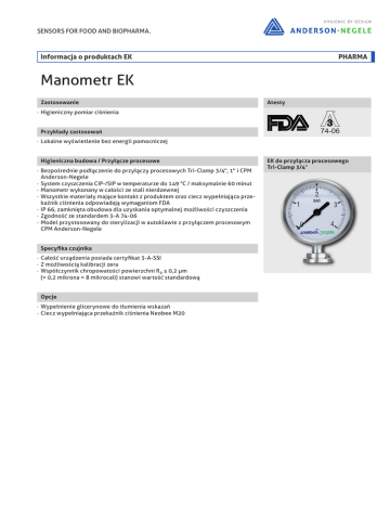 SENSORS FOR FOOD AND BIOPHARMA. Informacja o produktach EK PHARMA Manometr EK Zastosowanie Atesty ·· Higieniczny pomiar ciśnienia Przykłady zastosowań 74-06 ·· Lokalne wyświetlenie bez energii pomocniczej Higieniczna budowa / Przyłącze procesowe ·· Bezpośrednie podłączenie do przyłączy procesowych Tri-Clamp 3/4", 1" i CPM Anderson-Negele ·· System czyszczenia CIP-/SIP w temperaturze do 149 °C / maksymalnie 60 minut ·· Manometr wykonany w całości ze stali nierdzewnej ·· Wszystkie materiały mające kontakt z produktem oraz ciecz wypełniająca przekaźnik ciśnienia odpowiadają wymaganiom FDA ·· IP 66, zamknięta obudowa dla uzyskania optymalnej możliwości czyszczenia ·· Zgodność ze standardem 3-A 74-06 ·· Model przystosowany do sterylizacji w autoklawie z przyłączem procesowym CPM Anderson-Negele Specyfika czujnika ·· Całość urządzenia posiada certyfikat 3-A-SSI ·· Z możliwością kalibracji zera ·· Współczynnik chropowatości powierzchni Ra ≤ 0,2 μm (= 0,2 mikrona = 8 mikrocali) stanowi wartość standardową Opcje ·· Wypełnienie glicerynowe do tłumienia wskazań ·· Ciecz wypełniająca przekaźnik ciśnienia Neobee M20 EK do przyłącza procesowego Tri-Clamp 3/4" Dane techniczne PHARMA Dane techniczne Materiał Membrana Przyłącze procesowe Rurka Bourdona Mechanizm pomiarowy Obudowa Wziernik Wypełnienie obudowy Ciecz przekazująca ciśnienie Numer atestu FDA Opcjonalnie 1.4404 (316L) Ra ≤ 0,2 μm (0,2 mikrona, 8 mikrocali) 1.4404 (316L) 1.4301 (304) 1.4301 (304) 1.4301 (304) Poliwęglan / Lexan (standard) Polisulfon (model do sterylizacji w autoklawie) Gliceryna (opcja) biały olej medyczny 21 CFR 172.878 i 21 CFR 178.3620(a) Neobee M20 Gliceryna (w 100 % spełnia wymagania USP) Stopień ochrony IP 66 / NEMA 4X Wytrzymałość na nadciśnienie co najmniej 25 % wartości krańcowej Dokładność Dokładność pomiaru Odtwarzalność Liniowość Histereza ±1,5 % od wartości krańcowej * ±0,5 % od wartości krańcowej ±0,5 % od wartości krańcowej ±0,5 % od wartości krańcowej Temperatura Proces -3 °C...140 °C (25 °F...284 °F) Możliwość sterylizacji w autoklawie w temperaturze 149 °C (300 °F) przez 60 minut z przyłączem procesowym CPM i obudową bez wypełnienia 149 °C (300 °F) / maksymalnie 60 minut 4 °C...49 °C (40 °F...120 °F) spowolniona reakcja w niskich temperaturach System czyszczenia CIP-/SIP Otoczenie Efekt temperaturowy Dryft temperaturowy < 0,035 bar (0,5 PSI) pro 5,5 °C (10 °F) zmiana Temperatury procesu i temperatury otoczenia w zakresie 10...90 % < ±0,01 % /K od wartości krańcowej Proces i otoczenie Waga 140 g...390 g (w zależności od podłączenia procesowego i wypełnienia) Standardy Konstrukcja i produkcja zgodna z artykułem 3.3 dyrektywy o urządzeniach ciśnieniowych 98/23/EG CSA B51-03 CRN# CSA0F9754.5C *) w przedziale 10...90 % zakresu ciśnienia 2 Rysunki wymiarowe PHARMA EK z przyłączem procesowym Tri-Clamp 3/4" EK z przyłączem procesowym Tri-Clamp 1" bądź 1½" Ø 24,8 mm (0,97") Zatyczki do wypełnienia 4,2 mm (0,16") 81 mm (3.20") 81 mm (3.20") 3 Ø 50,5 mm (1" / 1,5") Ø 25 mm (3/4") Opcja Przyłącze z lewej strony (5) / z prawej strony (6) 5 6 Warunki dla punktu pomiaru według standardu 3-A 74-06 ·· Manometry EK są seryjnie zgodne ze standardem 3-A . ·· Czujniki są przystosowane do czyszczenia CIP/SIP. Maksymalnie 149°C / 60 minut. ·· Tylko w połączeniu z przyłączem procesowym zgodnym ze standardem 3-A . ·· Pozycja montażowa: Należy przestrzegać odpowiednich instrukcji według obowiązującego standardu 3-A dla pozycji montażowej i samoczynnego opróżniania oraz dla pozycji otworu przeciekowego. Informacja o produktach EK PHARMA Oznaczenie zamówienia EK (Średnica obudowy 63 mm, wraz z certyfikatem materiałowym) Zakres pomiarowy PSI 029 (30 "Hg/0...30) 031 (30 "Hg/0...60) 066 (0...30) 069 (0...60) 071 (0...100) 074 (0...160) Zakres pomiarowy BAR (-1,0...2,0) 055 056 (-1,0...4,0) (-1,0...6,0) 475 057 (0...2,0) 192 (0...4,0) 309 (0...7,0) 337 (0...11,0) 063 (0...15,0) 01 Stała wartość Kierunek podłączenia 1 (dół) 5 (lewa strona) 6 (prawa strona) Przyłącze procesowe 002 (Tri-Clamp 3/4") 003 (Tri-Clamp 1") 123 (CPM - z możliwością sterylizacji w autoklawie) 161 (Mini CPM) Ciecz przekazująca ciśnienie 1 (biały olej medyczny) 5 (Neobee M20) Tłumienie / Wypełnienie obudowy 1 (brak, obudowa bez wypełnienia) 2 (obudowa wypełniona gliceryną, nie dla kierunku podłączenia „5” i „6”) 3 (obudowa wentylowana, bez wypełnienia, Standard z przyłączem procesowe CPM „123”) EK 055 01 1 002 1 1 50063 / 2.0 / 2015-11-11 / MU / EU NEGELE MESSTECHNIK GMBH Raiffeisenweg 7 87743 Egg an der Guenz Phone +49 (0) 83 33 . 92 04 - 0 Fax +49 (0) 83 33 . 92 04 - 49 [email protected] Tech. Support: [email protected] Phone +49 (0) 83 33 . 92 04 - 720 4