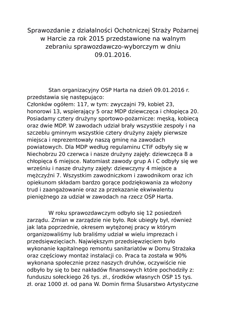 Sprawozdanie z działalności Ochotniczej Straży Pożarnej w Harcie za rok 2015 przedstawione na walnym zebraniu sprawozdawczo-wyborczym w dniu 09.01.2016. Stan organizacyjny OSP Harta na dzień 09.01.2016 r. przedstawia się następująco: Członków ogółem: 117, w tym: zwyczajni 79, kobiet 23, honorowi 13, wspierający 5 oraz MDP dziewczęca i chłopięca 20. Posiadamy cztery drużyny sportowo-pożarnicze: męską, kobiecą oraz dwie MDP. W zawodach udział brały wszystkie zespoły i na szczeblu gminnym wszystkie cztery drużyny zajęły pierwsze miejsca i reprezentowały naszą gminę na zawodach powiatowych. Dla MDP według regulaminu CTiF odbyły się w Niechobrzu 20 czerwca i nasze drużyny zajęły: dziewczęca 8 a chłopięca 6 miejsce. Natomiast zawody grup A i C odbyły się we wrześniu i nasze drużyny zajęły: dziewczyny 4 miejsce a mężczyźni 7. Wszystkim zawodniczkom i zawodnikom oraz ich opiekunom składam bardzo gorące podziękowania za włożony trud i zaangażowanie oraz za przekazanie ekwiwalentu pieniężnego za udział w zawodach na rzecz OSP Harta. W roku sprawozdawczym odbyło się 12 posiedzeń zarządu. Zmian w zarządzie nie było. Rok ubiegły był, również jak lata poprzednie, okresem wytężonej pracy w którym organizowaliśmy lub braliśmy udział w wielu imprezach i przedsięwzięciach. Największym przedsięwzięciem było wykonanie kapitalnego remontu sanitariatów w Domu Strażaka oraz częściowy montaż instalacji co. Praca ta została w 90% wykonana społecznie przez naszych druhów, oczywiście nie odbyło by się to bez nakładów finansowych które pochodziły z: funduszu sołeckiego 26 tys. zł., środków własnych OSP 15 tys. zł. oraz 1000 zł. od pana W. Domin firma Ślusarstwo Artystyczne za co serdecznie dziękujemy jak również za okazywaną pomoc w ciągu całego roku. Dość znaczną inwestycją było wykonanie zadaszenia nad schodami wejściowymi w kwocie 17 tyś zł, inwestycję sfinansowała Gmina Dynów i tutaj bardzo dziękujemy za to pani Wójt Krystynie Sówka. Nasz wkład w tą inwestycję to przybicie i pomalowanie podbitki oraz zakup i zamontowanie orynnowania w kwocie 1300z ł. Za własne środki finansowe zakupiliśmy farbę i w czynie społecznym pomalowaliśmy dach na grzybku, wykonaliśmy również przyłącz elektryczny ziemny do studni i została zamontowana nowa pompa głębinowa, którą wcześniej podarował nam pan W. Domin. Za montaż i uruchomienie składam podziękowania firmie Hydro-Met Z. Banasia. Podziękować pragnę także Panu Januszowi Banat za dwie wywrotki tłucznia, które wysypał na parking przy Domu Strażaka i wyrównał koparką bezpłatnie. W styczniu pomagaliśmy przy organizacji gminnego przeglądu obrzędów kolędniczych które odbyły się w Domu Strażaka w Harcie. Jak co roku pełniona była służba przez naszych strażaków przy Bożym Grobie, zorganizowaliśmy obchody Dnia Strażaka, w maju nasi druhowie oraz nasza orkiestra dęta brali udział w VII Ogólnopolskiej Pielgrzymce Strażaków na Jasną Górę w której brało udział ponad 100 tyś. Mundurowych. Pragnę tutaj podziękować pani Wójt Krystynie Sówka za bezpłatne wynajęcie autobusu gminnego. W czerwcu pomagaliśmy działającemu przy straży klubowi HDK „Nadzieja” w Harcie już kolejny ósmy raz zorganizować zbiórkę krwi pod hasłem „Ratuj Życie Żyj Bezpiecznie”. Podniosłym wydarzeniem było poświęcenie i wręczenie sztandaru dla klubu HDK „Nadzieja”. W uroczystości brało udział wiele osobistości a wśród nich Poseł do Parlamentu Europejskiego S. Ożóg, starosta rzeszowski J. Jodłowski, Komendant Miejski PSP w Rzeszowie str. bryg. W. Wilk, samorządowcy powiatowi, gminni, przedstawiciele stowarzyszeń i organizacji oraz dwie delegacje strażaków z zagranicy, z Węgier i Słowacji, nie zabrakło jak co roku również glazurników którzy wykonali z płytek logo SHDK RP. Po części oficjalnej pokaz ratownictwa dali nasi najmłodsi druhowie otrzymując gromkie brawa. Jak to się mówi „czym skorupka za młodu nasiąknie tym na starość trąca”. Głównym inicjatorem i organizatorem jak co roku tej imprezy był prezes klubu dh Jacek Stochmal za co należą mu się duże podziękowania. Nasza delegacja wraz z pocztem sztandarowym brała udział w Wojewódzkich obchodach Dnia Strażaka w Kalwarii Pacławskiej. W czerwcu wspólnie z Fundacją Promocji i Rozwoju Bieszczad napisany został projekt do Narodowego Centrum Kultury na kwotę prawie 50 tyś. zł. Wkład nasz własny to 6 tyś. zł. W ramach projektu odbyło się wspólne spotkanie i warsztaty muzyczne z orkiestrą dętą z Ukrainy. Projekt pokrywał koszty przejazdu, zakwaterowania, oraz pobyt i zwiedzanie wszystkim uczestnikom projektu. Wszystko zakończyło się występami i wspólnym muzykowaniem na Dniach Pogórza Dynowskiego. Całością projektu oraz jego przebiegiem zajęła się Fundacja na czele z Panem Prezesem Romanem Mazurem, za co mu serdecznie dziękuję i myślę że dalsza współpraca będzie się układała pomyślnie. W sierpniu, na naszym obiekcie, odbyła się duża impreza z okazji jubileuszu 10-lecia powstania kapeli ludowej Młoda Harta w którym braliśmy czynny udział jako współorganizatorzy. Kolejnym wydarzeniem w którym brała udział nasza orkiestra, poczet sztandarowy i druhowie naszej jednostki to Dożynki Gminne, które odbyły się w miejscowości Bachórz zorganizowane przez Gminę Dynów po 6 latach przerwy. We wrześniu klub HDK działający przy naszej OSP zorganizował zjazd Rady Głównej i Rady Prezesów Stowarzyszenia Honorowych Dawców Krwi Rzeczypospolitej Polskiej w którym wzięło udział ok. 60 osób z klubów z całego kraju. Jak co roku nasze druhny i druhowie oraz poczet sztandarowy klubu HDK brali udział w wojewódzkiej pielgrzymce Honorowych Dawców Krwi na Kalwarię Pacławską, również tutaj dziękujemy Pani Wójt za nieodpłatny autokar. Przy pomocy Pana dyrektora