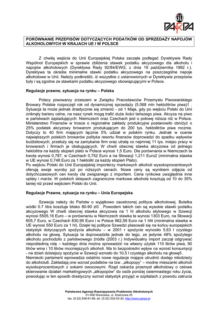PORÓWNANIE PRZEPISÓW DOTYCZĄCYCH PODATKÓW OD SPRZEDAŻY NAPOJÓW ALKOHOLOWYCH W KRAJACH UE I W POLSCE Z chwilą wejścia do Unii Europejskiej Polska zaczęła podlegać Dyrektywie Rady Wspólnot Europejskich w sprawie zbliżenia stawek podatku akcyzowego dla alkoholu i napojów alkoholowych (Dyrektywa Rady 92/84/EWG; z dnia 19 października 1992 r.). Dyrektywa ta określa minimalne stawki podatku akcyzowego na poszczególne napoje alkoholowe w Unii. Należy podkreślić, iż wszystkie z ustanowionych w Dyrektywie przepisów były i są zgodne ze stawkami podatku akcyzowego obowiązującymi w Polsce. Regulacje prawne, sytuacja na rynku – Polska Polscy piwowarzy zrzeszeni w Związku Pracodawców Przemysłu Piwowarskiego Browary Polskie rozpoczęli rok od dynamicznej sprzedaży (5.068 mln hektolitrów piwa)1 . Sytuacja ta może jednak drastycznie się zmienić - od 1 Maja, gdy po wejściu Polski do Unii zniknęły bariery celne, na nasz rynek mogą trafić duże ilości tańszego piwa. Akcyza na piwo w państwach sąsiadujących: Niemczech oraz Czechach jest o połowę niższa niż w Polsce. Ministerstwo Finansów w trosce o regionalne zakłady produkcyjne postanowiło obniżyć o 25% podatek akcyzowy browarom produkującym do 200 tys. hektolitrów piwa rocznie. Dotyczy to 40 firm mających łącznie 5% udział w polskim rynku. Jednak w ocenie największych polskich browarów polityka resortu finansów doprowadzi do spadku wpływów budżetowych, przełoży się na zamykanie firm oraz utratę co najmniej 11 tys. miejsc pracy w browarach i firmach je obsługujących. W chwili obecnej stawka akcyzowa od jednego hektolitra na każdy stopień plato w Polsce wynosi 1,5 Euro. Dla porównania w Niemczech ta kwota wynosi 0,787, w Czechach 0,752 Euro a na Słowacji 1,211 Euro2 (minimalna stawka w UE wynosi 0,748 Euro za 1 hektolitr za każdy stopień Plato). Po wejściu Polski do Unii Europejskiej importerzy markowych alkoholi wysokoprocentowych oferują swoje wyroby już po niższych cenach. Nowe ceny są wynikiem odjęcia od dotychczasowych cen kwoty cła związanego z importem. Cena rynkowa uwzględnia inne opłaty i marże. W polskich sklepach zagraniczne markowe alkohole kosztują od 10 do 35% taniej niż przed wejściem Polski do Unii. Regulacje Prawne, sytuacja na rynku – Unia Europejska Szwecja należy do Państw o wyjątkowo zaostrzonej polityce alkoholowej. Butelka wódki 0.7 litra kosztuje blisko 80-90 zł3 . Powodem takich cen są wysokie stawki podatku akcyzowego W chwili obecnej stawka akcyzowa na 1 hl alkoholu etylowego w Szwecji wynosi 5505,16 Euro – w porównaniu w Niemczech stawka ta wynosi 1303 Euro, na Słowacji 605,7 Euro, w Czechach 830,95 Euro i w Polsce 962,59 Euro na 1 hl4 (minimalna stawka w UE wynosi 550 Euro za 1 hl). Dzięki tej polityce Szwedzi plasowali się na końcu europejskich statystyk dotyczących spożycia alkoholu – w 2001 r spożycie wynosiło 5,63 l czystego alkoholu na głowę. Sytuacja ta doprowadziła jednak do tego, ze jedynie 48% spożytego alkoholu pochodziło z państwowego źródła (2003 r.) Indywidualny import zaczął odgrywać niepoślednią rolę – każdego dnia można sprowadzić na własny użytek 110 litrów piwa, 90 litrów wina i 10 litrów mocniejszych alkoholi. Ma to bezpośredni wpływ na wzrost konsumpcji - na dzień dzisiejszy spożycie w Szwecji wzrosło do 10,5 l czystego alkoholu na głowę5 . Niemiecki parlament wprowadza ostatnio nowe regulacje mające utrudnić dostęp młodzieży do alkoholu6. Zakładają one wzrost podatków na tzw. „alkopopy” – modne mieszanki alkoholi wysokoprocentowych z sokami owocowymi. Rząd oskarża przemysł alkoholowy o celowe skierowanie działań marketingowych „alkopopów” do osób poniżej osiemnastego roku życia, powodując w ten sposób drastyczny wzrost statystyk przyjęć w szpitalach z powodu zatrucia Państwowa Agencja Rozwiązywania Problemów Alkoholowych 01-458 Warszawa, ul. Szańcowa 25 fax: (0-22) 836-81-66, tel. (0-22) 532-03-20, http://www.parpa.pl alkoholowego w tej kategorii wiekowej. Według badań co drugi „alkopop” jest kupowany nielegalnie przez osobę poniżej osiemnastego roku życia. Trendy w rozwoju spożycia Podstawowym elementem wpływającym na poziom spożycia napojów alkoholowych jest ich cena. Jednym z głównych jej składników jest stawka podatku akcyzowego. Jak wpływa ona poziom spożycia możemy przekonać się na podstawie Polski. Obniżenie stawki podatku akcyzowego w 2002 roku o 30% zaowocowało wzrostem spożycia wyrobów spirytusowych o około 40% (z 1,70 w 2002 roku do około 2,4 litra czystego alkoholu w 2003 roku) 7 . W chwili obecnej średnie spożycie piwa w Polsce na głowę wynosi około 74 l rocznie (w ciągu ostatnich 10 lat wzrosło ponad dwukrotnie). W przeciwieństwie do nasyconych rynkowo Niemiec i Czech, Polska jest pod tym względem wyjątkowo dynamicznym rynkiem. Szczególnie wrażliwe będą regiony przygraniczne, bezpośrednio wystawione na tańsze zasoby piwne. Do przewidzenia jest drastyczny wzrost konsumpcji alkoholu w tych regionach, szczególnie wśród młodzieży. Możliwy jest również wzrost przestępstw oraz wykroczeń spowodowanych nadużyciem alkoholu. -------------------------------------------------------------------------------1www.gazeta.pl; gospodarka 22.04.2004 [powrót do tekstu] 2http://europa.eu.int/comm/taxation_customs/publications/info_doc/info_doc.htm; “The excise duty rates applicable”. [powrót do tekstu] 3Newsweek Polska. 6.06.2004 „Niedokończona krucjata”. [powrót do tekstu] 4http://europa.eu.int/comm/taxation_customs/publications/info_doc/info_doc.htm. [powrót do tekstu] 5Newsweek Polska. 6.06.2004 „Niedokończona krucjata”. [powrót do tekstu] 6www.deutsche-welle.de [powrót do tekstu] 72002 – dane GUS; 2003 – obliczenia PARPA na podstawie danych GUS [powrót do tekstu]. Państwowa Agencja Rozwiązywania Problemów Alkoholowych 01-458 Warszawa, ul. Szańcowa 25 f