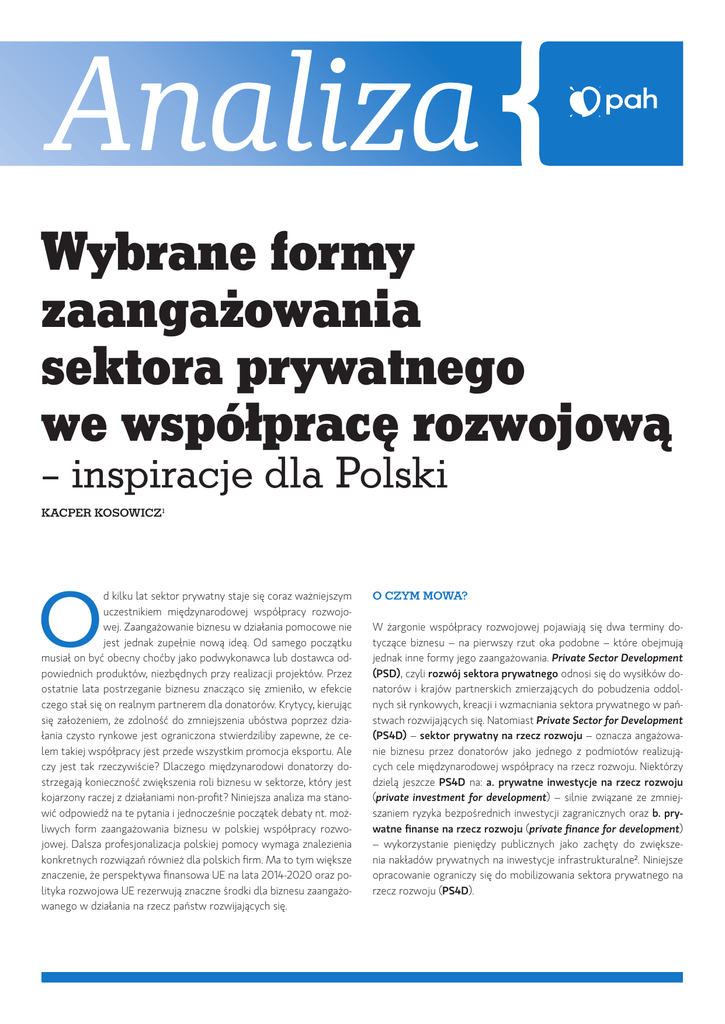 Wybrane formy zaangażowania sektora prywatnego we współpracę rozwojową – inspiracje dla Polski Kacper Kosowicz1 O d kilku lat sektor prywatny staje się coraz ważniejszym uczestnikiem międzynarodowej współpracy rozwojowej. Zaangażowanie biznesu w działania pomocowe nie jest jednak zupełnie nową ideą. Od samego początku musiał on być obecny choćby jako podwykonawca lub dostawca odpowiednich produktów, niezbędnych przy realizacji projektów. Przez ostatnie lata postrzeganie biznesu znacząco się zmieniło, w efekcie czego stał się on realnym partnerem dla donatorów. Krytycy, kierując się założeniem, że zdolność do zmniejszenia ubóstwa poprzez działania czysto rynkowe jest ograniczona stwierdziliby zapewne, że celem takiej współpracy jest przede wszystkim promocja eksportu. Ale czy jest tak rzeczywiście? Dlaczego międzynarodowi donatorzy dostrzegają konieczność zwiększenia roli biznesu w sektorze, który jest kojarzony raczej z działaniami non-profit? Niniejsza analiza ma stanowić odpowiedź na te pytania i jednocześnie początek debaty nt. możliwych form zaangażowania biznesu w polskiej współpracy rozwojowej. Dalsza profesjonalizacja polskiej pomocy wymaga znalezienia konkretnych rozwiązań również dla polskich firm. Ma to tym większe znaczenie, że perspektywa finansowa UE na lata 2014-2020 oraz polityka rozwojowa UE rezerwują znaczne środki dla biznesu zaangażowanego w działania na rzecz państw rozwijających się. O czym mowa? W żargonie współpracy rozwojowej pojawiają się dwa terminy dotyczące biznesu – na pierwszy rzut oka podobne – które obejmują jednak inne formy jego zaangażowania. Private Sector Development (PSD), czyli rozwój sektora prywatnego odnosi się do wysiłków donatorów i krajów partnerskich zmierzających do pobudzenia oddolnych sił rynkowych, kreacji i wzmacniania sektora prywatnego w państwach rozwijających się. Natomiast Private Sector for Development (PS4D) – sektor prywatny na rzecz rozwoju – oznacza angażowanie biznesu przez donatorów jako jednego z podmiotów realizujących cele międzynarodowej współpracy na rzecz rozwoju. Niektórzy dzielą jeszcze PS4D na: a. prywatne inwestycje na rzecz rozwoju (private investment for development) – silnie związane ze zmniejszaniem ryzyka bezpośrednich inwestycji zagranicznych oraz b. prywatne finanse na rzecz rozwoju (private finance for development) – wykorzystanie pieniędzy publicznych jako zachęty do zwiększenia nakładów prywatnych na inwestycje infrastrukturalne2. Niniejsze opracowanie ograniczy się do mobilizowania sektora prywatnego na rzecz rozwoju (PS4D). Analiza | 2 Wybrane formy zaangażowania sektora prywatnego we współpracę rozwojową – inspiracje dla Polski Wśród akceptowanych instrumentów włączania biznesu we współpracę rozwojową (w rozumieniu private sector for development) najczęściej wymieniane są: a. partnerstwa publiczno-prywatne (public private partnership, PPP), w tym specjalne konkursy dotacyjne dla firm oraz programy business-to-business; b. budowanie zdolności handlowych; c. gwarancje inwestycyjne oraz d. systemy współdzielenia ryzyka. Ponadto ważnym wymiarem udziału firm w działaniach pomocowych są partnerstwa z organizacjami pozarządowymi, wychodzące poza dotychczasowe formy sponsoringu, fundraisingu czy też koncentracji na dostawie produktu. Na drugim biegunie – wśród najbardziej krytykowanych praktyk – znajduje się stosowanie pomocy rozwojowej bezpośrednio do promocji handlu, przemysłu czy inwestycji komercyjnych. W niniejszej analizie przybliżone zostaną różne formy partnerstw publiczno-prywatnych we współpracy rozwojowej oraz partnerstwa między sektorem prywatnym a NGOs. We wszystkich formach zaangażowania biznesu opierających się na środkach publicznych musi być obecny tzw. komponent/dodatek rozwojowy (development additionality). Warunkuje on poziom, do którego zmierzają środki pomocowe skierowane do biznesu w celu zredukowania ubóstwa oraz osiągnięcia celów rozwojowych, w tym Milenijnych Celów Rozwoju oraz przestrzegania praw człowieka3. Celowi komercyjnemu zawsze musi zatem towarzyszyć komponent rozwojowy. Warto jeszcze zauważyć, że chociaż działania przynoszące zysk są nieodłącznym i niezaprzeczalnym celem biznesu, to jednak nowe postrzeganie wartości przedsiębiorstwa – nie tylko z perspektywy księgowej – umożliwia wypracowanie bardziej akceptowalnej formy włączania sektora prywatnego we współpracę rozwojową. Dzięki temu istnieje bowiem przestrzeń do zmniejszania bardziej lub mniej pozornej rozbieżności pomiędzy aktorami społecznymi, samym celem pomocy a sektorem prywatnym. Wymaga to od obu stron otwartości na siebie i – przede wszystkim – dialogu na temat norm i wartości. Chcąc działać we współpracy rozwojowej, nie można traktować jej jak każdej innej formy i przestrzeni realizacji biznesu. W tym przypadku nie wystarczy również działanie CSR-owe nastawione wyłącznie na osiągnięcie efektu medialnego i PR-owego, czyli służące przede wszystkim budowaniu marki. Konieczne jest przyjęcie pewnych wartości, opublikowanie i funkcjonowanie zgodnie z kodeksem postępowania danej firmy we współpracy rozwojowej oraz przypisanie sobie konkretnego miejsca i roli. Współpraca rozwojowa nie może być też jedynie przykrywką do działań biznesowych na większą skalę, ponieważ w tym przypadku beneficjent nie jest zwyczajnym klientem i konsumentem, ale zazwyczaj należy do najsłabszych grup społecznych, najczęściej marginalizowanych i odciętych od owoców globalizacji. Dlatego też każde działanie – nawet bycie typowym dostawcą produktów dla aktorów realizujących pomoc rozwojową – wymaga od podmiotu biznesowego odpowiedniej wrażliwości i przestrzegania norm etycznych. Sektor prywatny w międzynarodowej debacie o współpracy rozwojowej Światowy kryzys gospodarczy uświadom