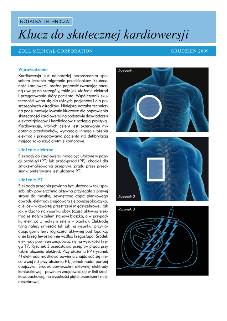 NOTATKA TECHNICZA: Klucz do skutecznej kardiowersji ZOLL MEDICAL CORPORATION Wprowadzenie GRUDZIEŃ 2009 Rysunek 1 Kardiowersja jest najbardziej bezpośrednim sposobem leczenia migotania przedsionków. Skuteczność kardiowersji można poprawić zwracając baczną uwagę na szczegóły, takie jak ułożenie elektrod i przygotowanie skóry pacjenta. Współczynnik skuteczności waha się dla różnych pacjentów i dla poszczególnych ośrodków. Niniejsza notatka techniczna podsumowuje kwestie kluczowe dla poprawienia skuteczności kardiowersji na podstawie doświadczeń elektrofizjologów i kardiologów z rozległą praktyką. Kardiowersje, których celem jest przerwanie migotania przedsionków, wymagają innego ułożenia elektrod i przygotowania pacjenta niż defibrylacja mająca zakończyć arytmie komorowe. Ułożenie elektrod Elektrody do kardiowersji mogą być ułożone w pozycji przód-tył (PT) lub przód-przód (PP), chociaż dla zmaksymalizowania przepływu prądu przez przedsionki preferowane jest ułożenie PT. Ułożenie PT Elektroda przednia powinna być ułożona w taki sposób, aby powierzchnia aktywna przylegała z prawej strony do mostka, zewnętrzna część piankowego obwodu elektrody znajdowała się poniżej obojczyka, a jej oś – w czwartej przestrzeni międzyżebrowej, tak jak widać to na rysunku obok (część aktywną elektrod ze stałym żelem stanowi blaszka, a w przypadku elektrod z mokrym żelem – pianka). Elektrodę tylną należy umieścić tak jak na rysunku, przykładając górny lewy róg części aktywnej pod łopatką, a jej brzeg lewostronnie wzdłuż kręgosłupa. Środek elektrody powinien znajdować się na wysokości kręgu T7. Rysunek 3 przedstawia przepływ prądu przy takim ułożeniu elektrod. Przy ułożeniu PP (rysunek 4) elektroda mostkowa powinna znajdować się nieco wyżej niż przy ułożeniu PT, jednak nadal poniżej obojczyka. Środek powierzchni aktywnej elektrody koniuszkowej powinien znajdować się w linii środkowopachowej, na wysokości piątej przestrzeni międzyżebrowej. Rysunek 2 Rysunek 3 Wskazówki do przeprowadzenia skutecznej kardiowersji Wskazówki do prze prowadzenia skutecznej kardiowersji Strona 2 Rysunek 4 Dzięki doktorowi Markowi Niebauerowi z kliniki w Cleveland, prezentujemy krótką listę zaleceń pozwalających zwiększyć prawdo podobieństwo przeprowadzenia skutecznej kardiowersji. •Nakleić elektrody w pozycji PT dla maksymalizacji przepływu prądu przez przedsionki •Rozważyć użycie elektrod z mokrym żelem zamiast elektrod ze stałym żelem dla osągnięcia optymalnego przylegania •Zwracać baczną uwagę na przygotowanie skóry pacjenta: upewnić się, że powierzchnia jest sucha, bez włosów, kremów i balsamów mogących wpływać na przyleganie elektrod •Ostrożnie naklejać elektrody: najpierw przyłożyć elektrodę tylną, następnie naklejać ją ruchem rolującym upewniając się, że pod spodem nie tworzą się pęcherzyki powietrza •Upewnić się, że znacznik synchronizacji EKG znajduje się nad załamkiem R; znacznik synchronizacji pojawia się czasami nad załamkiem T o wysokiej amplitudzie •Gdy potrzebne jest więcej niż jedno wyładowanie, odczekać minutę przed kolejnym – zgodnie z rekomendacjami American College of Cardiology. Czekać cierpliwie. •U pacjentów przyjmujących określone leki, takie jak beta-blokery, po wyładowaniu może wystąpić bradykardia, co wymagać może stymulacji przezskórnej aż do ustabilizowania się rytmu. Kolejną zaletą ułożenia PT jest możliwość natychmiastowego rozpoczęcia stymulacji po przesunięciu elektrody mostkowej w lewo. Linia pachowa przednia Linia pachowa środkowa Protokoły wyładowań Mniejsi pacjenci, ze świeżym napadem migotania przedsionków, zazwyczaj wracają do normalnego rytmu po pierwszym wyładowaniu. W tej grupie dr Niebauer zaleca wyładowanie na poziomie 75 J (defibrylator dwufazowy), mając na względzie maksymalną ochronę mięśnia sercowego i wysoką skuteczność pierwszego wyładowania. Zdaniem dra Niebauera u przeciętnych pacjentów z utrwalonym migotaniem przedsionków pierwsze wyładowanie na poziomie 100 – 120 J (defibrylator dwufazowy) jest skuteczne w ponad 90% przypadków. Pacjenci trudni lub potencjalnie trudni z punktu widzenia skuteczności kardiowersji powinni otrzymać pierwsze wyładowanie na poziomie maksymalnie 200 J (defibrylator dwufazowy). W tej grupie pacjentów dociśnięcie elektrod w trakcie wyładowania powoduje zmniejszenie odległości pomiędzy nimi i optymalizuje przepływ prądu. Dr Niebauer radzi również, aby nie bać się przesunięcia elektrod jeśli pierwsze wyładowanie okazało się nieskuteczne; u niektórych pacjentów konieczne może być nawet naklejenie elektrody mostkowej po przeciwnej stronie mostka. Bibliografia ACC/AHA/ESC 2006 Guidelines for the Management of Patients with Atrial Fibrillation. Circulation 2006;114:700-752. Lown, B. et al. “Cardioversion” of atrial fibrillation. New England Journal of Medicine 1963;269:325-331. Field, J.M., Hazinski, M.F., & Gilmore, D. [Eds]. 2006 Handbook of Emergency Cardiovascular Care for Healthcare Providers. American Heart Association. Neal, S., Ngarmukos, T., Lessard, D. & Rosenthal, L. Comparison of the efficacy and safety of two biphasic defibrillator waveforms for the conversion of atrial fibrillation to sinus rhythm. American Journal of Cardiology 2003;92:810-814. Mittal, S Ayati,S et al. Transthoracic Cardioversion of Atrial Fibrillation. Comparison of Rectilinear Biphasic Versus Damped Sine Wave Monophasic Shocks. Circulation. 2000;101:1282-1287. Niebauer M et al. Comparison of the rectilinear biphasic waveform with the damped sine monophasic waveform for external cardioversion of atrial fibrillation and flutter. Am J Card. 2004: Vol. 93. 1495-99. Sado, D.M. et al. Comparison of the effects of removal of chest hair with not doing so before external defibrillation on transthoracic impeda
