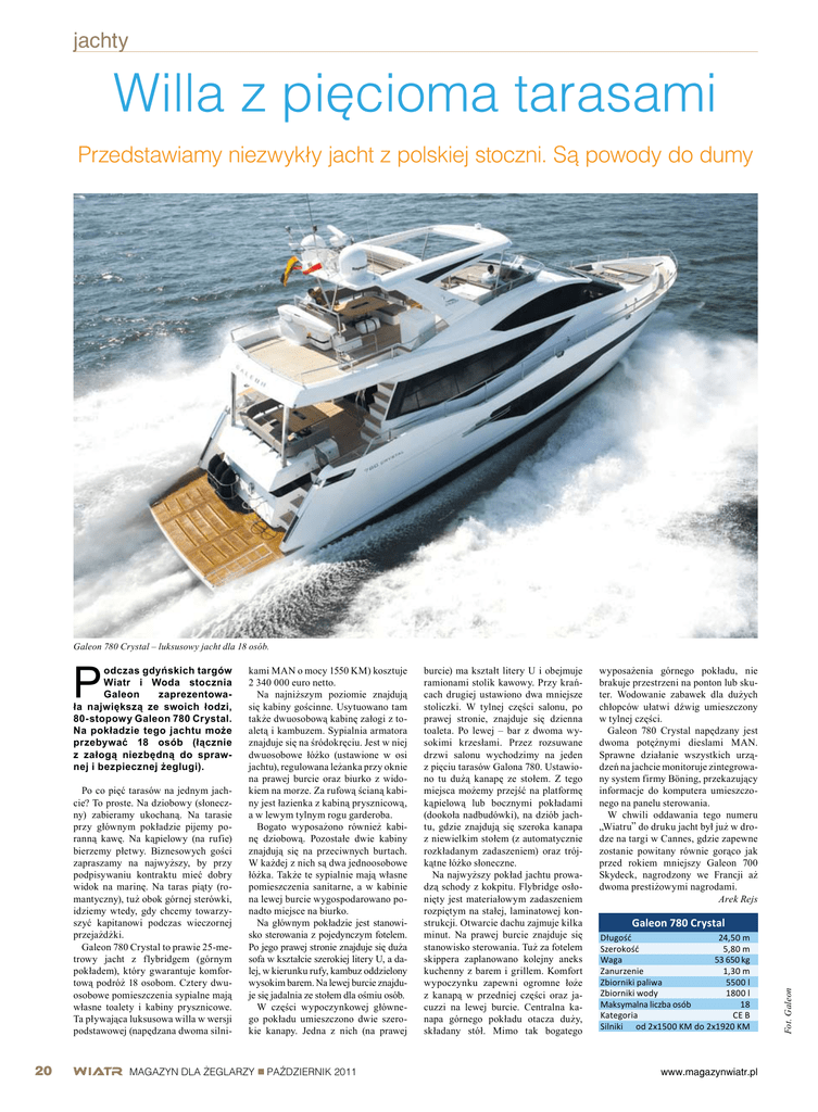 jachty Willa z pięcioma tarasami Przedstawiamy niezwykły jacht z polskiej stoczni. Są powody do dumy Galeon 780 Crystal – luksusowy jacht dla 18 osób. Po co pięć tarasów na jednym jachcie? To proste. Na dziobowy (słoneczny) zabieramy ukochaną. Na tarasie przy głównym pokładzie pijemy poranną kawę. Na kąpielowy (na rufie) bierzemy płetwy. Biznesowych gości zapraszamy na najwyższy, by przy podpisywaniu kontraktu mieć dobry widok na marinę. Na taras piąty (romantyczny), tuż obok górnej sterówki, idziemy wtedy, gdy chcemy towarzyszyć kapitanowi podczas wieczornej przejażdżki. Galeon 780 Crystal to prawie 25-metrowy jacht z flybridgem (górnym pokładem), który gwarantuje komfortową podróż 18 osobom. Cztery dwuosobowe pomieszczenia sypialne mają własne toalety i kabiny prysznicowe. Ta pływająca luksusowa willa w wersji podstawowej (napędzana dwoma silni- 20 kami MAN o mocy 1550 KM) kosztuje 2 340 000 euro netto. Na najniższym poziomie znajdują się kabiny gościnne. Usytuowano tam także dwuosobową kabinę załogi z toaletą i kambuzem. Sypialnia armatora znajduje się na śródokręciu. Jest w niej dwuosobowe łóżko (ustawione w osi jachtu), regulowana leżanka przy oknie na prawej burcie oraz biurko z widokiem na morze. Za rufową ścianą kabiny jest łazienka z kabiną prysznicową, a w lewym tylnym rogu garderoba. Bogato wyposażono również kabinę dziobową. Pozostałe dwie kabiny znajdują się na przeciwnych burtach. W każdej z nich są dwa jednoosobowe łóżka. Także te sypialnie mają własne pomieszczenia sanitarne, a w kabinie na lewej burcie wygospodarowano ponadto miejsce na biurko. Na głównym pokładzie jest stanowisko sterowania z pojedynczym fotelem. Po jego prawej stronie znajduje się duża sofa w kształcie szerokiej litery U, a dalej, w kierunku rufy, kambuz oddzielony wysokim barem. Na lewej burcie znajduje się jadalnia ze stołem dla ośmiu osób. W części wypoczynkowej głównego pokładu umieszczono dwie szerokie kanapy. Jedna z nich (na prawej magazyn dla żeglarzy październik 2011 burcie) ma kształt litery U i obejmuje ramionami stolik kawowy. Przy krańcach drugiej ustawiono dwa mniejsze stoliczki. W tylnej części salonu, po prawej stronie, znajduje się dzienna toaleta. Po lewej – bar z dwoma wysokimi krzesłami. Przez rozsuwane drzwi salonu wychodzimy na jeden z pięciu tarasów Galona 780. Ustawiono tu dużą kanapę ze stołem. Z tego miejsca możemy przejść na platformę kąpielową lub bocznymi pokładami (dookoła nadbudówki), na dziób jachtu, gdzie znajdują się szeroka kanapa z niewielkim stołem (z automatycznie rozkładanym zadaszeniem) oraz trójkątne łóżko słoneczne. Na najwyższy pokład jachtu prowadzą schody z kokpitu. Flybridge osłonięty jest materiałowym zadaszeniem rozpiętym na stałej, laminatowej konstrukcji. Otwarcie dachu zajmuje kilka minut. Na prawej burcie znajduje się stanowisko sterowania. Tuż za fotelem skippera zaplanowano kolejny aneks kuchenny z barem i grillem. Komfort wypoczynku zapewni ogromne łoże z kanapą w przedniej części oraz jacuzzi na lewej burcie. Centralna kanapa górnego pokładu otacza duży, składany stół. Mimo tak bogatego wyposażenia górnego pokładu, nie brakuje przestrzeni na ponton lub skuter. Wodowanie zabawek dla dużych chłopców ułatwi dźwig umieszczony w tylnej części. Galeon 780 Crystal napędzany jest dwoma potężnymi dieslami MAN. Sprawne działanie wszystkich urządzeń na jachcie monitoruje zintegrowany system firmy Böning, przekazujący informacje do komputera umieszczonego na panelu sterowania. W chwili oddawania tego numeru „Wiatru” do druku jacht był już w drodze na targi w Cannes, gdzie zapewne zostanie powitany równie gorąco jak przed rokiem mniejszy Galeon 700 Skydeck, nagrodzony we Francji aż dwoma prestiżowymi nagrodami. Arek Rejs Galeon 780 Crystal Długość 24,50 m Szerokość 5,80 m Waga 53 650 kg Zanurzenie 1,30 m Zbiorniki paliwa 5500 l Zbiorniki wody 1800 l Maksymalna liczba osób 18 Kategoria CE B Silniki od 2x1500 KM do 2x1920 KM www.magazynwiatr.pl Fot. Galeon P odczas gdyńskich targów Wiatr i Woda stocznia Galeon zaprezentowała największą ze swoich łodzi, 80-stopowy Galeon 780 Crystal. Na pokładzie tego jachtu może przebywać 18 osób (łącznie z załogą niezbędną do sprawnej i bezpiecznej żeglugi).