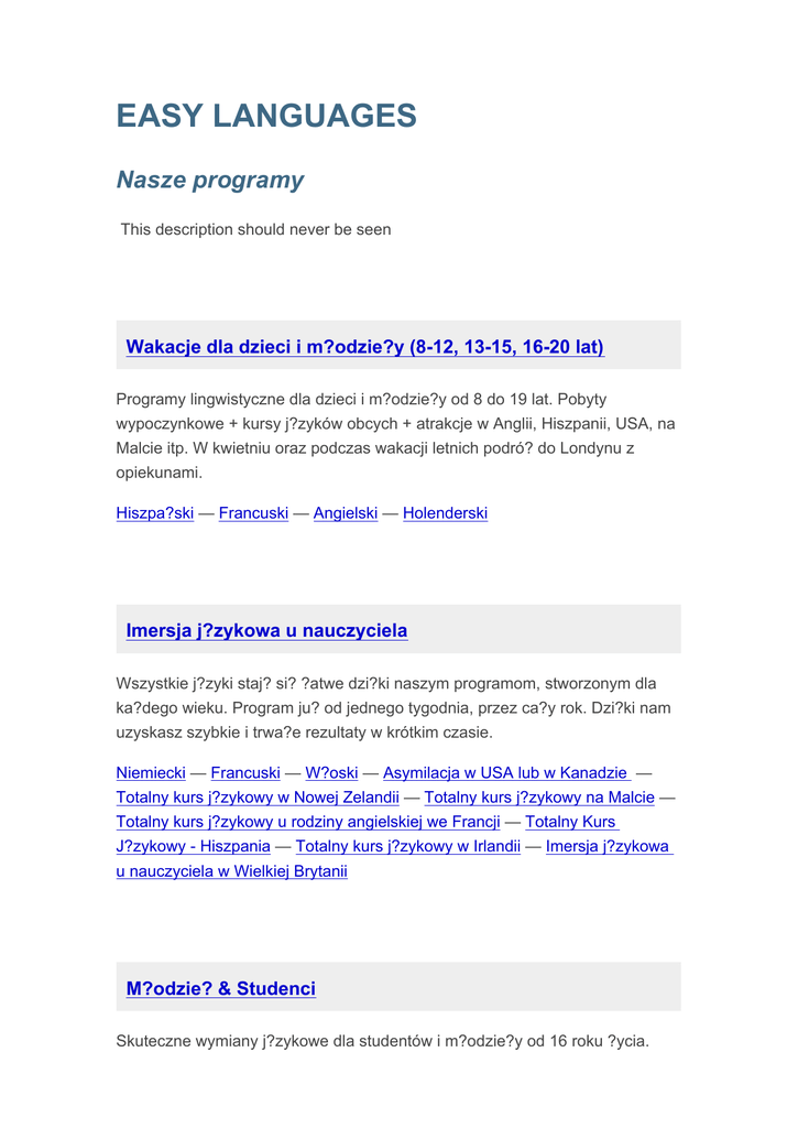 EASY LANGUAGES Nasze programy This description should never be seen Wakacje dla dzieci i m?odzie?y (8-12, 13-15, 16-20 lat) Programy lingwistyczne dla dzieci i m?odzie?y od 8 do 19 lat. Pobyty wypoczynkowe + kursy j?zyków obcych + atrakcje w Anglii, Hiszpanii, USA, na Malcie itp. W kwietniu oraz podczas wakacji letnich podró? do Londynu z opiekunami. Hiszpa?ski — Francuski — Angielski — Holenderski Imersja j?zykowa u nauczyciela Wszystkie j?zyki staj? si? ?atwe dzi?ki naszym programom, stworzonym dla ka?dego wieku. Program ju? od jednego tygodnia, przez ca?y rok. Dzi?ki nam uzyskasz szybkie i trwa?e rezultaty w krótkim czasie. Niemiecki — Francuski — W?oski — Asymilacja w USA lub w Kanadzie — Totalny kurs j?zykowy w Nowej Zelandii — Totalny kurs j?zykowy na Malcie — Totalny kurs j?zykowy u rodziny angielskiej we Francji — Totalny Kurs J?zykowy - Hiszpania — Totalny kurs j?zykowy w Irlandii — Imersja j?zykowa u nauczyciela w Wielkiej Brytanii M?odzie? & Studenci Skuteczne wymiany j?zykowe dla studentów i m?odzie?y od 16 roku ?ycia. Programy dopasowane do wszystkich poziomów. Kursy wakacyjne lub intensywne, od 1 tyg. do ca?ego roku szkolnego.Gwarantowane najlepsze ceny Hiszpa?ski — Francuski — Niemiecki — Angielski — Holenderski — W?oski — Portugalski Doro?li i profesjonalna kadra Przygotowali?my szerok? gam? programów, z których uczestnicy mog? wybra? najodpowiedniejszy dla osi?gni?cia ich celów. Francuski — Niemiecki — Angielski — Hiszpa?ski — Holenderski — W?oski — Rosyjski super-intensywny w CERAN (doro?li i pro). — Japo?ski superintensywny w CERAN (doro?li i pro). — Portugalski w Lizbonie Przygotowanie do egzaminów Easy Languages towarzyszy wam w przygotowaniu do egzaminów ze znajomo?ci j?zyków obcych. Uzyskany dyplom b?dzie wspania?ym atutem w twoim CV. Egzaminy Cambridge — TOEFL — TOEIC — IELTS — TestDaF et DSH — DELE — DELF i DALF Rok szkolny za granic? Nauka w szkole ?redniej za granic?: USA, Anglia, Kanada, Irlandia, Australia, Francja, Hiszpania, Argentyna i inne... Miesi?c lub rok szkolny. Niemiecki — Francuski — Hiszpa?ski — Kanada — Stany Zjednoczone — Irlandia — Ameryka Po?udniowa — High School w Brisbane — High School w Melbourne — Angielski College w Brockenhurst — High school w Adelajdzie — Angielski College w Bournemouth — Angielski college w Chichester Integracja szkolna Pobyt lingwistyczny przeznaczony dla 12-19 lat, oferuje mo?liwo?? szkolnej integracji w wybranym kraju, j?zyku oraz kulturze przy boku swoich rówie?ników. Szko?a ?rednia we Francji – krótki termin Wolontariat Nasza program daje fantastyczn? okazj? pracy jako wolontariusz w ró?nych zak?tkach ?wiata. Oferujemy kursy j?zykowe przed wyjazdem lub podczas wolontariatu, w zale?no?ci od przeznaczenia programu. Wolontariat w Indiach — Wolontariat i podró?e w Indiach - "Indian Experience" — Wolontariat w Afryce Po?udniowej Praktyki/sta?e Nasze programy otworz? Ci mo?liwo?? ?ycia i pracy za granic?, na ca?ym ?wiecie, z mo?liwo?ci? nauki j?zyka jednocze?nie. Sta? w firmie - San Diego — Praktyki w przedsi?biorstwie w Pekinie i w Szanghaju Zakwaterowanie bez kursów Oferujemy mo?liwo?? zakwaterowania w mieszkaniu, rezydencji lub u rodziny goszcz?cej bez konieczno?ci rezerwacji kursów j?zykowych. Zakwaterowanie w Santa Barbara - California Gap Year w Bostonie - Pine Manor College Semestr lekcji j?zyka angielskiego i zaj?? akademickich skierowany do osób od 17 roku ?ycia. Wymagana zaawansowana znajomo?? j?zyka angielskiego. Pobyt minimalny to 12 tygodni. Cena od 8.995 US$ (w tym kurs i zakwaterowanie w akademiku z pe?nym wyposa?eniem). Gap Year w San Diego Jeden semestr kursów angielskiego i semestr akademicki w San Diego. Od 17 do 21 roku ?ycia. Rok akademicki od 15,950$ (zawiera zakwaterowanie w domu studenckim z dzielon? kuchni?).