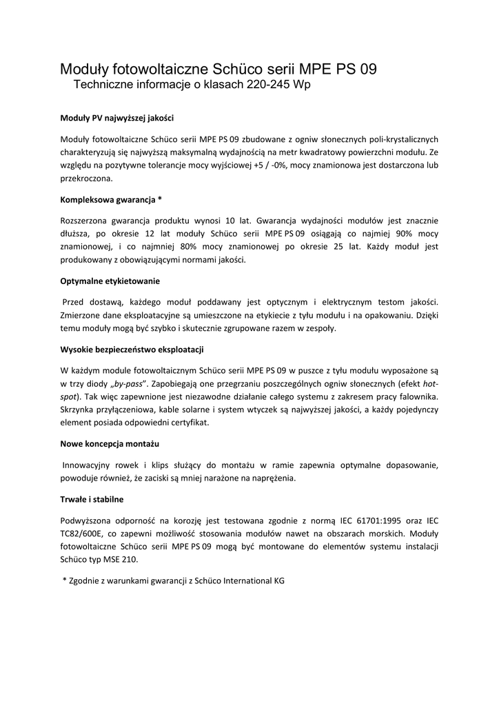 Moduły fotowoltaiczne Schüco serii MPE PS 09 Techniczne informacje o klasach 220-245 Wp Moduły PV najwyższej jakości Moduły fotowoltaiczne Schüco serii MPE PS 09 zbudowane z ogniw słonecznych poli-krystalicznych charakteryzują się najwyższą maksymalną wydajnością na metr kwadratowy powierzchni modułu. Ze względu na pozytywne tolerancje mocy wyjściowej +5 / -0%, mocy znamionowa jest dostarczona lub przekroczona. Kompleksowa gwarancja * Rozszerzona gwarancja produktu wynosi 10 lat. Gwarancja wydajności modułów jest znacznie dłuższa, po okresie 12 lat moduły Schüco serii MPE PS 09 osiągają co najmiej 90% mocy znamionowej, i co najmniej 80% mocy znamionowej po okresie 25 lat. Każdy moduł jest produkowany z obowiązującymi normami jakości. Optymalne etykietowanie Przed dostawą, każdego moduł poddawany jest optycznym i elektrycznym testom jakości. Zmierzone dane eksploatacyjne są umieszczone na etykiecie z tyłu modułu i na opakowaniu. Dzięki temu moduły mogą być szybko i skutecznie zgrupowane razem w zespoły. Wysokie bezpieczeństwo eksploatacji W każdym module fotowoltaicznym Schüco serii MPE PS 09 w puszce z tyłu modułu wyposażone są w trzy diody „by-pass”. Zapobiegają one przegrzaniu poszczególnych ogniw słonecznych (efekt hotspot). Tak więc zapewnione jest niezawodne działanie całego systemu z zakresem pracy falownika. Skrzynka przyłączeniowa, kable solarne i system wtyczek są najwyższej jakości, a każdy pojedynczy element posiada odpowiedni certyfikat. Nowe koncepcja montażu Innowacyjny rowek i klips służący do montażu w ramie zapewnia optymalne dopasowanie, powoduje również, że zaciski są mniej narażone na naprężenia. Trwałe i stabilne Podwyższona odporność na korozję jest testowana zgodnie z normą IEC 61701:1995 oraz IEC TC82/600E, co zapewni możliwość stosowania modułów nawet na obszarach morskich. Moduły fotowoltaiczne Schüco serii MPE PS 09 mogą być montowane do elementów systemu instalacji Schüco typ MSE 210. * Zgodnie z warunkami gwarancji z Schüco International KG Moduły fotowoltaiczne Schüco serii MPE PS 09 * Parametry elektryczne Dane wyjściowe (z wyjątkiem NOCT) w warunkach normalnych (STC) 1): Moc nominalna (Pmpp) Tolerancji wyjściowa (Δ Pmpp) klasa wydajności modułu MPE 220 PS 09 MPE 225 PS 09 Gwarantowana moc wyjściowa minimum (Pmpp min) Napięcie nominalne (Umpp) Prąd (Impp) Napięcie biegu jałowego (Uoc) Prąd zwarcia (Isc) Wydajności ogniw Wydajność modułu Współczynnik temperaturowy α (Pmpp) Współczynnik temperaturowy β (Isc) Temperatura współczynnik χ (Uoc) współczynnik temperaturowy δ (Impp) Temperaturowy współczynnik ε (Umpp) Normalna temperatura pracy CeII (NOCT) 2) Maksymalne dopuszczalne napięcie systemu Liczba ogniw Wymiary ogniwa MPE 230 PS 09 MPE 235 PS 09 MPE 240 PS 09 MPE 245 PS 09 220 Wp +5% / -0% 225 Wp +5% / -0% 230 Wp +5% / -0% 235 Wp +5% / -0% 240 Wp +5% / -0% 245 Wp +5% / -0% 220 Wp 225 Wp 230 Wp 235 Wp 240 Wp 245 Wp 28.77 V 7.66 A 36.34 V 8.28 A 15.4% 13.7% 29.03 V 7.76 A 36.68 V 8.33 A 15.7% 14.0% 29.29 V 7.86 A 37.01 V 8.37 A 16.1% 14.3% 29.54 V 7.96 A 37.34 V 8.42 A 16.4% 14.6% - 0,47% / ° C 29.80 V 8.06 A 37.67 V 8.47 A 16.9% 14.9% 30.06 V 8.16 A 38.00 V 8.52 A 17.2% 15.2% +0.052% / ° C -0.34% / ° C +0.052% / ° C -0.46% / ° C 43 ° C (± 2 ° C) 1000 V 60 (6 x 10) 156 x 156 mm 1) 1000 W/m2 oświetlenia, Air Mass 1.5, temperatura ogniwa 25 ° C, moduły fotowoltaiczne mają degradację parametrów elektrycznych. Silnie maleją po początkowym rozruchu, a później są liniowe. 2) 800 W/m2 oświetlenia, temperatury otoczenia 20 ° C, prędkości wiatru 1 m / s Parametry mechaniczne Wymiary zewnętrzne (dł. x szer. x wys.) Konstrukcja ramy Szkło z przodu Waga System połączeń / przekrój przewodu Długości kabli: plus ./ minus 1639 x 983 x 42 mm Anodyzowane aluminium, srebrny (RAL 7035) Szkło hartowane (ESG) 20 kg Schüco / 4 mm2 (MC-T4 kompatybilny 100 cm ± 5 cm / 100 cm ± 5 cm Certyfikaty i gwarancje 3) Klasyfikacja elektryczna II klasy bezpieczeństwa Zgodność wyrobu z normą IEC 61215, EN 61730 Obciążenia śniegiem i wiatrem testowany do 7,5 kN/m2 Rozszerzona gwarancja produktu 10 lat Gwarancja wydajności ponad 90% Pmpp min. 12 lat Gwarancja wydajności ponad 80% Pmpp min. 25 lat 3) Zgodnie z warunkami gwarancji Schüco International KG Szczegóły Seria PS 09-1 Waga w opakowaniu System instalacji Schüco Typ uchwutów Schüco Art. Schüco MPE 220 PS 09 273 618 Art. Schüco MPE 225 PS 06 273 619 Art. Schüco MPE 230 PS 06 273 620 Art. Schüco MPE 235 PS 06 273 621 Art. Schüco MPE 240 PS 06 273 622 Art. Schüco MPE 245 PS 06 273 623 Zestaw Zmiany / ulepszenia techniczne zastrzeżone Wydajność 220-245 Wp Pozytywne oceny tolerancji Projektowanie i produkcja Optymalne oznakowanie Innowacyjne zachowaniu rowek Anodowana aluminiowa rama Bypass diody Najwyższa jakość Schüco Wyprodukowano zgodnie z wymogami jakościowymi Rozszerzona gwarancja bezpieczeństwa produktów * Dostępność klasy usług jest testowany na życzenie. Seria PS 09-2 42 kg MSE 210 Typ 43 271 844 271 845 271 846 271 847 272 889 273 615 2 moduły PS 09-3 273 630 273 631 273 632 273 633 273 634 273 635 Najwyższa wydajność w zwartej powierzchni modułu moc została osiągnięta lub przekroczona Indywidualne dane o wydajności na etykietach modułu i opakowania klip i harmonicznych optyki optymalnego zamknięcia formy spełnia najwyższe standardy stabilności i odporności na korozję zapobiegania "efektu hot-spot" określić testów wydajności są zgłaszane dla każdego modułu Bezpieczeństwo inwestycji i niezawodnej pracy instalacji