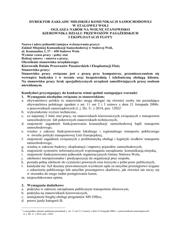DYREKTOR ZAKŁADU MIEJSKIEJ KOMUNIKACJI SAMOCHODOWEJ W STALOWEJ WOLI OGŁASZA NABÓR NA WOLNE STANOWISKO KIEROWNIKA DZIAŁU PRZEWOZÓW PASAŻERSKICH I EKSPLOATACJI FLOTY Nazwa i adres jednostki (miejsca wykonywania pracy): Zakład Miejskiej Komunikacji Samochodowej w Stalowej Woli, ul. Komunalna 3, 37 – 450 Stalowa Wola Wymiar czasu pracy : pełny etat Rodzaj umowy : umowa o pracę, Określenie stanowiska urzędniczego: Kierownik Działu Przewozów Pasażerskich i Eksploatacji Floty Stanowisko pracy: Stanowisko pracy związane jest z pracą przy komputerze, przemieszczaniem się wewnątrz budynku i w terenie oraz bezpośrednią i telefoniczną obsługą klienta. Na stanowisku pracy brak specjalistycznych urządzeń umożliwiających pracę osobom niewidomym. Kandydaci przystępujący do konkursu winni spełnić następujące warunki: 1. Wymagania niezbędne związane ze stanowiskiem: a. obywatelstwo polskie (o stanowisko mogą ubiegać się również osoby nie posiadające obywatelstwa polskiego zgodnie z art. 11 ust 2 i 3 ustawy z dnia 21 listopada 2008r. o pracownikach samorządowych (t. j. Dz. U. z 2014, poz. 1202)1 b. wykształcenie wyższe techniczne, c. co najmniej 5 letni staż pracy, na stanowiskach kierowniczych związanych z transportem samochodowym lub pokrewnych stanowiskach technicznych, d. znajomość zagadnień funkcjonowania komunikacji samochodowej bądź transportu samochodowego, e. wiedza z zakresu funkcjonowania lokalnego i regionalnego transportu publicznego w świetle polityki transportowej Unii Europejskiej, f. znajomość zagadnień związanych z problematyką obsługi i logistyki środków transportu samochodowego, g. wiedzą w zakresie budowy, eksploatacji i naprawy pojazdów samochodowych, h. znajomość systemów informatycznych wspomagania zarządzania komunikacją miejską, i. znajomość funkcjonowania jednostek organizacyjnych Gminy Stalowa Wola, j. zdolności interpersonalne i predyspozycje do organizacji prac zespołu, k. posiada pełną zdolność do czynności prawnych oraz korzysta z pełni praw publicznych, l. kandydat nie był skazany prawomocnym wyrokiem sądu za umyślne przestępstwo ścigane z oskarżenia publicznego lub umyślne przestępstwo skarbowe, jak również nie toczy się w stosunku do niego żadne postępowanie karne, m. nieposzlakowana opinia. 2. a. b. c. d. 1 Wymagania dodatkowe praktyka w zakresie zarządzania publicznym transportem zbiorowym, praktyka na stanowiskach kierowniczych, umiejętność biegłej obsługi programów MS Office, prawo jazdy kategorii B, w przypadku uznania spełnienia przesłanek z art. 11 ust 2 i 3 ustawy z dnia 21 listopada 2008 r. o pracownikach samorządowych (t. j. Dz. U. z 2014, poz. 1202) e. znajomość przepisów związanych z branżą transportową, f. kreatywność, komunikatywność, samodyscyplina, otwartość na zmiany, wysoka kultura osobista, asertywność, odporność na stres. 3. Do zakresu zadań wykonywanych na stanowisku Kierownika Działu Przewozów Pasażerskich i Eksploatacji Floty należy: a) Organizowanie i nadzór nad realizacją zadań przewozowych, b) Ustalanie i egzekwowanie realizacji zadań dla poszczególnych komórek i stanowisk pracy w podległym dziale, c) Kierowanie całokształtem zadań związanych z realizacją regularnych przewozów pasażerskich, wykonywanych w ramach lokalnego transportu zbiorowego w granicach administracyjnych miasta i gmin sąsiadujących, d) Prognozowanie i planowanie potrzeb przewozowych komunikacji miejskiej, e) Opracowywanie koncepcji układu sieci komunikacyjnych miejskich i podmiejskich, f) Nadzór nad efektywnym wykorzystaniem sprawnego technicznie taboru komunikacyjnego, g) Prowadzenie i dokumentowanie przedsięwzięć logistycznych w oparciu o posiadane systemy informatyczne, h) Prowadzenie spraw związanych z ubezpieczeniem środków transportu oraz majątku zakładu, i) Likwidacja szkód komunikacyjnych, majątkowych i osobowych, j) Nadzór w zakresie ochrony środowiska w komunikacji miejskiej, wykonywanie sprawozdań, k) Odpowiedzialność za realizację planu eksploatacyjnego w zakresie świadczenia publicznych usług przewozowych w lokalnym transporcie zbiorowym na terenie Gminy Stalowa Wola i gmin ościennych, z którymi podpisano porozumienia o przejęciu zadania własnego gmin w zakresie publicznego transportu zbiorowego przez ZMKS w Stalowej Woli, l) Obsługa klientów zakładu. 4. a) b) c) d) e) f) g) h) i) j) k) l) Wymagane dokumenty: kwestionariusz osobowy, list motywacyjny, aktualny numer telefonu do kontaktu, kserokopie dokumentów potwierdzających wykształcenie, poświadczone przez kandydata za zgodność z oryginałem, kserokopie dokumentów potwierdzających posiadane kwalifikacje i umiejętności, poświadczone przez kandydata za zgodność z oryginałem, kserokopie świadectw pracy, poświadczone przez kandydata za zgodność z oryginałem, oświadczenie o posiadanym obywatelstwie, oświadczenie, że kandydat nie był skazany prawomocnym wyrokiem sądu za umyślne przestępstwo ścigane z oskarżenia publicznego lub umyślne przestępstwo skarbowe, oświadczenie kandydata, o pełnej zdolności do czynności prawnych oraz korzystania z pełni praw publicznych, oświadczenie kandydata, że nie toczy się w stosunku do niego żadne postępowanie karne, kserokopia dokumentu potwierdzającego niepełnosprawność w przypadku zamiaru skorzystania z uprawnienia, o którym mowa w art. 13a ust. 2 ustawy z dnia 21 listopada 2008 r. o pracownikach samorządowych (t. j. Dz. U. z 2014, poz. 1202), zgoda na przetwarzanie danych osobowych o treści: „Wyrażam zgodę na przetwarzanie moich danych osobowych, zawartych w ofercie pracy, dla potrzeb niezbędnych do realizacji procesu rekrutacji, zgodnie z ustawą z dnia 29 sierpnia 1997r. o ochronie danych osobowych (t. j. Dz. U. z 2014 r., poz. 1182 z późn. zm.) oraz z ustawą z dnia 21 listopada 2008 r. o pracownikach samorządowych (t.j. Dz. U. z 2014, poz. 1202 z późn. zm.).