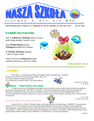 P I S E M K O O N A S D L A W A S Szkoła Podstawowa w Niemczu, ul. Bydgoska 35, 86-031 Osielsko, tel. 052 38-13-623 Nr 56 2012 Polskie przysłowia przys owia Gdy w Palmową Niedzielę słońce świeci, pełne będą stodoły, beczki i sieci. Gdy Wielki Piątek ponury, Wielkanoc będzie bez chmury. W Wielką Niedzielę pogoda – duża w polu uroda. Gdy na dzwony wielkanocne pada, suchość nam przez całe lato włada. WIELKANOC 2012 „Świetlik wietlik” wietlik” 20.03.2012 r. w naszej szkole odbył się Konkurs Nauk Przyrodniczych „Świetlik”. Wzięło w nim udział 34 uczniów naszej szkoły z klas I-VI. Na wyniki musimy cierpliwie poczekać. Za uczestników trzymamy kciuki i życzymy sukcesu! Organizator konkursu p. M. Siuda WIOSNA… PRZYSZŁA DO NAS 21 marca uczniowie klas młodszych pożegnali zimę i powitali wiosnę. Każda klasa wybrała swój sposób na powitanie radosnej pory roku - WIOSNY. Był marsz z wiosenną piosenką, marzanną, zielonymi gaikami oraz okrzykami żegnającymi zimę. Były pierwsze dłuższe spacery w poszukiwaniu oznak następnej pory roku. Troszkę zmarznięci, ale bardzo zadowoleni, wszyscy bezpiecznie wrócili do szkoły. Cieszymy się, że wiosna już do nas przyszła. Kl. IIa i IIIa z wychowawczyniami KONKURS RECYTATORSKI„STROFKA” 2 marca 2012r. w GOK w Osielsku, odbył się II etap konkursu recytatorskiego „STROFKA” przeznaczony dla klas I-III i IV-VI szkół podstawowych oraz klas gimnazjalnych. Naszą szkołę w kategorii klas młodszych reprezentowały: Alicja Chruszczewska i Julia Wieczorek z kl. IIa. Dziewczynki pięknie zaprezentowały wiersze pt. „W ogródku” i „Fotel”. Pragniemy się pochwalić i pogratulować Ali, która zwyciężyła i będzie reprezentować naszą gminę podczas finału konkursu, który odbędzie się w Lubostroniu. Życzymy powodzenia. redakcja KĄCIK LITERACKI ŚMIECH TO ZDROWIE Pewnego razu Zdzisia i jej przyjaciółka Genowefa pojechały do parku wodnego. Dziewczynki były z tego powodu bardzo szczęśliwe. Gdy dojechały do celu i weszły do budynku, miła oraz tłuściutka pani z obsługi pokazała im, gdzie jest szatnia. Pięć minut później dziewczynki weszły do wody ubrane w nowiutkie stroje kąpielowe. Po jakimś czasie Zdzisia położyła się na leżaku, a Genowefa poszła w jej ślady. Gdy tak leżały, Genowefa zapytała towarzyszkę, czy chce hot doga. Ponieważ jej przyjaciółka wyraziła zgodę, dziewczyna pobiegła po przekąskę. Biegła tak szybko, że poślizgnęła się, po czym wpadła do akwarium z piraniami. Po kilku sekundach z krzykiem wyskoczyła z niego i znowu zaczęła biec. Wtem ponownie się poślizgnęła, wpadła do budki z jedzeniem, a gdy z niej wyleciała, zamiast jej oczu widać było hot dogi. Następnie wpadła na zjeżdżalnię. Trzymając w dłoni zdobycz zjechała do Zdzisi, która zjadła bułkę z parówką. Jej przyjaciółka trafiła do szpitala. Tę historię dziewczynki zapamiętają do końca życia. Anna, Klaudia, Michalina i Zuzia, kl. IVa Był sobie kiedyś Kubuś Puchatek, który czuł się szczęśliwy, ponieważ codziennie przeżywał nowe przygody. Pewnego pięknego dnia Kubuś wstał, wziął plecak i poszedł do lasu po miodek. Nagle spotkał swoich przyjaciół: Tygryska, Prosiaczka i Królika. Podczas rozmowy z nimi zorientował się, że coś rusza się w jego plecaku. Mały rozumek podpowiedział mu, że coś tu nie gra. Kubuś otworzył plecak, ale nic w nim podejrzanego nie zobaczył. Miś, zastanawiając się, co to może być, zaczął drapać się po głowie. Nagle znalazła się na niej żaba, która następnie uciekła tam, gdzie pieprz rośnie. Kubuś nadal zastanawiał się, co mogło znajdować się w jego plecaku. Ubrał się w płaszcz i czapkę, po czym niczym detektyw wyruszył do lasu. Chciał zdemaskować sprawcę. Udało się! Po kilku dniach okazało się, że to żaba wskoczyła do plecaka bohatera. Alia, Ania i Melek, kl. IVa nadejdąą Świę Pań ńskiego skiego,, Gdy nadejd więta Zmartwychwstania Pa niech nadzieja i rado radość ść zastuka do wszystkich drzwi, a Wielkanoc przyniesie pomyśślność szczęś ęście pokó ój dla ka każżdego. w darze pomy lność, ść, zdrowie, szcz ęście i pok Radosnych Świą wiąt Wielkiej Nocy Dyrektor szkoły Małgorzata Dziedzic nadchodząących Z okazji nadchodz Świą Pań ńskiego wiąt Zmartwychwstania Pa życzymy wszystkiego najlepszego: radośści i pomy pomyśślnoś zdrowia, rado lności redakcja Skład redakcji – p. Magdalena Kawecka -Piłat – nauczyciel edukacji wczesnoszkolnej, p. Aleksandra Zasadowska – nauczyciel języka polskiego, p. Lucyna Balbuza - Walkowska – Przewodnicząca Rady Rodziców.
