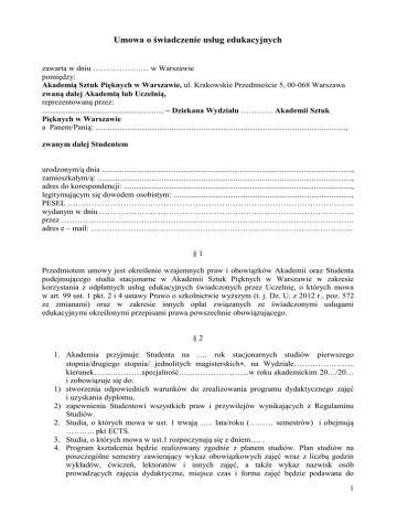 Umowa o świadczenie usług edukacyjnych zawarta w dniu ………………… w Warszawie pomiędzy: Akademią Sztuk Pięknych w Warszawie, ul. Krakowskie Przedmieście 5, 00-068 Warszawa zwaną dalej Akademią lub Uczelnią, reprezentowaną przez: ............................................................. – Dziekana Wydziału ………… Akademii Sztuk Pięknych w Warszawie a Panem/Panią: ............................................................................................................................., zwanym dalej Studentem urodzonym/ą dnia ............................................................................................................................., zamieszkałym/ą: ..............................................................................................................................., adres do korespondencji: .................................................................................................................., legitymującym się dowodem osobistym: ........................................................................................., PESEL ……………………………………………………………………………………………... wydanym w dniu …………………………………………………………………………………... przez ……………………………………………………………………………………………….. adres e – mail: ……………………………………………………………………………………... §1 Przedmiotem umowy jest określenie wzajemnych praw i obowiązków Akademii oraz Studenta podejmującego studia stacjonarne w Akademii Sztuk Pięknych w Warszawie w zakresie korzystania z odpłatnych usług edukacyjnych świadczonych przez Uczelnię, o których mowa w art. 99 ust. 1 pkt. 2 i 4 ustawy Prawo o szkolnictwie wyższym (t. j. Dz. U. z 2012 r., poz. 572 ze zmianami) oraz w zakresie innych opłat związanych ze świadczonymi usługami edukacyjnymi określonymi przepisami prawa powszechnie obowiązującego. §2 1. Akademia przyjmuje Studenta na …. rok stacjonarnych studiów pierwszego stopnia/drugiego stopnia/ jednolitych magisterskich, na Wydziale………………….. kierunek………………specjalność……………………...w roku akademickim 20…/20… i zobowiązuje się do: 1) stworzenia odpowiednich warunków do zrealizowania programu dydaktycznego zajęć i uzyskania dyplomu, 2) zapewnienia Studentowi wszystkich praw i przywilejów wynikających z Regulaminu Studiów. 2. Studia, o których mowa w ust. 1 trwają ….. lata/roku (……… semestrów) i obejmują ……….. pkt ECTS. 3. Studia, o których mowa w ust.1 rozpoczynają się z dniem…. . 4. Program kształcenia będzie realizowany zgodnie z planem studiów. Plan studiów na poszczególne semestry zawierający wykaz obowiązkowych zajęć wraz z liczbą godzin wykładów, ćwiczeń, lektoratów i innych zajęć, a także wykaz nazwisk osób prowadzących zajęcia dydaktyczne, miejsce czas i forma zajęć będzie podawana do 1 wiadomości Studenta przed rozpoczęciem każdego semestru na tablicy ogłoszeń wydziału oraz na stronie internetowej Uczelni: www.asp.waw.pl, w terminie przewidzianym w Regulaminie Studiów. 5 . Uczelnia zobowiązuje się do przesłania na adres e-mail Studenta, podany w niniejszej umowie, programu kształcenia oraz Uchwały nr………….. z dnia………..201… r. w sprawie……………………………………………………………………………………… …(tytuł uchwały, dotyczącej efektów kształcenia kierunku) w terminie do dnia …….. 201… r. 6. Po złożeniu przez Studenta egzaminu dyplomowego i spełnieniu przez Studenta wszystkich innych wymaganych warunków Akademia zobowiązuje się do wydania Studentowi dyplomu stwierdzającego ukończenie studiów I stopnia/II stopnia/ jednolitych magisterskich* i uzyskanie tytułu zawodowego………. licencjata/magistra sztuki*. §3 Student oświadcza, że zapoznał się z treścią Statutu Akademii Sztuk Pięknych w Warszawie, Regulaminu Studiów Akademii Sztuk Pięknych w Warszawie, Zarządzenia …………. z dnia ……………….. Rektora Akademii Sztuk Pięknych w Warszawie w sprawie wysokości opłat za świadczone usługi edukacyjne w roku akademickim ……….. oraz treścią Uchwały nr ……….. Senatu Akademii Sztuk Pięknych w Warszawie z dnia ……………… r. w sprawie zasad pobierania opłat za usługi edukacyjne oraz trybu i warunków zwalniania z tych opłat. §4 1. Student zobowiązuje się do: 1) przestrzegania obowiązujących w Akademii przepisów, w tym Regulaminu Studiów uchwał senatu, rad wydziału oraz zarządzeń Rektora, 2) terminowego wnoszenia opłat określonych w § 5 i § 6 umowy, 3) postępowania zgodnie ze złożonym ślubowaniem. §5 Student zobowiązuje się uiszczać na rzecz Uczelni opłaty za odpłatne usługi edukacyjne świadczone na rzecz studentów studiów stacjonarnych określone w ustawie z dnia 27 lipca 2005 r. Prawo o szkolnictwie wyższym (t. j. Dz. U. z 2012 r., poz. 572, z późn. zm.), przepisach wykonawczych do ww. ustawy oraz przepisach wewnętrznych obowiązujących w Akademii tj.: 1) opłatę za powtarzanie zajęć z powodu niezadowalających wyników w nauce, tj. opłatę za powtarzanie przedmiotu, semestru bądź roku studiów, 2) inne opłaty przewidziane przepisami prawa powszechnie obowiązującego związane z przebiegiem studiów, w tym opłaty za dokumenty związane z przebiegiem studiów takie jak: wydanie legitymacji studenckiej, indeksu, dyplomu oraz duplikatów wymienionych dokumentów. §6 1. Wysokość opłat, o których mowa w § 5 ustalona została Zarządzeniem nr ................... Rektora Akademii Sztuk Pięknych w Warszawie z dnia ... w sprawie wysokości opłat za świadczone usługi edukacyjne w roku akademickim ..... 2. Zasady pobierania opłat oraz tryb i warun