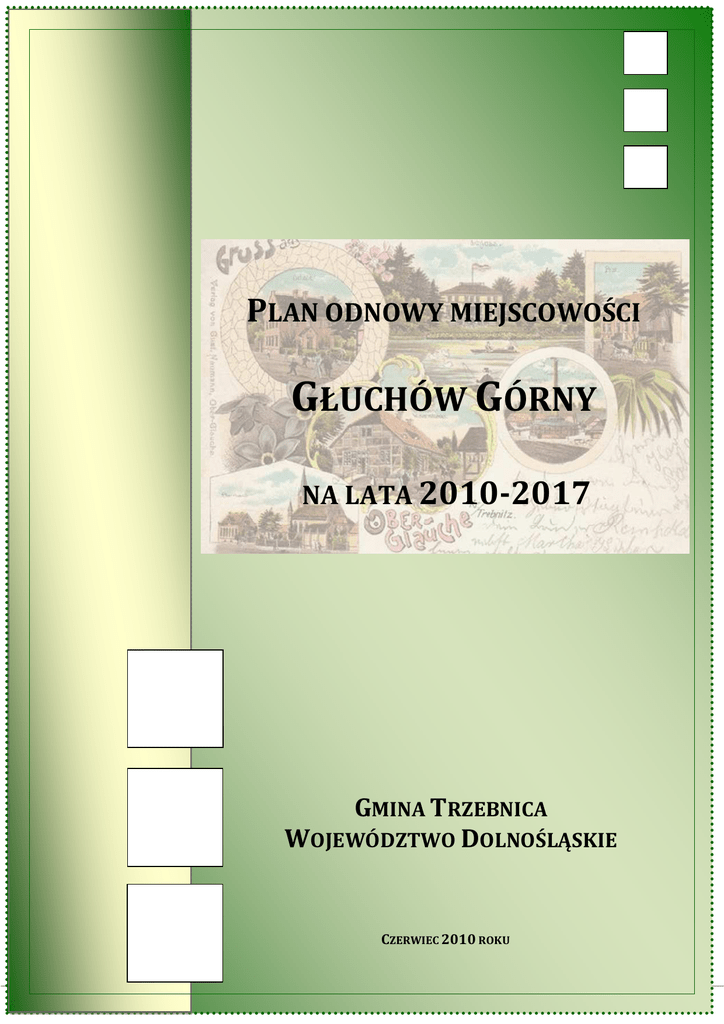 PLAN ODNOWY MIEJSCOWOŚCI GŁUCHÓW GÓRNY NA LATA 2010-2017 GMINA TRZEBNICA WOJEWÓDZTWO DOLNOŚLĄSKIE CZERWIEC 2010 ROKU 1 SPIS TREŚCI SPIS TREŚCI....................................................................................................................................................... 2 SPIS TABEL ....................................................................................................................................................... 2 SPIS RYSUNKÓW .............................................................................................................................................. 3 WSTĘP .............................................................................................................................................................. 4 STRUKTURA DOKUMENTU ............................................................................................................................... 5 1. CHARAKTERYSTYKA MIEJSCOWOŚCI ....................................................................................................... 6 1.1. 1.2. 1.3. 1.4. 1.5. 1.6. POŁOŻENIE MIEJSCOWOŚCI ......................................................................................................................... 6 PRZYNALEŻNOŚĆ ADMINISTRACYJNA ............................................................................................................. 7 POWIERZCHNIA ........................................................................................................................................ 8 LICZBA LUDNOŚCI ...................................................................................................................................... 8 HISTORIA MIEJSCOWOŚCI ............................................................................................................................ 9 STRUKTURA PRZESTRZENNA MIEJSCOWOŚCI.................................................................................................. 11 2. INWENTARYZACJA ZASOBÓW SŁUŻĄCYCH ODNOWIE MIEJSCOWOŚCI ...................................................... 13 2.1. 2.2. 2.3. 2.4. 2.5. 2.6. 2.7. ZASOBY PRZYRODNICZE ............................................................................................................................ 13 DZIEDZICTWO KULTUROWE ....................................................................................................................... 15 OBIEKTY I TERENY .................................................................................................................................... 18 INFRASTRUKTURA SPOŁECZNA .................................................................................................................... 19 INFRASTRUKTURA TECHNICZNA .................................................................................................................. 19 GOSPODARKA I ROLNICTWO ...................................................................................................................... 21 KAPITAŁ SPOŁECZNY................................................................................................................................. 23 3. OCENA MOCNYCH I SŁABYCH STRON MIEJSCOWOŚCI, W KTÓREJ BĘDZIE REALIZOWANA OPERACJA ........ 25 4. PLANOWANE KIERUNKI ROZWOJU........................................................................................................ 28 4.1. 4.2. 4.3. WIZJA MIEJSCOWOŚCI .............................................................................................................................. 29 CEL GŁÓWNY .......................................................................................................................................... 30 CELE SZCZEGÓŁOWE ................................................................................................................................ 30 4. PLANOWANE INWESTYCJE ......................................................................................................................... 32 5. SYSTEM WDRAŻANIA, MONITOROWANIA, OCENY ORAZ KOMUNIKACJI SPOŁECZNEJ .......................... 33 SPIS TABEL Tabela 1 Zestawienie powierzchni Głuchowa Górnego na tle innych jednostek administracyjnych ........................................................................................................................................... 8 Tabela 2 Liczba ludności Polski, województwa, powiatu, gminy i Głuchowa Górnego ....... 8 Tabela 3 Wykaz drzew pomnikowych w miejscowości Głuchów Górny. ............................... 15 Tabela 4 Stacja transformatorowa na terenie Głuchowa Górnego ........................................... 20 Tabela 5 Ujęcie wód podziemnych w miejscowości Głuchów Górny ....................................... 21 Tabela 6 Podmioty gospodarcze zarejestrowane na terenie miejscowości Głuchów Górny ............................................................................................................................................................................. 22 Tabela 8 Analiza SWOT .............................................................................................................................. 26 2 SPIS RYSUNKÓW Rysunek 1 Lokalizacja Głuchowa Górnego na tle kraju .................................................................... 6 Rysunek 2 Lokalizacja Głuchowa Górnego względem Trzebnicy................................................. 7 Rysunek 3 Liczba ludności miejscowości Głuchów Górny w latach 2005-2010 .................... 9 Rysunek 4 Układ przestrzenny miejscowości Głuchów Górny .................................................. 12 Rysunek 5 Kościół p.w. Podwyższenia Krzyża Świętego. ............................................................. 16 Rysunek 6 Jeden z domów na terenie dawnego folwarku............................................................ 17 Rysunek 7 Budynki folwarku w Głuchowie Górnym ..........