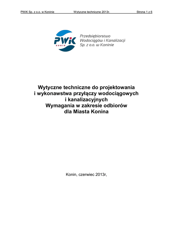 PWiK Sp. z o.o. w Koninie Wytyczne techniczne 2013r. Strona 1 z 6 Wytyczne techniczne do projektowania i wykonawstwa przyłączy wodociągowych i kanalizacyjnych Wymagania w zakresie odbiorów dla Miasta Konina Konin, czerwiec 2013r, PWiK Sp. z o.o. w Koninie Wytyczne techniczne 2013r. Strona 2 z 6 I. Przedmiot wytycznych Przedmiotem niniejszych wytycznych są: warunki, jakim powinny odpowiadać projekty techniczne przyłączy wodociągowych i kanalizacyjnych, uzgadniane w PWiK Sp. z o.o. Konin, wymagania jakościowe materiałów stosowanych do budowy przyłączy wod.-kan. , wymagania wykonawcze i odbiorowe przyłączy wod.-kan. Korzystanie z informacji zawartych w „Wytycznych” ułatwi projektowanie i uzgadnianie dokumentacji oraz przyczyni się do poprawy jakości przekazywanych do eksploatacji obiektów. Stosowanie „wytycznych” nie zwalnia z obowiązku przestrzegania przepisów, norm, instrukcji, zarządzeń branżowych i państwowych oraz właściwego wykorzystania wiedzy inżynierskiej. PWiK Sp. z o.o. w Koninie zastrzega sobie możliwość wprowadzenia zmian do niniejszych wytycznych, które będą aktualizowane w zależności od potrzeb i zmian obowiązujących aktów prawnych. II. Warunki projektowania Wykonanie przyłączenia nieruchomości do sieci wod - kan powinno odpowiadać przepisom ujętym w: Ustawie z dnia 7 czerwca 2001r. o zbiorowym zaopatrzeniu w wodę i zbiorowym odprowadzaniu ścieków Ustawie z dnia 7 lipca 1994r.; Prawo budowlane.; Dz.U. nr 156; poz. 1118 z roku 2006 (z późniejszymi zmianami) wraz z rozporządzeniami wykonawczymi do ww. ustawy. Wymagania Techniczna COBRTI INSTAL: Warunki techniczne wykonania i odbioru instalacji wodociągowych ( Zeszyt 7), Warunki techniczne wykonania i odbioru instalacji kanalizacyjnych ( Zeszyt 12). Podstawą do opracowania projektu technicznego przyłącza wod-kan są aktualne warunki techniczno-projektowe wydane przez nasze Przedsiębiorstwo. II.1. Przyłącze wodociągowe Przyłącze wodociągowe - odcinek przewodu łączącego sieć wodociągową z wewnętrzną instalacją wodociągową w nieruchomości odbiorcy usług wraz z zaworem za wodomierzem głównym. II.1.1.Wymagania ogólne Niedopuszczalnym jest bezpośrednie połączenie przyłącza wodociągowego zasilanego w wodę z sieci wodociągowej PWiK Spółka z o.o. w Koninie z urządzeniami zasilającymi instalacje z innych źródeł wody ( np. własne studnie, ujęcia). Wybudowane przyłącze wodociągowe jest odbierane i dopuszczane do eksploatacji przez PWiK Spółka z .o. w Koninie. Zakres eksploatacji przyłącza wodociągowego tj. rozdział granic eksploatacyjnych pomiędzy PWiK Spółka z o.o. w Koninie a Odbiorcą Usług będzie określony w protokóle odbioru technicznego i dopuszczenia do eksploatacji oraz umowie o dostarczaniu wody. Zasilanie placów budowy należy projektować poprzez przyłącza docelowe. Istniejące stare przyłącza mogą być wykorzystane dla potrzeb celów budowy, które po PWiK Sp. z o.o. w Koninie Wytyczne techniczne 2013r. Strona 3 z 6 jej zakończeniu należy zlikwidować oraz trwale odciąć od miejskiej sieci wodociągowej. Pobór wody dla zasilania placów budowy należy bezwzględnie opomiarować, poprzez lokalizacje wodomierza w studni wodomierzowej. II.1.2.Trasa przyłączy wodociągowych Nie projektować lokalizacji przyłączy wodociągowych pod wjazdami i bramami oraz pod wjazdami do garaży budynków wielorodzinnych. Przyłącza wodociągowe należy projektować prostopadle do sieci wodociągowej, w miarę możliwości bez załamań ich trasy. Przy projektowaniu przejścia przyłącza wodociągowego pod ławą fundamentową należy zachować odległość min. 1,0 m od narożnika budynku. Trasy przyłącza wodociągowego nie należy lokalizować wzdłuż skarpy. W przypadku budynków dwurodzinnych – bliźniaczych, w zabudowie segmentowej dopuszcza się zaprojektowanie jednego przyłącza wodociągowego dla dwóch segmentów pod warunkiem oddzielnego ich wprowadzenie do budynku i połączenia z instalacją wewnętrzną. II.1.3.Materiał, średnica , przykrycie, spadek, prędkość przepływu. Materiał : Do budowy przyłączy wodociągowych należy stosować : a).przewody z polietylenu PE -80 SDR 11 lub PE – 100 SDR 17, b).rury z żeliwa sferoidalnego z odpowiednio dobranym typem połączeń. Trasę przyłączy wodociągowych z rur PE HD należy oznaczyć taśmą lokalizacyjną z wkładką metalową, układaną na wysokości ok.0,30 cm nad przewodem. Materiały używane do budowy przyłączy wodociągowych powinny posiadać odpowiednie certyfikaty, aprobaty techniczne i świadectwa dopuszczenia do stosowania oraz atesty Państwowego Zakładu Higieny. Średnica Średnicę przyłącza wodociągowego należy dobierać w oparciu o przepływ obliczeniowy wody dla obiektu. Przy projektowaniu przyłącza wodociągowego dla celów bytowych oraz zabezpieczenia przeciwpożarowego, średnicę przyłącza należy dobrać w oparciu o większy przepływ. W projekcie należy przedłożyć bilans wody opracowany na podstawie jednostkowego zapotrzebowania wody na osobę/dobę, pracownika/zmianę, na ilość wytworzonego produktu itd. Wysokość przykrycia przyłącza wodociągowego Projektując zagłębienie przyłącza wodociągowego należy uwzględniać głębokość przemarzania gruntu. Na terenie miasta Konina należy przyjmować przykrycie ( odległość od rzędnej terenu do rzędnej wierzchu rury )-1,5 m. Przewody wodociągowe należy układać na gruncie posiadającym odpowiednią nośność lub z uwzględnieniem wymiany gruntu. Podsypkę i zasypkę należy wykonywać zgodnie z aktualnymi normami i instrukcjami producenta rur. PWiK Sp. z o.o. w Koninie Wytyczne techniczne 2013r. Strona 4 z 6 Spadek przyłącza i prędkość przepływu. Przyłącze wodociągowe należy projektować ze spadkiem w kierunku przewodu wodociągowego. W przypadku konieczności prowadzenia przyłącza z dużym spadkiem należy zwrócić uwagę, 