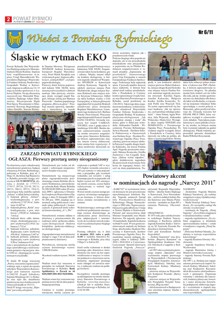 2 POWIAT RYBNICKI iRG NR 6(107) CZERWIEC 2011 www.irg.pl Nr 6/11 Śląskie w rytmach EKO Powiat Rybnicki Dni Województwa Śląskiego połączył z Metropolitalnym Dniem Rodziny. Impreza była współfinansowana m.in. przez Urząd Marszałkowski Województwa Śląskiego i Wojewódzki Fundusz Ochrony Środowiska i Gospodarki Wodnej w Katowicach. Impreza ta odbyła się 14 i 15 maja na boisku sportowym w Łukowie Śląskim. Swoją obecnością zaszczycili nas: Marszałek Województwa Śląskiego Adam Matusiewicz, Wicewojewoda Śląski Piotr Spyra, Wiceminister w Ministerstwie Rozwoju Regionalnego Adam Zdziebło, Starosta Rybnic- ki Damian Mrowiec, Wiceprezes WFOŚiGW Andrzej Konieczny, Europoseł Bogdan Marcinkiewicz, Poseł Marek Krząkała oraz wielu innych gości. Impreza odbyła się w „rytmach EKO”, czyli propagowała ekologię. Pierwszy dzień festynu poprowadził kabaret NOŁ NEJM, który utrzymywał wszystkich w dobrym nastroju. Jako pierwszy, otwierający dzień, wystąpił zespół Singers, którego solistą jest Mateusz Piecowski – finalista popularnego programu „Bitwa na głosy”. Przeboje muzyki operowej, operetkowej i musicalowej na wesoło przedstawił zespół Nastroje wraz z kabaretem NOŁ NEJM. Zorganizowano także liczne konkursy, gry i zabawy. Między innymi odbył się konkurs ekologiczny, w którym nagrody ufundował Wiceprezes WFOŚiGW w Katowicach Andrzej Konieczny. Nagrody te zdobyli: pierwsze miejsce Piotr Michałowski, drugie miejsce Szymon Bzdziuch oraz miejsce trzecie Krystyna Urbanowicz. Odbył się także konkurs wiedzy o Unii Europejskiej, w którym głównymi nagrodami był wyjazd do Brukseli ufundowany przez Europosła Bogdana Marcinkiewicza. Laureatami tego konkursu byli: Barbara Watoła i Piotr Górecki. Wręczenie nagród poprzedził koncert zespołu GANG OLSENA. Gwiazdą wieczoru był zespół CARRANTOUHILL wraz z grupą tańca irlandzkiego SALAKE. Bardzo dużym zainteresowaniem cieszyło się stoisko rowerowe zorganizowane przez Starostwo Rybnickie, na którym zaprezentowano między innymi rowery elektryczne, które można było wypożyczyć. Z takiej możliwości skorzystali za- ZARZĄD POWIATU RYBNICKIEGO OGŁASZA: Pierwszy przetarg ustny nieograniczony Na dzierżawę części zabudowanej nieruchomości gruntowej, będącej własnością Powiatu Rybnickiego, położonej w Rybniku, przy ul. 3 Maja 18, dla której Sąd Rejonowy w Rybniku prowadzi księgę wieczystą nr GL1Y/00150747/6, złożoną z działek nr 1775/17, 1776/17, 207/16, 231/10, 281/11, 282/11, 306/11, 307/11, 1916/11, stanowiącej byłą siedzibę szpitala „Juliusz” w skład, której wchodzą: 1) budynek główny „Juliusz”, trzykondygnacyjny, o pow. użytkowej 2.747,30 m2, kubaturze 16.607 m3 2) budynek główny „Rafał”, trzykondygnacyjny, o pow. użyt2 kowej 1.350,60 m , kubaturze 7.016 m3 3) budynek dawn. oddz. dermatologii, dwukondygnacyjny, o pow. użytkowej 621,50 m2, ku3 baturze 3.732 m 4) budynek kotłowni, jednokondygnacyjny, o pow. użytkowej 430,98 m2 , kubaturze 2.687 m3 5) budynek portierni, jednokondygnacyjny, o pow. użytkowej 9,90 m2, kubaturze 63 m3 wraz z przynależnym do niezbędnego i prawidłowego z nich korzystania gruntem o łącznej pow. około 8394 m2, obejmującym wymienione powyżej działki. W dziale III księgi wieczystej „Prawa, roszczenia i ograniczenia” widnieje wpis o wpisie do rejestru zabytków Województwa Katowickiego pod numerem rejestru A/1462/92 Zespół Zabudowy Szpitala Miejskiego Nr 1 w Rybniku oraz wpis dot. służebności gruntowej na rzecz każdoczesnych właścicieli działki nr 1915/11. Dział IV księgi wieczystej „Hipoteka” jest wolny od wpisów. Nieruchomość jest wolna od ob- większona o podatek VAT w wys. ciążeń i zobowiązań nieujawnio- 23% będzie wzrastała corocznie o nych w księdze wieczystej. 10% jej wartości w roku poprzednim, a przypadku, gdy wysokość Nieruchomość wg miejscowego wskaźnika cen towarów i usług planu zagospodarowania prze- konsumpcyjnych za poprzedni rok strzennego miasta Rybnika dla te- będzie wyższa niż 10% miesięczrenów Śródmieścia, zatwierdzone- nej stawki czynszu, czynsz będzie go uchwałą Rady Miasta Rybnika waloryzowany o wartość tego Nr 590/XLIII/2009 z dnia 30 wrze- wskaźnika. śnia 2009 r. ogłoszoną w Dzienni- Wzrost stawki czynszu nastąpi poku Urzędowym Województwa Ślą- cząwszy od miesiąca następująceskiego z dnia 25 listopada 2009 r. go po miesiącu, w którym dzierNr 208 poz. 3889, znajduje się w żawca zostanie zawiadomiony o terenach usług publicznych i tere- zmianie. nach usług publicznych i komercyjnych, w granicach strefy ochro- Wydzierżawiający zastrzega sobie ny konserwatorskiej „A” i „Wo”. możliwość podniesienia miesięcznego czynszu dzierżawnego, po Nieruchomość zostanie oddana w zakończeniu przez dzierżawcę dzierżawę z przeznaczeniem dla prac adaptacyjnych i remontorealizacji celów społeczno-eduka- wych, do wysokości stawek rynkocyjno-ekologicznych (budowa wych wycenionych przez biegłego kompleksu społeczno-edukacyj- rzeczoznawcę. no-ekologicznego). Przetarg odbędzie się w dniu Zagospodarowanie nieruchomości 4 sierpnia 2011 roku o godz. nastąpi w ciągu 5 lat od dnia pod- 11:00 w siedzibie Starostwa Popisania umowy dzierżawy. wiatowego w Rybniku, przy ulicy 3 Maja 31 w Sali nr 201. Wywoławcza, miesięczna stawka czynszu dzierżawnego wynosi: Jeżeli osoba wyłoniona w drodze 3.000,00 zł netto. przetargu jako dzierżawca nieruchomości nie stawi się bez uspraWysokość wadium wynosi: 300,00 wiedliwienia w miejscu i w termizł. nie podanym w stosownym zawiadomieniu, organizator przetargu Wadium może być wnoszone w może odstąpić od zawarcia umopieniądzu na rachunek Starostwa wy, a wpłacone wadium nie podlePowiatowego w Rybniku: Bank ga zwrotowi. Spółdzielczy w Żorach nr 44 8456 0009 2001 0023 9628 0006. Szczegółowe warunki przetargu, są udostępnione na stronie interneWadium 