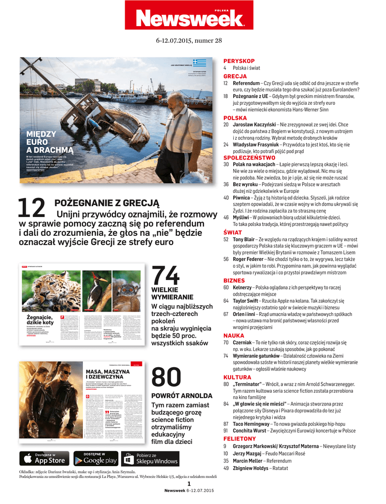 6-12.07.2015, numer 28 JAK URATOWAĆ GRECJĘ GRECKIE REFERENDUM ZATOPIONY KUTER na przystani w miejscowości Elefsina, 30 czerwca 2015 r. PERYSKOP 4 Polska i świat GRECJA 12 Referendum – Czy Grecji uda się odbić od dna jeszcze w strefie euro, czy będzie musiała tego dna szukać już poza Eurolandem? 18 Pożegnanie z UE – Gdybym był greckim ministrem finansów, już przygotowywałbym się do wyjścia ze strefy euro – mówi niemiecki ekonomista Hans-Werner Sinn POLSKA 20 Jarosław Kaczyński – Nie zrezygnował ze swej idei. Chce dojść do państwa z Bogiem w konstytucji, z nowym ustrojem i z ochroną rodziny. Wybrał metodę drobnych kroków 24 Władysław Frasyniuk – Przywódca to jest ktoś, kto się nie podlizuje, kto potrafi pójść pod prąd MIĘDZY EURO A DRACHMĄ SPOŁECZEŃSTWO DARIUSZ ĆWIKLAK, Ateny FOT. XXXXXXXXXXXXX FOT. MARKO DJURICA/REUTERS/FORUM W ten weekend Europa nauczyła się dwóch greckich słów: „oxi” (nie) i „nai” (tak). Niezależnie do wyniku referendum warto też na wszelki wypadek nauczyć się słówka „exodos”. 12 13 Newsweek 6- 1 2 .0 7.2 0 1 5 Newsweek 6 - 1 2. 07. 201 5 12 POŻEGNANIE Z GRECJĄ Unijni przywódcy oznajmili, że rozmowy w sprawie pomocy zaczną się po referendum i dali do zrozumienia, że głos na „nie” będzie oznaczał wyjście Grecji ze strefy euro NAUKA 74 WYMIERANIE GATUNKÓW Dzięcioł wielkodzioby Lampart amurski Działalność człowieka na Ziemi spowodowała szóste w historii naszej planety wielkie wymieranie gatunków – ogłosili właśnie naukowcy. KATARZYNA BURDA P nej niedawno encyklice wzywa do dbania o planetę i apeluje o powstrzymanie zmian klimatycznych. Dzięki papieżowi być może większe zainteresowanie wzbudzą wyniki raportu przedstawionego przez uczonych z trzech znanych uniwersytetów amerykańskich: Princeton, Stanford i Berkeley, którzy ogłosili, że Ziemia wchodzi właśnie w okres szóstego masowego wymierania w dziejach. Nazwali je wymieraniem holoceńskim, od nazwy epoki, w której żyjemy. FOT. EAST NEWS, KARL LEHMANN/LONELY PLANET IMAGES/GETTY IMAGES, JOHN CANCALOSI/ARDEA.COM/EAST NEWS Żegnajcie, dzikie koty ierwsze zapewne będą lamparty amurskie, przepiękne dzikie koty zamieszkujące śnieżne, niedostępne krainy północnej Rosji. Dziś pozostało ich najwyżej 40, a może nawet mniej, bo w 2007 r. zoologom udało się wytropić zaledwie 20 dorosłych osobników i kilka młodych. Potem kolej przyjdzie na nosorożce jawajskie i zachodniego goryla nizinnego, mieszkańca Afryki, jednego z najbliższych naszych krewnych. Jednych i drugich pozostało zaledwie po kilkadziesiąt sztuk. To tylko początek długiej listy gatunków zwierząt i roślin, z którymi pożegnamy się na zawsze w najbliższych dziesięcioleciach. Całe grupy fauny i flory znikają bowiem z powierzchni Ziemi zastraszająco szybko. Powagę sytuacji dostrzegł nawet sam papież Franciszek, który w ogłoszo- Los dinozaura Skąd naukowcy mają takie informacje? Z wieloletnich obserwacji zbieranych na całym świecie dotyczących liczebności poszczególnych gatunków roślin i zwierząt. – Wymieranie już się odbywa, z Ziemi zniknęły setki gatunków, a kolejne są krytycznie zagrożone – mówi w rozmowie Małpiatka z „Newsweekiem” prof. Gerardo Ceballos, szef zespołu przygotowującego raport. Oczywiście, liczba gatunków na Ziemi nie jest stała, zmieniają się również ich populacje, dlatego naukowców wcale nie dziwi, że jedne gatunki wymierają, a zamiast nich pojawiają się inne. Tak działa ewolucja. Jednak teraz sytuacja wygląda inaczej. Badacze obliczyli, że przy- Naukowcy z uniwersytetu w Berkeley wyliczyli, że od 1900 r. na Ziemi wymarło 400 gatunków kręgowców 74 75 Newsweek 6 -1 2 .0 7.2 0 1 5 KULTURA najmniej wśród kręgowców znikanie gatunków następuje aż 114 razy szybciej, niż dzieje się to zazwyczaj. Naukowcy z uniwersytetu w Berkeley wyliczyli też, że od 1900 roku na Ziemi wymarło 400 gatunków kręgowców. Dotychczas taka liczba gatunków zniknęła w ciągu 10 tysięcy lat. To gigantyczne przyspieszenie doprowadzi do wymarcia jednej szóstej wszystkich gatunków na Ziemi do końca tego stulecia. – Jeżeli pozwolimy, aby wymieranie postępowało, natura będzie potrzebowała milionów lat, aby ozdrowieć – ostrzega prof. Ceballos. Oczywiście, gatunki, które wymrą całkowicie, nigdy już nie powrócą. Obecna sytuacja nie jest dla naszej planety nowa. Potężne katastrofy pustoszące faunę i florę zdarzały się już wcześniej. Ostatnia z nich – wymieranie kredowe Newsweek 6-12 .07.2 015 TERMINATOR, KTÓRY ZDZIECINNIAŁ TERMINATOR, KTÓRY ZDZIECINNIAŁ KAROLINA PASTERNAK dyby tylko każdy polityk tak dotrzymywał słowa jak były gubernator Kalifornii Arnold Schwarzenegger! Zapowiedź „I’ll be back” padała z jego ust już nieraz i choć po czwartym z serii „Terminatorze: Ocaleniu” wydawało się, że szanse na ciąg dalszy są prawie żadne (film zebrał miażdżąco złe recenzje i poniósł sromotną finansową klęskę), 1 lipca nowy „Terminator: Genisys” trafił do kin. A z nim na ekrany wrócił 67-letni Arnie. To, że „Terminator” zalicza spektakularny come back właśnie teraz – spektakularny nie jest tu słowem na wyrost, bo budżet „Genisys” wyniósł 170 milionów dolarów, a we wstępnej fazie przygotowań są już dwie następne części – to nie przypadek. Pierwszy film z tej serii powstał w latach 80. Amerykanki wyszły wtedy z domów na przedmieściach, gdzie całymi dniami przyrządzały mężom kolacje z puszek Campbella, i śmiało ruszyły piąć się po szczeblach zawodowej kariery. Amerykanie uznali równe prawa obu płci. A w im mniejszym stopniu w prawdziwym życiu dominowali faceci i im mniejsza była ich władza w społeczeństwie, tym większe muskuły dawano im w filmach. To wtedy powstały takie klasyki kina akcji z masywnymi mięśniakami w rolach głównych, jak „Rambo”, „Ro