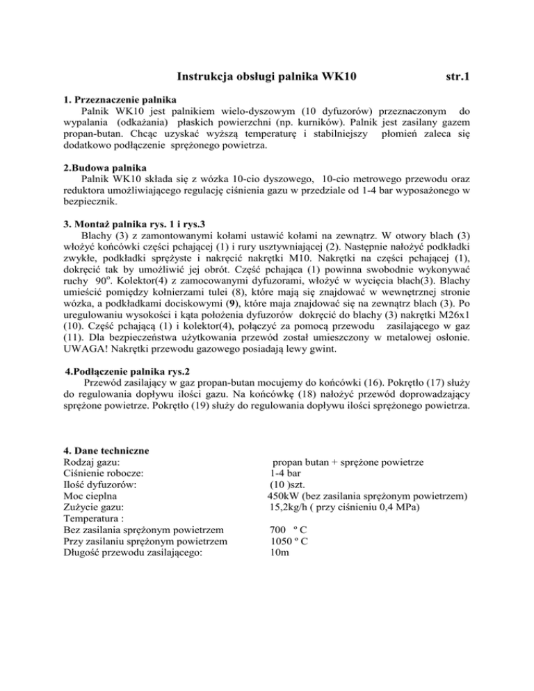 Instrukcja obsługi palnika WK10 str.1 1. Przeznaczenie palnika Palnik WK10 jest palnikiem wielo-dyszowym (10 dyfuzorów) przeznaczonym do wypalania (odkażania) płaskich powierzchni (np. kurników). Palnik jest zasilany gazem propan-butan. Chcąc uzyskać wyższą temperaturę i stabilniejszy płomień zaleca się dodatkowo podłączenie sprężonego powietrza. 2.Budowa palnika Palnik WK10 składa się z wózka 10-cio dyszowego, 10-cio metrowego przewodu oraz reduktora umożliwiającego regulację ciśnienia gazu w przedziale od 1-4 bar wyposażonego w bezpiecznik. 3. Montaż palnika rys. 1 i rys.3 Blachy (3) z zamontowanymi kołami ustawić kołami na zewnątrz. W otwory blach (3) włożyć końcówki części pchającej (1) i rury usztywniającej (2). Następnie nałożyć podkładki zwykłe, podkładki sprężyste i nakręcić nakrętki M10. Nakrętki na części pchającej (1), dokręcić tak by umożliwić jej obrót. Część pchająca (1) powinna swobodnie wykonywać ruchy 90o. Kolektor(4) z zamocowanymi dyfuzorami, włożyć w wycięcia blach(3). Blachy umieścić pomiędzy kołnierzami tulei (8), które mają się znajdować w wewnętrznej stronie wózka, a podkładkami dociskowymi (9), które maja znajdować się na zewnątrz blach (3). Po uregulowaniu wysokości i kąta położenia dyfuzorów dokręcić do blachy (3) nakrętki M26x1 (10). Część pchającą (1) i kolektor(4), połączyć za pomocą przewodu zasilającego w gaz (11). Dla bezpieczeństwa użytkowania przewód został umieszczony w metalowej osłonie. UWAGA! Nakrętki przewodu gazowego posiadają lewy gwint. 4.Podłączenie palnika rys.2 Przewód zasilający w gaz propan-butan mocujemy do końcówki (16). Pokrętło (17) służy do regulowania dopływu ilości gazu. Na końcówkę (18) nałożyć przewód doprowadzający sprężone powietrze. Pokrętło (19) służy do regulowania dopływu ilości sprężonego powietrza. 4. Dane techniczne Rodzaj gazu: Ciśnienie robocze: Ilość dyfuzorów: Moc cieplna Zużycie gazu: Temperatura : Bez zasilania sprężonym powietrzem Przy zasilaniu sprężonym powietrzem Długość przewodu zasilającego: propan butan + sprężone powietrze 1-4 bar (10 )szt. 450kW (bez zasilania sprężonym powietrzem) 15,2kg/h ( przy ciśnieniu 0,4 MPa) 700 º C 1050 º C 10m Zawory główne palnika WK10/D4 Rys.2 Poz. 16 17 18 19 Nazwa Końcówka 1 zaworu głównego Pokrętło 1 Końcówka 2 zaworu głównego Pokrętło Str3 Str4 PALNIK WK10 1 3 11 8 2 3 10 4 Rys.3