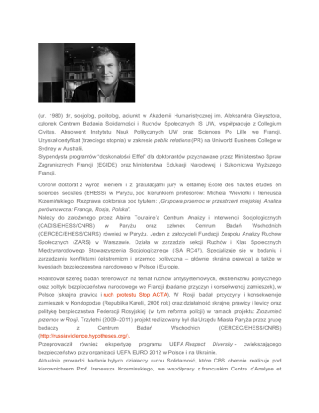 (ur. 1980) dr, socjolog, politolog, adiunkt w Akademii Humanistycznej im. Aleksandra Gieysztora, członek Centrum Badania Solidarności i Ruchów Społecznych IS UW, współpracuje z Collegium Civitas. Absolwent Instytutu Nauk Politycznych UW oraz Sciences Po Lille we Francji. Uzyskał certyfikat (trzeciego stopnia) w zakresie public relations (PR) na Uniworld Business College w Sydney w Australii. Stypendysta programów “doskonałości Eiffel” dla doktorantów przyznawane przez Ministerstwo Spraw Zagranicznych Francji (EGIDE) oraz Ministerstwa Edukacji Narodowej i Szkolnictwa Wyższego Francji. Obronił doktorat z wyróz nieniem i z gratulacjami jury w elitarnej École des hautes études en sciences sociales (EHESS) w Paryżu, pod kierunkiem profesorόw: Michela Wieviorki i Ireneusza Krzemińskiego. Rozprawa doktorska pod tytułem: „Grupowa przemoc w przestrzeni miejskiej. Analiza porównawcza: Francja, Rosja, Polska”. Należy do założonego przez Alaina Touraine’a Centrum Analizy i Interwencji Socjologicznych (CADIS/EHESS/CNRS) w Paryżu oraz członek Centrum Badań Wschodnich (CERCEC/EHESS/CNRS) również w Paryżu. Jeden z założycieli Fundacji Zespołu Analizy Ruchów Społecznych (ZARS) w Warszawie. Działa w zarządzie sekcji Ruchów i Klas Społecznych Międzynarodowego Stowarzyszenia Socjologicznego (ISA RC47). Specjalizuje się w badaniu i zarządzaniu konfliktami (ekstremizm i przemoc polityczna – głównie skrajna prawica) a także w kwestiach bezpieczeństwa narodowego w Polsce i Europie. Realizował szereg badań terenowych na temat ruchów antysystemowych, ekstremizmu politycznego oraz polityki bezpieczeństwa narodowego we Francji (badanie przyczyn i konsekwencji zamieszek), w Polsce (skrajna prawica i ruch protestu Stop ACTA). W Rosji badał przyczyny i konsekwencje zamieszek w Kondopodze (Republika Karelii, 2006 rok) oraz działalność skrajnej prawicy i lewicy oraz politykę bezpieczństwa Federacji Rosyjskiej (w tym reforma policji) w ramach projektu: Zrozumieć przemoc w Rosji. Trzyletni (2009–2011) projekt realizowany był dla Urzędu Miasta Paryża przez grupę badaczy z Centrum Badań Wschodnich (CERCEC/EHESS/CNRS) (http://russiaviolence.hypotheses.org/). Przeprowadził również ekspertyzę programu UEFA Respect Diversity - zwiększającego bezpieczeństwo przy organizacji UEFA EURO 2012 w Polsce i na Ukrainie. Aktualnie prowadzi badanie byłych działaczy ruchu Solidarność, które CBS obecnie realizuje pod kierownictwem Prof. Ireneusza Krzemińskiego, we współpracy z francuskim Centre d’Analyse et d’Intervention Sociologiques (CADIS/EHESS) w Paryżu. Celem projektu badawczego jest powtórzenie grupy interwencji socjologicznej z uczestnikami „historycznej” interwencji, którą realizował w 1981 roku Zespoł francuskiego socjologa Alaina Touraina. (Solidarność: analiza ruchu społecznego 1980-1981 / Alain Touraine, Gdańsk ,Europejskie Centrum Solidarności, 2010). Przez trzy lata pełnił funkcję menedżera badań interaktywnych w Communication Service Sp. z.o.o, realizując szereg badań i konsultacji dla takich firm jak NIKE, Deloitte czy PZU. Wybrane publikacje (publikuje w języku polskim, angielskim, francuskim i rosyjskim): 2015 Violences urbaines. Une comparaison: France, Russie, Pologne, PAF, s. 356. “Jak skrajna prawica budzi się w Europie (wschodniej)”, w: Europa Środkowo-Wschodnia. Transformacje-integracja-rewolucja, Krytyka Polityczna/Fundacja im. Róży Luksemburg (s. 23, w opracowaniu) “Le mouvement anti-ACTA en Pologne: la suite du réveil civic des jeunes dans le monde d’aujourd’hui”, in: Le grand écart: la sociologie du sujet au global. Autour de Michel Wieviorka, Robert Laffont, Paryż (s. 11, w opracowaniu), “Young Nationalist Poland. Polish resonance of the far-right in the contemporary Europe”, in: Social Movements in Central and Eastern Europe, Amsterdam University Press (s. 16, w opracowaniu) „Solidarność w Zagłębiu Miedziowym”, w: Solidarność – doświadczenie i pamięć II, Europejskie Centrum Solidarności, Gdańsk, (s. 26, w opracowaniu) 2014 „Kim są i jak działali ACTA-wiści?”, w: Obywatele ACTA, Europejskie Centrum Solidarności, Gdańsk, 2014, s.112-145. „Metodologiceskie preimusiestwa naucnewo zatrudnicestwa w epohu globalizacji”, w: Mezdynarodnyje zatrudnicectwo w sfere nauki i obrazowanja, Uniwersytet Kalingradzki/ISM WDiNP UW, 2014, s.11-14. 2013 „Radykalna młodzież testem dla społeczeństwa”, Debaty Otwartej Rzeczpospolitej: Organizacje skrajne w demokratycznym państwie i społeczeństwie, 2013, Warszawa, s. 86-92. „Podsumowanie dyskusji w grupie – Pamięć i przyszłość”, s. 17-30, w: Raport z konsultacji eksperckich na temat misji i funkcji Europejskiego Centrum Solidarności w Gdańsku, lipiec, CBOS, Warszawa 2012 „Respect Diversity – Football Unites. The FARE Networ’s Programme of Activities at Euro 2012. Evaluation Report, FARE/UEFA, sierpień, s. 45. „Radykalizacja demokratycznych miast”, Debaty Fundacji im. Stefana Batorego, lipiec 2012 , Warszawa, s. 14-16. „Piłkarski stadion: współczesny bastion rosyjskich radykalnych”, Nigdy Więcej, wiosna 2012, nr (20), numer specjalny poświęcony UEFA/EURO 2012 w Polsce i na Ukrainie, s. 34-35. 2011 „Grupowa przemoc: testem dla lokalnego środowiska społecznego. Analiza porównawcza: Francja, Rosja, Polska”, Animacja Życia Publicznego, nr 3 (6), 2011. „Russian Radical Nationalist Interpretation of the French Riots of November 2005”, Demokratizatsiya, the Journal of Post-Soviet Democratization (USA), vol. 19, nr 3, lato 2011, s. 277-285. 2010 „L’analyse comparative des violences collectives dans l’espace urbain : France, Russie, Pologne”, Cycnos, vol. 27, nr 1, 2011, s. 25-37. 2009 „Przemoc testem demokracji”, Realia, (dwumiesięcznik społeczno-polityczny) (wywiad opracowała Eliza Czapska), luty, nr 1 (10), 2009, s. 157-165. 2008 „Metodologiczne podsta