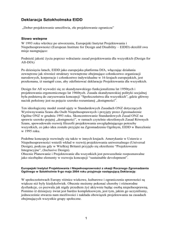 Deklaracja Sztokholmska EIDD „Dober projektowanie umożliwia, złe projektowanie ogranicza” Slowo wstepne W 1993 roku wkrótce po utworzeniu, Europejski Instytut Projektowania i Niepełnosprawności (European Institute for Design and Disability – EIDD) określił swa misje następująco: Podnieść jakość życia poprzez wdrażanie zasad projektowania dla wszystkich (Design for All-DfA) Po dziesięciu latach, EIDD jako europejska platforma DfA, włączając działania zewnętrzne jak również struktury wewnętrzne obejmujące członkostwo organizacji narodowych, korporacje i członkostwo indywidualne w 16 krajach europejskich, jest przekonana, iż nastąpił czas, aby zdefiniować deklaracje Projektowania dla wszystkich. Design for All wywodzi się ze skandynawskiego funkcjonalizmu lat 1950tych i projektowania ergonomicznego lat 1960tych. Zasada skandynawskiej polityki socjalnej była podstawą do zarysowania koncepcji “Społeczeństwa dla wszystkich”, gdzie główny nacisk położony jest na pojęcie szeroko rozumianej „dostępności”. Ten ideologiczny model został ujęty w Standardowych Zasadach ONZ dotyczących Wyrównywania Szans dla Osób Niepełnosprawnych i przyjęty przez Zgromadzenie Ogólne ONZ w grudniu 1993 roku. Skoncentrowanie Standardowych Zasad ONZ na sprawie szeroko pojętej „dostępności”, w ramach czytelnie określonych Zasad Równych Szans, spowodowało rozwój filozofii projektowania uwzględniającego potrzeby wszystkich, co jako idea zostało przyjęte na Zgromadzeniu Ogólnym, EIDD w Barcelonie w 1995 roku. Podobne koncepcje rozwinęły się także w innych krajach. Amerykanie w Ustawie o Niepełnosprawności wnieśli wkład w rozwój projektowania uniwersalnego (Universal Design), podczas gdy w Wielkiej Britanii przyjęło się określenie “Projektowanie Integracyjne”, (Inclusive Design). Obecnie Planowanie i Projektowanie dla wszystkich jest powszechnie rozpoznawalne jako niezbędne elementy w rozwoju koncepcji “sustainable development”. Europejski Instytut Projektowania i Niepełnosprawności z okazji Rocznego Zgromadzenia Ogólnego w Sztokholmie 9-go maja 2004 roku przyjmuje następującą Deklarację: W społeczeństwach Europy różnice wiekowe, kulturowe i ograniczenia sprawności są większe niż były kiedykolwiek. Obecnie możemy pokonać choroby i różnorodne dysfunkcje, co pozwala jak nigdy przedtem żyć aktywnie będąc osobą niepełnosprawną. Pomimo iż dzisiejszy świat jest bardzo kompleksowym, jest tym, jakim go uczynilismy, jednocześnie stwarza nam możliwości i nakłada obowiązek projektowania na zasadach obejmujących wszystkie grupy społeczne. 1 Projektowanie dla wszystkich jest projektowaniem biorącym pod uwagę różnorodność potrzeb ludzkich, uczestniczenie w życiu społecznym i równouprawnienie. To holistyczne i nowatorskie podejście stwarza twórcze i etyczne wyzwanie dla projektantów, developerów, administratorów i polityków. Celem Projektowania dla waszystkich jest stworzenie wszystkim ludziom równych szans brania udziału we wszystkich dziedzinach życia. Aby cel ten został osiągnięty, otaczająca nas architektura, przedmioty codziennego użytku, usługi, kultura i informacja- krótko mówiąc, wszystko co jest wyprodukowne przez ludzi i dla ludzi - musi być dostępne i przystosowane dla każdej osoby w naszym społeczeństwie z możliwością adoptacji do zmian jakie progresywnie następują u każdego człowieka. Zastosowanie zasad Projektowania dla wszystkich zmusza do świadomego analizowania ludzkich potrzeb i aspiracji oraz wymaga zaangażowania użytkownika na wszystkich etapach procesu projektowego. Europejski Instytut Projektowania i Niepełnosprawności wzywa instytucje na szczeblu europejskim, państwowym, regionalnym i władz lokalnych, a także jednostki na szczeblu społecznym i gospodarczym, aby podjeli odpowiednie kroki w ich polityce i działaniach, w celu wdrożenia zasad Projektowania dla Wszystkich. 2