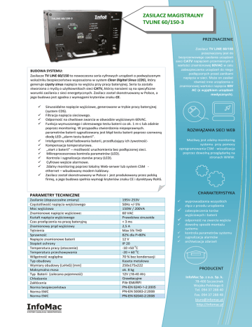 ZASILACZ MAGISTRALNY TVLINE 60/150-3 PRZEZNACZENIE BUDOWA SYSTEMU: Zasilacze TV LINE 60/150 to nowoczesna seria cyfrowych urządzeń o podwyższonym wskaźniku bezpieczeństwa wyposażona w system Clear Digital Sinus (CDS), który generuje czysty sinus napięcia na wyjściu przy pracy bateryjnej. Seria ta została stworzona z myślą o użytkownikach sieci CATV, którzy narażeni są na specyficzne warunki zasilania z sieci energetycznych. Zasilacz został skonstruowany w Polsce, a jego budowa jest zgodna z wymogami kryteriów znaku CE. Sinusoidalne napięcie wyjściowe, generowane w trybie pracy bateryjnej (system CDS). Filtracja napięcia sieciowego. Odporność na chwilowe zwarcia w obwodzie wyjściowym 60VAC. Funkcja wymuszonego i okresowego testu baterii co ok. 1 m-c lub zdalnie poprzez monitoring. W przypadku stwierdzenia niepoprawnych. parametrów baterii sygnalizowany jest błąd testu baterii poprzez czerwoną diodę LED-„alarm testu baterii”. Inteligentny układ ładowania baterii, przedłużający ich żywotnośćKompensacja temperaturowa. „start z baterii” – możliwość uruchomienia bez podłączonej sieci. Mikroprocesorowa kontrola parametrów (LED). Kontrola i sygnalizacja stanów pracy (LED). Cyfrowe wejście alarmowe. Zdalny monitoring poprzez lokalny Web-serwer lub system CSM ethernet – wbudowany modem kablowy. Zasilacz został skonstruowany w Polsce i jest produkowany przez polską firmę, a jego budowa spełnia wymogi kryteriów znaku CE i dyrektywy RohS. Zasilacz TV LINE 60/150 przeznaczony jest do bezprzerwowego zasilania urządzeń sieci CATV napięciem przemiennym o wartości znamionowej 60VAC w celu zabezpieczenia urządzeń do niego podłączonych przed zanikami napięcia w sieci. Może on zasilać również inne urządzenia o znamionowej wartości napięcia 60V AC (z wyjątkiem urządzeń medycznych). ROZWIĄZANIA SIECI WEB Możliwy jest zdalny monitoring systemu przy pomocy oprogramowania CSM - wizualizacja poprzez dowolną przeglądarkę na stronach WWW. CHARAKTERYSTYKA PARAMETRY TECHNICZNE Zasilanie (dopuszczalne zmiany) Częstotliwość napięcia wejściowego Moc wyjściowa Znamionowe napięcie wyjściowe: Kształt napięcia wyjściowego Czas przełączenia na pracę bateryjną Znamionowy prąd wyjściowy Tętnienia Sprawność Napięcie znamionowe baterii Stopień ochrony Temperatura pracy (otoczenie) Temperatura przechowywania Wilgotność względna Typ obudowy Wymiary obudowy (LxHxG) [mm] Maksymalna masa Typ Baterii (zalecana pojemność) Chłodzenie Zakłócenia Norma bezpieczeństwa Norma EMC Norma EMC 195V-253V 50Hz +/-5% 150W / 200VA 60 VAC Prawdziwa sinusoida < 3 ms 2,5 A Max 5% THD 82% dla P>80% 12 V IP 20 0 -10 +50 C 0 -20 + 60 C 70 % bez kondensacji Kaseta metalowa 250x175x222 ok. 8 kg 12V (18-40 Ah) Grawitacyjne Filtr EMI/RFI PN-EN 6240-1-2:2005 PN-EN 50083-2:2008 PN-EN 62040-2:2008 wyprowadzenia wszystkich złącz z przodu urządzenia zabezpieczenia torów wyjściowych i baterii odporność na zwarcia wyjścia dowolny sposób montażu systemu kontrola parametrów systemu sygnalizacja alarmów archiwizacja zdarzeń PRODUCENT InfoMac Sp. z o.o. Sp. k. 78-400 Szczecinek Wojska Polskiego 6 Tel. 094 37 288 40 Fax. 094 37 288 48 [email protected] http://infomac.pl