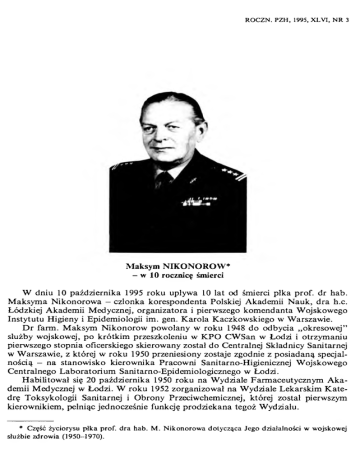 ROCZN. PZH, 1995, XLVI, NR 3 Maksym NIKONOROW* - w 10 rocznicę śmierci W dniu 10 października 1995 roku upływa 10 lat od śmierci płka prof, dr hab. Maksyma Nikonorowa - członka korespondenta Polskiej Akademii Nauk, dra h.c. Łódzkiej Akademii Medycznej, organizatora i pierwszego komendanta Wojskowego Instytutu Higieny i Epidemiologii im. gen. Karola Kaczkowskiego w Warszawie. D r farm. Maksym Nikonorow powołany w roku 1948 do odbycia „okresowej” służby wojskowej, po krótkim przeszkoleniu w KPO CWSan w Łodzi i otrzymaniu pierwszego stopnia oficerskiego skierowany został do Centralnej Składnicy Sanitarnej w Warszawie, z której w roku 1950 przeniesiony zostaje zgodnie z posiadaną specjal nością - na stanowisko kierownika Pracowni Sanitarno-Higienicznej Wojskowego Centralnego Laboratorium Sanitarno-Epidemiologicznego w Łodzi. Habilitował się 20 października 1950 roku na Wydziale Farmaceutycznym A ka demii Medycznej w Łodzi. W roku 1952 zorganizował na Wydziale Lekarskim Kate drę Toksykologii Sanitarnej i Obrony Przeciwchemicznej, której został pierwszym kierownikiem, pełniąc jednocześnie funkcję prodziekana tegoż Wydziału. * Część życiorysu płka prof, d ra hab. M. N ikonorow a dotycząca Jego działalności w wojskowej służbie zdrowia (1950-1970). 214 Nr 3 W roku 1954 nadany Mu został tytuł naukowy profesora nadzwyczajnego, a w rok później po przeniesieniu Wojskowego Centralnego Laboratorium Sanitarno-Higienicznego (WCLSH) do Warszawy powierzono Mu kierownictwo tej placówki. Przeniesienie WCLSH do Warszawy łączyło się ze znacznymi zmianami obsady personalnej, prawie cały personel cywilny pozostał w Łodzi, odeszła znaczna część doświadczonej kadry (Stanisław Celiński, Jan Kozłowski, Walenty Lewkowski, M a rian Lesisz, Jerzy Łyszczarz, Leonard Żyłko) i tylko nieliczni pozostali z czasów łódzkich: Julian Biel, Marek Diechtiar, Zenon Hendrich, Józef Kubica i Bronisław Szczerbiński. W tym to czasie ppłk prof, dr hab. Maksym Nikonorow organizował Centralne Laboratorium na nowym miejscu z uwzględnieniem aktualnych potrzeb wojskowej służby zdrowia w dziedzinie badań naukowych i prac usługowych dla celów profilaktyki w wojsku. Pomieszczenia biurowe i magazynowe - pozostawione po Centralnej Składnicy Sanitarnej na Powązkach - zostały zaadaptowane na labo ratoria i pracownie specjalistyczne, które wyposażono w odpowiedni sprzęt i apara turę. W tym czasie płk prof. Nikonorow dokonał doboru nowej młodej kadry nauko wej. Do WCLSH zostali skierowani młodzi oficerowie, część z nich ze stopniami doktorów: Stanisław Bitny-Szlachto, Jerzy Dyjak, Stanisław Homorowski, Wiesław Gall, Tadeusz Kisieliński, Stefan Klonowicz, Jan Kosiński, Stanisław Kwiek, Zbigniew Piechucki, Jerzy Rdzanek, Andrzej Rogoziński, Zbigniew Żółtkowski i inni. W lutym 1957 roku WCLSH przeszło na nowy etat zbliżony do placówki nauko wo-badawczej z podziałem na zakłady i pracownie. Celem przyspieszenia rozwoju młodej kadry naukowej Instytutu - płk prof, dr Nikonorow - pozyskał współpracę wybitnych specjalistów naukowych w zakresie: epidemiologii, mikrobiologii, higieny pracy, patofizjologii i radiobiologii (prof. Jan Kostrzewski, prof. Ludwik Rzucidło, prof. M aria Boguszewska, prof. Jan Ryżewski, prof. Edward Kowalski, prof. Władysław Jasiński). W wyniku podjętych przez płk prof, dr hab. Maksyma Nikonorowa działań, w tym okresie kilku pracowników Instytutu habilitowało się (Stanisław Bitny-Szlachto, Stefan Klonowicz, Tadeusz Kisieliński, Zbigniew Żółtowski) oraz kilku nastu uzyskało stopień naukowy doktora, a - na XV-lecie istnienia placówki - zarzą dzeniem ministra obrony narodowej z dnia 10 lutego 1960 r. WCLSH przekształ cono w Wojskowy Instytut Higieny i Epidemiologii. W wyniku podjętych przez prof. Nikonorowa starań - na teren Wojskowego Instytutu Higieny i Epidemiologii (po renowacji) przeniesiono z ul. Powązkowskiej obelisk gen. Karola Kaczkowskiego - szefa służby zdrowia Wojska Polskiego z czasów Powstania Listopadowego. 20 czerwca 1960 roku, w dniu uroczystego odsłonięcia obelisku, Wojskowemu Insty tutowi nadano imię Tego wybitnego Lekarza - Polaka pierwszego organizatora wojskowej służby zdrowia. W roku 1963 Instytutowi nadany został statut wojskowej placówki naukowej i powołana została Rada Naukowa. Na wniosek płka prof, dra M. Nikonorowa, na przewodniczącego Rady powołany został członek rzeczywisty PAN prof, dr hab. Edmund Mikulaszek - pierwszy kierownik i organizator tej placówki z cza sów II Wojny Światowej. W wyniku rozwoju kadry naukowej, komendant Instytutu - prof, dr hab. M. Nikonorow - wystąpił do Rady Ministrów o przyznanie Instytutowi uprawnień do nadawania stopni naukowych: doktora nauk medycznych, doktora nauk far Nr 3 215 maceutycznych i doktora nauk przyrodniczych. Uchwalą Rady Ministrów z 22 stycz nia 1964 roku takie uprawnienia zostały Instytutowi przyznane. W latach 1960-1963 pik prof, dr Maksym Nikonorow przewodniczy! Radzie Naukowej przy Szefie Departamentu Służby Zdrowia MON, pozostając do roku 1969 członkiem prezydium tej Rady. Od 1969 pozostawał członkiem prezydium Rady ds. Medycyny i Farmacji Wojskowej. Znaczący dorobek naukowy płk prof. M. Nikonorowa oraz jego działalność dy daktyczna i osiągnięcia organizacyjne stanowiły podstawę do wystąpienia przez Radę Naukową WIHiE z wnioskiem o nadanie Mu tytułu naukowego profesora zwyczaj nego. Tytuł ten został Mu nadany w roku 1965, a w cztery lata później Zgromadzenie Ogólne Polskiej Akademii Nauk Uchwałą z 16 maja 1969 roku powołało Go na członka korespondenta Polskiej Akademii Nauk. W latach 1962-1970 - w ramach Rady Wyższego Szkolnictwa Wojskowego - przewodniczył Komisji Organizacyjnej ds. instytutów wojskowych. Profesor był wybitnym specjalistą w zakresie bromatologii i toksykologii, o du żym autorytecie w kraju i w świecie, redaktorem i współautorem wiel