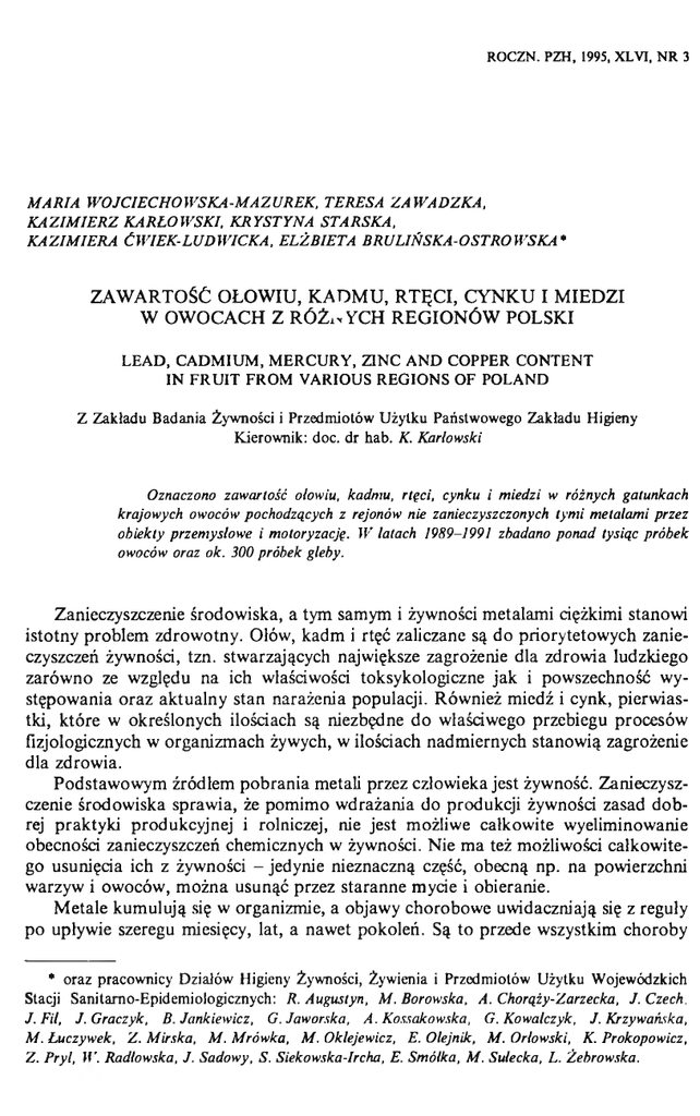 ROCZN. PZH, 1995, XLVI, NR 3 M A R IA W O JC IE C H O W SK A -M A Z U R E K , TE R E SA Z A W A D Z K A , K A Z IM IE R Z K A R Ł O W S K I, K R Y S T Y N A S T A R S K A , K A Z IM IE R A Ć W IE K -LU D W IC K A , E L Ż B IE T A B R U L IŃ S K A -O S T R O W S K A * ZAWARTOŚĆ OŁOWIU, KADMU, RTĘCI, CYNKU I M IEDZI W OWOCACH Z RÓŻNYCH REGIONÓW POLSKI LEA D , C A D M IU M , M E R C U R Y , ZIN C A N D CO PPER CON TEN T IN F R U IT FR O M V ARIOUS R E G IO N S O F POLAND Z Zakładu B adania Żywności i Przedmiotów Użytku Państwowego Zakładu Higieny Kierownik: doc. dr hab. K. Karłowski Oznaczono zawartość ołowiu, kadmu, rtęci, cynku i miedzi w różnych gatunkach krajowych owoców pochodzących z rejonów nie zanieczyszczonych tym i metalami przez obiekty przemysłowe i motoryzację. W latach 1989-1991 zbadano ponad tysiąc próbek owoców oraz ok. 300 próbek gleby. Zanieczyszczenie środowiska, a tym samym i żywności metalami ciężkimi stanowi istotny problem zdrowotny. Ołów, kadm i rtęć zaliczane są do priorytetowych zanie czyszczeń żywności, tzn. stwarzających największe zagrożenie dla zdrowia ludzkiego zarówno ze względu na ich właściwości toksykologiczne jak i powszechność wy stępowania oraz aktualny stan narażenia populacji. Również miedź i cynk, pierwias tki, które w określonych ilościach są niezbędne do właściwego przebiegu procesów fizjologicznych w organizmach żywych, w ilościach nadmiernych stanowią zagrożenie dla zdrowia. Podstawowym źródłem pobrania metali przez człowieka jest żywność. Zanieczysz czenie środowiska sprawia, że pomimo wdrażania do produkcji żywności zasad dob rej praktyki produkcyjnej i rolniczej, nie jest możliwe całkowite wyeliminowanie obecności zanieczyszczeń chemicznych w żywności. Nie ma też możliwości całkowite go usunięcia ich z żywności - jedynie nieznaczną część, obecną np. na powierzchni warzyw i owoców, można usunąć przez staranne mycie i obieranie. Metale kumulują się w organizmie, a objawy chorobowe uwidaczniają się z reguły po upływie szeregu miesięcy, lat, a nawet pokoleń. Są to przede wszystkim choroby * oraz pracownicy Działów Higieny Żywności, Żywienia i Przedmiotów Użytku Wojewódzkic Stacji Sanitarno-Epidemiologicznych: R. Augustyn, M . Borowska, A. Chorąży-Zarzecka, J. Czech, J. Fil, J. Graczyk, B. Jankiewicz, G. Jaworska, A. Kossakowska, G. Kowalczyk, J. Krzywańska, M . Łuczywek, Z . Mirska, M . Mrówka, M . Oklejewicz, E. Olejnik, M . Orłowski, K. Prokopowicz, Z. Prył, W. Radlowska, J. Sadowy, S. Siekowska-Ircha, E. Smółka, M . Sułecka, L. Żebrowska. 224 M . W ojciechowska-M azurek i in. Nr 3 sercowo-naczyniowe, nerek, układu nerwowego, kostnego, nieprawidłowy rozwój dzieci, zmiany mutagenne i teratogenne, alergie, jak również choroby nowotworowe. Międzynarodowa Agencja ds. Badań nad Rakiem (IARC) zaliczyła w 1993 r. kadm i jego sole do grupy I - substancji rakotwórczych dla człowieka [8]. Komitet Ekspertów FAO/WHO d/s Substancji Dodatkowych do Żywności, zajmują cy się również zanieczyszczeniami, obniżył w 1993 r. wartość PTWI - ustalonego tymczasowo tolerowanego przez człowieka pobrania tygodniowego dla ołowiu do 2 5 /ig/kg masy ciała, czyli do wartości równej przyjętej w 1986 r. dla dzieci [13, 19]. Ustalona w r. 1972 wartość PTWI dla osób dorosłych była dwukrotnie wyższa [18]. W związku z powyższym powinny zostać zrewidowane poziomy tego metalu dopuszczalne w poszczególnych produktach spożywczych. W dągu ostatnich lat w wielu krajach miało miejsce znaczne obniżenie zawartości ołowiu w płodach rol nych, na co wpływ wywiera przede wszystkim coraz szersze stosowanie benzyny bezołowiowej [9, 13]. Komitet Kodeksu Żywnościowego FAO/WHO ds. Substancji Dodatkowych do Żywności i Zanieczyszczeń rozpatruje obecnie możliwość znacz nego obniżenia maksymalnych dopuszczalnych zawartości ołowiu w produktach spo żywczych. Dla owoców proponowany jest limit 0,1 mg Pb/kg. Przy średnim dziennym spożyciu owoców szacowanym na 100-500 g (śr. 200 g) pobranie ołowiu wraz z n im i wynosiłoby około 20 fig dziennie. Dopuszczalna w Polsce zawartość ołowiu w owocach wynosi, zgodnie z Zarządze niem Ministra Zdrowia i Opieki Społecznej w sprawie wykazu substancji dodat kowych dozwolonych i zanieczyszczeń technicznych w środkach spożywczych i używ kach z dnia 31.03.1993 г. [23], 0,3 mg/kg; dla owoców jagodowych ustalono limit 0,4 mg/kg. Również coraz więcej uwagi poświęca się badaniu zawartości kadmu w żywności. PTWI dla tego metalu wynoszące 7 /ig/kg masy ciała, jest kilkakrotnie niższe niż dla ołowiu, a zawartości stwierdzane w żywności często wielokrotnie wyższe, lub tego samego rzędu. Badania zawartości metali w owocach oraz glebie spod ich upraw wykonywano w latach 1989-1991, w ramach badań monitoringowych koordynowanych przez Za kład Badania Żywności i Przedmiotów Użytku PZH. Była to kontynuacja badań z lat 1986-1989, obejmujących warzywa gruntowe i szklarniowe [25]. Próbki pochodziły z rejonów uznanych za nie zanieczyszczone metalami przez przemysł i motoryzację. Wyniki uzyskane w ramach tych prac, obok danych z piśmiennictwa oraz tolerancji obowiązujących w innych krajach, wykorzystywane są przez resort zdrowia przy ustalaniu krajowych limitów zanieczyszczenia płodów rolnych metalami. M A T ER IA Ł I M ETO D Y K A BADAŃ Przedm iot badań stanowiły następujące owoce: truskawki, maliny, porzeczki czerwone i czarne, wiśnie, śliwki węgierki, jabłka i gruszki, a również gleba, na której były one upraw iane. Próbki do badań pobierano po osiągnięciu przez owoce pełnej dojrzałości wegetacyjnej: truskaw ki w czerwcu, porzeczki w czerwcu i lipcu, maliny i wiśnie w lipcu, gruszki we wrześniu, a jabłka i śliwki we wrześniu i październiku. Próbki pobierane były w latach 1989-1991 przez Wojewódzkie Stacje Sanitamo