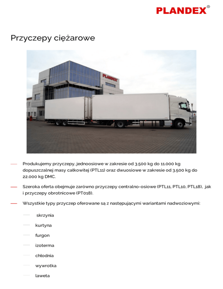 Przyczepy ciężarowe Produkujemy przyczepy, jednoosiowe w zakresie od 3.500 kg do 11.000 kg dopuszczalnej masy całkowitej (PTL11) oraz dwuosiowe w zakresie od 3.500 kg do 22.000 kg DMC. Szeroka oferta obejmuje zarówno przyczepy centralno-osiowe (PTL11, PTL10, PTL18), jak i przyczepy obrotnicowe (PT018). Wszystkie typy przyczep oferowane są z następującymi wariantami nadwoziowymi: skrzynia kurtyna furgon izoterma chłodnia wywrotka laweta podwozie pod zabudowę BDF Ponadto wszystkie typy posiadają homologację ADR i mogą być stosowane do przewozu materiałów niebezpiecznych. W zależności od preferencji klienta do produkcji przyczep wykorzystujemy stale konstrukcyjne o podwyższonej wytrzymałości lub konstrukcje aluminiowe. W pierwszym przypadku wszystkie stalowe elementy przyczep są piaskowane, cynkowane a następnie lakierowane. Przyczepy zostały opracowane przez inżynierów konstruktorów firmy PLANDEX, przy użyciu najnowszych narzędzi komputerowych CAD i SOLID EDGE. Konstrukcja gamy przyczep została przebadana i zaopiniowana pozytywnie przez Przemysłowy Instytut Maszyn w Poznaniu. Przyczepy przeszły także badania Przemysłowego Instytutu Motoryzacji oraz Instytutu Transportu Samochodowego Symulacje komputerowe pozwoliły stworzyć optymalną konstrukcję pod względem wytrzymałościowym. Wiarygodność symulacji komputerowych została potwierdzona eksperymentalnymi badaniami wytrzymałościowymi i trwałościowymi na torze i stanowisku badawczym. Wszystkie produkowane przez nas przyczepy posiadają pneumatyczny układ hamulcowy i zawieszenia renomowanych firm KNORR – Bremse, Haldex lub WABCO. Układy hamulcowe wyposażane są w system ABS lub EBS, przy czym system EBS posiada dodatkową funkcję stabilizacji toru jazdy (RSS/RSP), szczególnie korzystną dla przyczep wielkogabarytowych. Zastosowane w przyczepach wysokiej jakości osie takich producentów jak: BPW czy Gigant, zapewniają ich dużą trwałość. Pozostałe podzespoły znanych firm np. oczko dyszla JOST / Rockinger, nogi podporowe Haacon, instalacja elektryczna Aspock, Vignal, ERMAX, ogumienie Continental, Good Year, Fulda i Michelin, powodują że produkt ten zadowala naszych klientów.