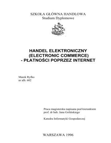 SZKOŁA GŁÓWNA HANDLOWA Studium Dyplomowe HANDEL ELEKTRONICZNY (ELECTRONIC COMMERCE) - PŁATNOŚCI POPRZEZ INTERNET Marek Ryfko nr alb. 602 Praca magisterska napisana pod kierunkiem prof. dr hab. Jana Golińskiego Katedra Informatyki Gospodarczej WARSZAWA 1996 Spis treści WSTĘP ......................................................................................................................................... 3 1. HANDEL ELEKTRONICZNY ............................................................................................. 5 1.1. Czym jest Internet?................................................................................................................. 5 1.2. Internet- statystyka wzrostu i wykorzystania ......................................................................... 9 1.3. Handel elektroniczny............................................................................................................ 16 1.4. Komercyjne wykorzystanie Internetu .................................................................................. 17 1.5. Internet w bankowości.......................................................................................................... 19 1.6. Jak wygląda dokonywanie zakupów poprzez Internet ......................................................... 29 2. INTERNETOWE SYSTEMY PŁATNOŚCI...................................................................... 35 2.1. Wprowadzenie...................................................................................................................... 35 2.2. Karty kredytowe ................................................................................................................... 36 2.2.1. CyberCash ................................................................................................................. 37 2.2.2. Secure Netscape......................................................................................................... 43 2.2.3. First Virtual ............................................................................................................... 44 2.3. Elektroniczne pieniądze ....................................................................................................... 48 2.3.1. DigiCash .................................................................................................................... 50 2.3.2. NetCash ..................................................................................................................... 58 2.4. Karty płatnicze ..................................................................................................................... 59 2.4.1. Mondex...................................................................................................................... 62 2.4.2. Europay...................................................................................................................... 65 2.5. Inne....................................................................................................................................... 66 2.5.1. NetCheque ................................................................................................................. 66 2.5.2. NetBill ....................................................................................................................... 68 3. BEZPIECZEŃSTWO W INTERNECIE ............................................................................ 69 3.1. Wprowadzenie...................................................................................................................... 69 3.2. Szyfrowanie danych ............................................................................................................. 70 3.2.1. Szyfrowanie symetryczne.......................................................................................... 70 3.2.2. Szyfrowanie metodą klucza publicznego .................................................................. 70 3.2.3. Szyfrowanie hybrydowe ............................................................................................ 72 3.3. Podpis elektroniczny ............................................................................................................ 72 3.4. Autentyfikacja ...................................................................................................................... 73 3.4.1. Urzędy certyfikujące.................................................................................................. 73 3.4.2. Kerberos .................................................................................................................... 76 3.5. Autoryzacja .......................................................................................................................... 76 3.6. Prywatność ........................................................................................................................... 77 3.7. Technologie bezpiecznej transmisji danych......................................................................... 78 3.7.1. SSL ............................................................................................................................ 78 3.7.2. S-HTTP...................................................................................................................... 81 3.7.3. PCT............................................................................................................................ 81 3.7.4. SET ............................................................................................................................ 82 3.7.5. Fortezza ..................................................................................................................... 82 3.7.6. Bezpieczna poczta elektroniczna............................................................................... 83 3.8. Podsumowanie..........................................................................................................