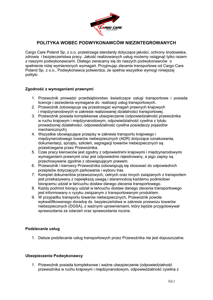 POLITYKA WOBEC PODWYKONAWCÓW NIEZINTEGROWANYCH Cargo Care Poland Sp. z o.o. przestrzega standardy dotyczące jakości, ochrony środowiska, zdrowia i bezpieczeństwa pracy. Jakość realizowanych usług możemy osiągnąć tylko razem z naszymi podwykonawcami. Dlatego zwracamy się do naszych podwykonawców o spełnienie niżej wymienionych wymagań. Przyjmując zlecenie transportowe od Cargo Care Poland Sp. z o.o., Podwykonawca potwierdza, że spełnia wszystkie wymogi niniejszej polityki. Zgodność z wymaganiami prawnymi 1. Przewoźnik prowadzi przedsiębiorstwo świadczące usługi transportowe i posiada licencje i zezwolenia wymagane do realizacji usług transportowych. 2. Przewoźnik zobowiązuje się przestrzegać wymagań prawnych krajowych i międzynarodowych w zakresie realizowanej działalności transportowej. 3. Przewoźnik posiada kompleksowe ubezpieczenie (odpowiedzialność przewoźnika w ruchu krajowym i międzynarodowym, odpowiedzialność cywilna z tytułu prowadzonej działalności, odpowiedzialność cywilna posiadaczy pojazdów mechanicznych). 4. Wszystkie obowiązujące przepisy w zakresie transportu krajowego i międzynarodowego towarów niebezpiecznych (ADR) dotyczące oznakowania, dokumentacji, sprzętu, szkoleń, segregacji towarów niebezpiecznych są przestrzegane przez Przewoźnika. 5. Czas pracy kierowców jest zgodny z odpowiednimi krajowymi i międzynarodowymi wymaganiami prawnymi oraz jest odpowiednio rejestrowany, a jego zapisy są przechowywane zgodnie z obowiązującym prawem. 6. Przewoźnik i kierowcy Przewoźnika zobowiązują się stosować do odpowiednich przepisów dotyczących parkowania i wyboru tras. 7. Komplet dokumentów przewozowych, celnych oraz innych związanych z transportem jest przekazywany z największą uwagą i starannością każdemu podmiotowi biorącemu udział w łańcuchu dostaw danego zlecenia transportowego. 8. Każdy podmiot biorący udział w łańcuchu dostaw danego zlecenia transportowego jest informowany o ryzyku związanym z transportowanym produktem. 9. W przypadku transportu towarów niebezpiecznych, Przewoźnik powoła wykwalifikowanego doradcę ds. bezpieczeństwa w zakresie przewozu towarów niebezpiecznych (DGSA), z ważnymi uprawnieniami, który będzie przygotowywał sprawozdania ze zdarzeń oraz sprawozdania roczne. Podzlecanie usług 1. Dalsze podzlecanie usług transportowych przez Przewoźnika nie jest dopuszczalne. Ubezpieczenie Podwykonawcy 1. Przewoźnik posiada kompleksowe i ważne ubezpieczenie (odpowiedzialność przewoźnika w ruchu krajowym i międzynarodowym, odpowiedzialność cywilna z Ed.1 tytułu prowadzonej działalności, odpowiedzialność cywilna posiadaczy pojazdów mechanicznych). Ubezpieczenie musi być co najmniej w wysokości wymaganej przez obowiązujące przepisy prawne. 2. Cargo Care Poland Sp. z o.o. może poprosić o potwierdzenie zawarcia umowy ubezpieczenia. Pojazdy i sprzęt 1. Przewoźnik zobowiązuje się do przewiezienia własnymi środkami transportu towarów Zleceniodawcy, zgodnie z otrzymanym Zleceniem transportowym od Zleceniodawcy, z zachowaniem największej staranności, zapewniając wysoką jakość, bezpieczeństwo, ochronę zdrowia i środowiska w trakcie realizacji usług. 2. Przewoźnik zobowiązuje się realizować zlecenia transportowe sprawnymi technicznie środkami transportowymi wraz z odpowiednim wyposażeniem technicznym spełniającymi wymagania stawiane przez przepisy prawne do prawidłowego i bezpiecznego wykonania transportu. Środki transportu wraz z wyposażeniem wykorzystywane do transportu materiałów niebezpiecznych spełniają wymagania prawne oraz są używane zgodnie ze wskazaniami producenta. 3. W przypadku transportu artykułów spożywczych przewoźnik gwarantuje, że pojazdy przewoźnika są dopuszczone do przewozu żywności i nie stanowią zagrożenia dla transportowanych artykułów spożywczych. 4. Przewoźnik zobowiązuje się odpowiednio utrzymywać środki transportu oraz ich wyposażenie poprzez dokonywanie regularnych przeglądów. 5. Przewoźnik zobowiązuje się korzystać ze sprawdzonych i wykwalifikowanych serwisów technicznych w celu zapewnienia bezpieczeństwa i zminimalizowania awaryjności środków transportu i jego wyposażenia w trakcie realizacji zleceń transportowych. 6. Dokumentacja dotycząca serwisu i kontroli technicznych musi być prowadzona i udostępniana na życzenie Cargo Care Poland Sp. z o.o. Kierowcy 1. Przewoźnik zapewnia, że kierowcy Przewoźnika posiadają ważne i odpowiednie do realizowanego transportu ważne prawo jazdy, zaświadczenia i certyfikaty będące potwierdzeniem ich kwalifikacji. 2. Kierowcy Przewoźnika wykonujący przewozy towarów niebezpiecznych posiadają ważne zaświadczenia ukończenia szkolenia ADR oraz są wyposażeni w odpowiednie środki ochrony indywidualnej. 3. Przewoźnik i jego kierowcy ściśle przestrzegają polityki zakazu spożywania i znajdowania się pod wpływem alkoholu, narkotyków , środków odurzających i innych substancji mogących negatywnie wpływać na zdolność prowadzenia pojazdu podczas wykonywania pracy. 4. Wszyscy kierowcy muszą mieć zawsze zapięte pasy bezpieczeństwa w trakcie jazdy. 5. W czasie jazdy kierowcom nie wolno korzystać z telefonów komórkowych ani innych urządzeń telekomunikacyjnych. 6. Zaleca się, aby kierowcy stosowali zasady bezpieczeństwa (BBS- Bezpieczeństwa Bazującego na Zachowaniach) w zakresie prowadzenia pojazdu, załadunku i rozładunku. 7. Przewoźnik i kierowcy Przewoźnika zobowiązują się stosować do odpowiednich przepisów dotyczących parkowania i wyboru tras. 8. Przewoźnik odpowiedzialny jest za odpowiedni dobór i szkolenia kierowców. Szkolenia kierowców powinny obejmować: zasady dotyczące dokumentacji (przewozowej, Ed.1 pojazdów, kierowcy), odprawy celnej, czasu pracy kierowcy, wyboru trasy, wyposażenia i oznakowania pojazdu, korzystania z myjni, bezpiecznej jazdy, używania pasów bezpieczeńst
