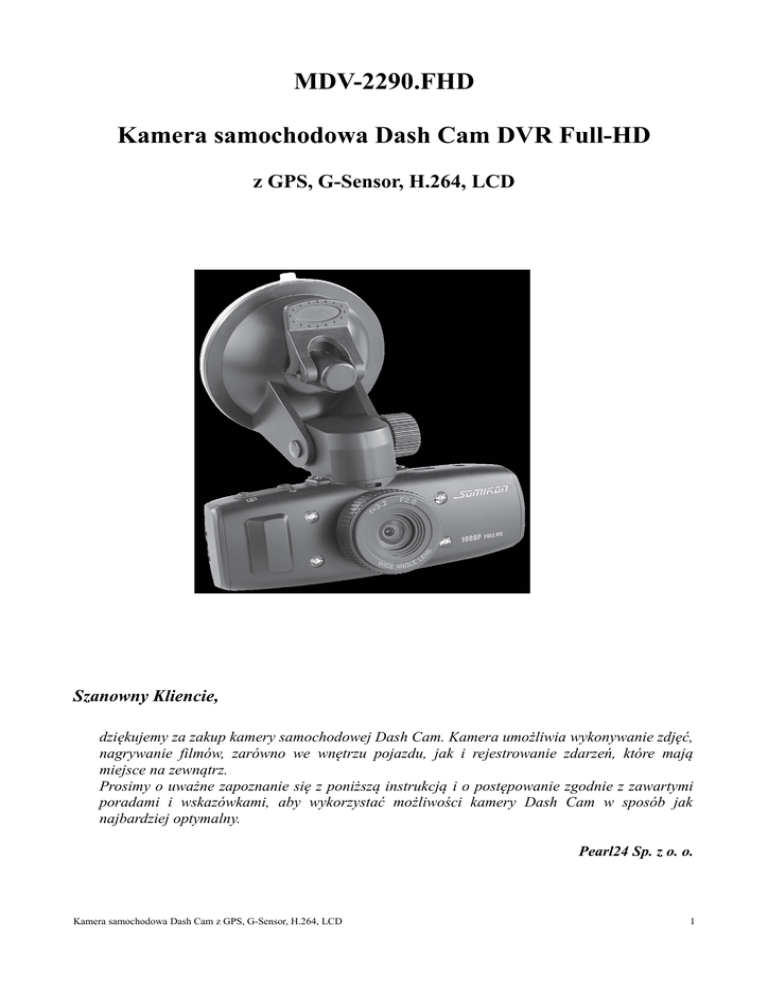 MDV-2290.FHD Kamera samochodowa Dash Cam DVR Full-HD z GPS, G-Sensor, H.264, LCD Szanowny Kliencie, dziękujemy za zakup kamery samochodowej Dash Cam. Kamera umożliwia wykonywanie zdjęć, nagrywanie filmów, zarówno we wnętrzu pojazdu, jak i rejestrowanie zdarzeń, które mają miejsce na zewnątrz. Prosimy o uważne zapoznanie się z poniższą instrukcją i o postępowanie zgodnie z zawartymi poradami i wskazówkami, aby wykorzystać możliwości kamery Dash Cam w sposób jak najbardziej optymalny. Pearl24 Sp. z o. o. Kamera samochodowa Dash Cam z GPS, G-Sensor, H.264, LCD 1 Zawartość zestawu • Kamera samochodowa Dash Cam • Przyssawka mocująca • Zasilacz samochodowy • Kabel USB • Kabel AV • Kabel HDMI • Oprogramowanie • Instrukcja obsługi Dane techniczne • Wyświetlacz LCD: 1,5 "(3,7 cm) TFT LCD, 480 x 240 pikseli • Aparat: HD 120° - obiektyw szerokokątny • Zoom: 4x (cyfrowy) • Maksymalna rozdzielczość ekranu (w trybie Video): 1920 x 1080 pikseli, 30/60 fps • Maksymalna rozdzielczość ekranu (w trybie Foto): 5M • Format nagrywania wideo: MJPEG • Wyjście Audio/Video: PAL/NTSC • Format pliku: AVI • Format wykonywanych zdjęć: JPG • Karta pamięci: microSD/SDHC do 32 GB, klasa 6 • Nagrywanie w pętli: co 2, 3, 5 min • HDMI, wyjście TV (NTSC/PAL), USB 2.0 mini, karta microSD/SDHC do 32 GB (do nagrywania filmów HD: wymagana karta microSDHC, klasa 6) • Diody podczerwieni: 4 • Zasilanie: DC 5V lub 12V zasilacz samochodowy • Wymagania systemowe: Windows 2000/XP/Windows 7, Mac OS 10.3.6 lub nowszy • Języki: angielski, niemiecki, francuski, hiszpański, włoski • GPS: Wbudowany • Bateria: 500mAh, 3,7 V Li-ion polimer Kamera samochodowa Dash Cam z GPS, G-Sensor, H.264, LCD 2 Najważniejsze informacje Bezpieczeństwo Niniejsza instrukcja ma na celu zapoznanie Państwa z prawidłowym korzystaniem z produktu. Należy przechowywać instrukcję w miejscu łatwo dostępnym, aby w razie wątpliwości zawsze móc sprawdzić potrzebne informacje. Samowolne modyfikacje obniżają poziom bezpieczeństwa produktu. UWAGA. Istnieje ryzyko obrażeń! Nie należy otwierać obudowy produktu, ani samodzielnie dokonywać jego naprawy. Produkt bardzo łatwo ulega uszkodzeniu w wyniku uderzenia, wstrząsów lub upadku z nawet niewielkiej wysokości, dlatego należy się z nim obchodzić ostrożnie. Nie należy przechowywać produktu w wilgotnych i ekstremalnie gorących miejscach. Nigdy nie należy zanurzać produktu w wodzie ani innych cieczach. Wszelkie prawa do wprowadzania zmian technicznych i eliminacji błędów są zastrzeżone. Utylizacja To urządzenie elektryczne nie zalicza się do odpadów gospodarczych. W celu właściwej utylizacji urządzenia należy skontaktować się z organizacją odpowiedzialną za zbiórkę elektroodpadów w wybranej miejscowości. Potwierdzenie zgodności Deklaruje się, że produkt NX-4071 jest zgodny z normą EMV 2004/108/EG oraz dyrektywą RoHS 2011/65/EU. Dostarczone przez: Pearl.GmbH Pearl-Str. 1–3 D-79426 Buggingen Kamera samochodowa Dash Cam z GPS, G-Sensor, H.264, LCD 3 Budowa produktu 1. Przycisk nagrywania/OK 2. Przycisk zmiany trybu 3. Przycisk ze strzałką w górę/podgłaszania (+) 4. Przycisk ze strzałką w dół/przyciszania (–) 5. Wyjście USB 6. Wyjście AV 7. Włącznik/Wyłącznik 8. Wyzwalacz 1. Wyjście HDMI 2. Diody ledowe 3. Głośnik 4. Reset 5. Obiektyw 6. Slot na kartę pamięci Kamera samochodowa Dash Cam z GPS, G-Sensor, H.264, LCD 4 Przyciski i ich funkcje Przycisk Funkcja Zmiany trybu Naciśnij ten przycisk, aby uzyskać dostęp do ustawień funkcji aparatu. Naciśnij dwukrotnie, aby przejść do ustawień ogólnych systemu. Aby wyjść z opcji menu ponownie naciśnij przycisk. Jeśli naciśniesz ten przycisk podczas nagrywania, plik zostanie zablokowany lub odblokowany. Naciśnij ten przycisk, aby przełączać się między trybem nagrywania, galerią i ustawieniami. Tryb nagrywania: krótkie naciśnięcie tego przycisku, spowoduje zapisanie aktualnie nagrywanego filmu. Ze strzałką w górę/podgłaszania (+) Tryb Stand By/Nagrywania: Przytrzymaj ten przycisk, aby powiększyć rozmiar obrazu. Nawigacja w menu: Naciśnij ten przycisk aby przejść w górę pomiędzy opcjami menu. Ze strzałką w dół/przyciszania (–) Tryb Stand By/Nagrywania: Przytrzymaj ten przycisk wciśnięty, aby pomniejszyć rozmiar obrazu. Nawigacja w menu: Naciśnij ten przycisk aby przejść w dół pomiędzy opcjami menu. Nagrywania/OK Nawigacja w menu: Naciśnij ten przycisk, aby zatwierdzić wprowadzone przez Ciebie ustawienia. Tryb nagrywania: Naciśnięcie tego przycisku spowoduje rozpoczęcie lub zatrzymanie nagrywanie. Włącznik/Wyłącznik Włącz urządzenie naciskając przycisk Włącznik/ Wyłącznik. Aby je wyłączyć, przytrzymaj przycisk przez około 3 sekundy. Reset Jeśli urządzenie nie działa prawidłowo i nie reaguje na wybierane funkcje należy wprowadzić niewielki, ostry przedmiot do wejścia resetującego, aby uruchomić ponownie system urządzenia. Spowoduje to przywrócenie domyślnych ustawień urządzenia. Ustawienia wprowadzone przez użytkownika zostaną utracone. Wyzwalacz Kamera samochodowa Dash Cam z GPS, G-Sensor, H.264, LCD Naciśnij przycisk wyzwalacza, aby wykonać zdjęcie. 5 Obsługa Ładowanie baterii Przed pierwszym uruchomieniem użyciem kamery samochodowej należy w pełni naładować jej baterię. W trakcje procesu ładowania dioda ledowa znajdująca się na lewo od przycisku ze strzałką w górę świeci się na czerwono. Naładowanie baterii do pełna trwa około 3 godzin. Urządzenie można naładować na trzy sposoby: Zasilaczem USB: Podłącz kamerę za pomocą kabla USB z zasilaczem USB do gniazda zasilającego. Poprzez komputer: Podłącz kamerę za pomocą kabla USB do aktywnego portu USB włączonego komputera. A następnie wybierz opcję ładowania baterii. Zasilaczem samochodowym: Podczas jazdy podłącz kamerę za pomocą - zawartego w zes