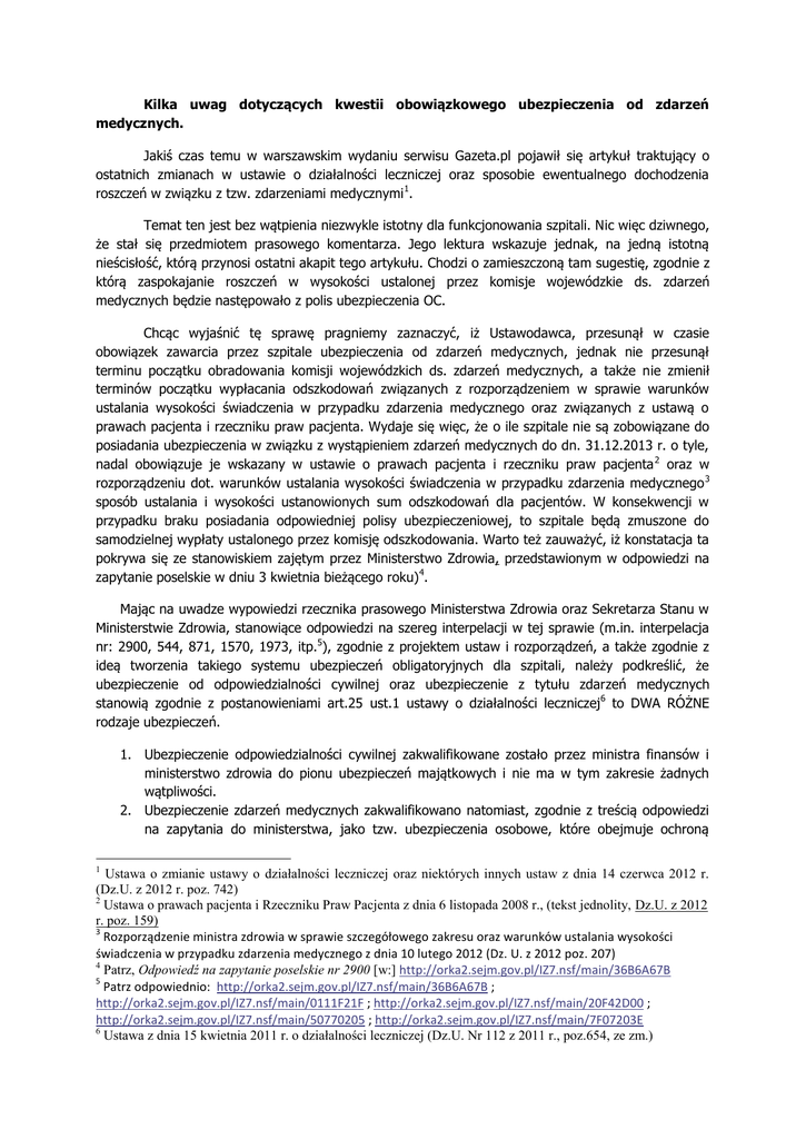 Kilka uwag dotyczących kwestii obowiązkowego ubezpieczenia od zdarzeń medycznych. Jakiś czas temu w warszawskim wydaniu serwisu Gazeta.pl pojawił się artykuł traktujący o ostatnich zmianach w ustawie o działalności leczniczej oraz sposobie ewentualnego dochodzenia roszczeń w związku z tzw. zdarzeniami medycznymi 1. Temat ten jest bez wątpienia niezwykle istotny dla funkcjonowania szpitali. Nic więc dziwnego, że stał się przedmiotem prasowego komentarza. Jego lektura wskazuje jednak, na jedną istotną nieścisłość, którą przynosi ostatni akapit tego artykułu. Chodzi o zamieszczoną tam sugestię, zgodnie z którą zaspokajanie roszczeń w wysokości ustalonej przez komisje wojewódzkie ds. zdarzeń medycznych będzie następowało z polis ubezpieczenia OC. Chcąc wyjaśnić tę sprawę pragniemy zaznaczyć, iż Ustawodawca, przesunął w czasie obowiązek zawarcia przez szpitale ubezpieczenia od zdarzeń medycznych, jednak nie przesunął terminu początku obradowania komisji wojewódzkich ds. zdarzeń medycznych, a także nie zmienił terminów początku wypłacania odszkodowań związanych z rozporządzeniem w sprawie warunków ustalania wysokości świadczenia w przypadku zdarzenia medycznego oraz związanych z ustawą o prawach pacjenta i rzeczniku praw pacjenta. Wydaje się więc, że o ile szpitale nie są zobowiązane do posiadania ubezpieczenia w związku z wystąpieniem zdarzeń medycznych do dn. 31.12.2013 r. o tyle, nadal obowiązuje je wskazany w ustawie o prawach pacjenta i rzeczniku praw pacjenta 2 oraz w rozporządzeniu dot. warunków ustalania wysokości świadczenia w przypadku zdarzenia medycznego 3 sposób ustalania i wysokości ustanowionych sum odszkodowań dla pacjentów. W konsekwencji w przypadku braku posiadania odpowiedniej polisy ubezpieczeniowej, to szpitale będą zmuszone do samodzielnej wypłaty ustalonego przez komisję odszkodowania. Warto też zauważyć, iż konstatacja ta pokrywa się ze stanowiskiem zajętym przez Ministerstwo Zdrowia, przedstawionym w odpowiedzi na zapytanie poselskie w dniu 3 kwietnia bieżącego roku)4. Mając na uwadze wypowiedzi rzecznika prasowego Ministerstwa Zdrowia oraz Sekretarza Stanu w Ministerstwie Zdrowia, stanowiące odpowiedzi na szereg interpelacji w tej sprawie (m.in. interpelacja nr: 2900, 544, 871, 1570, 1973, itp.5), zgodnie z projektem ustaw i rozporządzeń, a także zgodnie z ideą tworzenia takiego systemu ubezpieczeń obligatoryjnych dla szpitali, należy podkreślić, że ubezpieczenie od odpowiedzialności cywilnej oraz ubezpieczenie z tytułu zdarzeń medycznych stanowią zgodnie z postanowieniami art.25 ust.1 ustawy o działalności leczniczej6 to DWA RÓŻNE rodzaje ubezpieczeń. 1. Ubezpieczenie odpowiedzialności cywilnej zakwalifikowane zostało przez ministra finansów i ministerstwo zdrowia do pionu ubezpieczeń majątkowych i nie ma w tym zakresie żadnych wątpliwości. 2. Ubezpieczenie zdarzeń medycznych zakwalifikowano natomiast, zgodnie z treścią odpowiedzi na zapytania do ministerstwa, jako tzw. ubezpieczenia osobowe, które obejmuje ochroną 1 Ustawa o zmianie ustawy o działalności leczniczej oraz niektórych innych ustaw z dnia 14 czerwca 2012 r. (Dz.U. z 2012 r. poz. 742) 2 Ustawa o prawach pacjenta i Rzeczniku Praw Pacjenta z dnia 6 listopada 2008 r., (tekst jednolity, Dz.U. z 2012 r. poz. 159) 3 Rozporządzenie ministra zdrowia w sprawie szczegółowego zakresu oraz warunków ustalania wysokości świadczenia w przypadku zdarzenia medycznego z dnia 10 lutego 2012 (Dz. U. z 2012 poz. 207) 4 Patrz, Odpowiedź na zapytanie poselskie nr 2900 [w:] http://orka2.sejm.gov.pl/IZ7.nsf/main/36B6A67B 5 Patrz odpowiednio: http://orka2.sejm.gov.pl/IZ7.nsf/main/36B6A67B ; http://orka2.sejm.gov.pl/IZ7.nsf/main/0111F21F ; http://orka2.sejm.gov.pl/IZ7.nsf/main/20F42D00 ; http://orka2.sejm.gov.pl/IZ7.nsf/main/50770205 ; http://orka2.sejm.gov.pl/IZ7.nsf/main/7F07203E 6 Ustawa z dnia 15 kwietnia 2011 r. o działalności leczniczej (Dz.U. Nr 112 z 2011 r., poz.654, ze zm.) zdrowie i życie pacjenta, ale, co najciekawsze, jednocześnie uznając je za odmianę ubezpieczenia NW (które notabene zakwalifikowano do ubezpieczeń majątkowych). Jest to o tyle dziwne, że podział ubezpieczeń uwzględnia ustawa o działalności ubezpieczeniowej w załączniku do niej. Powyższe wątpliwości stanowić będą z pewnością pole dla analiz podejmowanych w doktrynie przedmiotu. W tym miejscu należy jednak zwrócić uwagę na praktyczny wymiar tego zagadnienia. Interesujące wydaje się zwłaszcza szczegółowe wyjaśnienie zakresu udzielanej ochrony ujęte w odpowiedzi Sekretarza Stanu w Ministerstwie Zdrowia - z upoważnienia ministra - na interpelację nr 1973 w sprawie obowiązkowego ubezpieczenia z tytułu zdarzeń medycznych z dnia 13 marca 2012 roku7. Znajdujemy tu wyraźne podkreślenie, wskazujące, że ubezpieczenie zdarzeń medycznych posiada ODMIENNY ZAKRES OD UBEZPIECZENIA OC. W związku z tzw. Zdarzeniami Medycznymi roszczeń możemy dochodzić przed komisjami wojewódzkimi, lub wystąpić na drogę sądową. Wybierając drogę przed komisjami, w oparciu o treść ustawy, mamy pewność, iż ewentualne odszkodowanie wypłacone zostanie stosunkowo szybko, nie mniej kwoty odszkodowań, patrząc na dotychczasowe orzecznictwo i wypłacane odszkodowania za szkody na osobie, są stosunkowo niewysokie. A co jeśli zdecydujemy się na dochodzenie należności w związku ze zdarzeniem medycznym, na drodze sądowej? W myśl odpowiedzi na interpelacje, roszczenia zdefiniowane jako „Zdarzenia medyczne” nie będą pokryte ubezpieczeniem OC, które niejednokrotnie w działalności szpitali zawierane jest na wielomilionową, znacznie wyższą niż obowiązkowe ubezpieczenie zdarzeń medycznych, sumę ubezpieczenia. Biorąc pod uwagę więc, że Sąd wskaże, iż należne odszkodowanie wynosić powinno, powiedzmy 2.000.000 PLN, w związku z wystąpieniem zdarzenia medycznego (którego defin