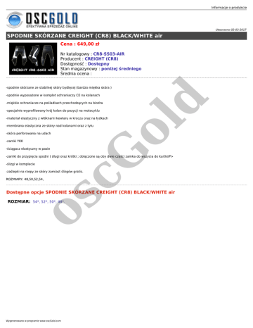 Informacje o produkcie Utworzono 02-03-2017 SPODNIE SKÓRZANE CREIGHT (CR8) BLACK/WHITE air Cena : 649,00 zł Nr katalogowy : CR8-SS03-AIR Producent : CREIGHT (CR8) Dostępność : Dostępny Stan magazynowy : poniżej średniego Średnia ocena : -spodnie skórzane ze stabilnej skóry bydlęcej (bardzo miękka skóra ) -miękkie ochraniacze na pośladkach przechodzących na biodra -specjalnie wyprofilowany krój kolan do pozycji na motocyklu -membrana elastyczna ze skóry nad kolanami oraz z tyłu -skóra perforowana na udach -ściągacz elastyczny w pasie cG -zamki YKK ol -materiał elastyczny z włóknami kewlaru w kroczu oraz na łydkach d -spodnie wyposażone w komplet ochraniaczy CE na kolanach -zamki do przypięcia spodni ( długi oraz krótki ; dołączone są oby dwie części zamka do wszycia do kurtki/P> -ślizgi w komplecie -zaślepki na rzepy ze skóry zamiast ślizgów gratis. ROZMIARY: 48,50,52,54, os Dostępne opcje SPODNIE SKÓRZANE CREIGHT (CR8) BLACK/WHITE air ROZMIAR: 54*, 52*, 50*, 48*. Wygenerowano w programie www.oscGold.com