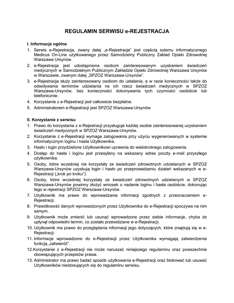 REGULAMIN SERWISU e-REJESTRACJA I. Informacje ogólne 1. Serwis e-Rejestracja, zwany dalej „e-Rejestracja” jest częścią sytemu informatycznego Medicus On-Line użytkowanego przez Samodzielny Publiczny Zakład Opieki Zdrowotnej Warszawa Ursynów. 2. e-Rejestracja jest udostępniona osobom zainteresowanym uzyskaniem świadczeń medycznych w Samodzielnym Publicznym Zakładzie Opieki Zdrowotnej Warszawa Ursynów w Warszawie, zwanym dalej „SPZOZ Warszawa-Ursynów”. 3. e-Rejestracja służy zainteresowany osobom do ustalania, a w razie konieczności także do odwoływania terminów udzielania na ich rzecz świadczeń medycznych w SPZOZ Warszawa-Ursynów, bez konieczności dokonywania tych czynności osobiście lub telefonicznie. 4. Korzystanie z e-Rejestracji jest całkowicie bezpłatne. 5. Administratorem e-Rejestracji jest SPZOZ Warszawa-Ursynów II. Korzystanie z serwisu 1. Prawo do korzystania z e-Rejestracji przysługuje każdej osobie zainteresowanej uzyskaniem świadczeń medycznych w SPZOZ Warszawa-Ursynów. 2. Korzystanie z e-Rejestracji wymaga zalogowania przy użyciu wygenerowanych w systemie informatycznym loginu i hasła Użytkownika. 3. Hasło i login przydzielone Użytkownikowi uprawnia do wielokrotnego zalogowania. 4. Dostęp do hasła i loginu jest przesyłany na wskazany adres poczty e-mail przyszłego użytkownika. 5. Osoby, które wcześniej nie korzystały ze świadczeń zdrowotnych udzielanych w SPZOZ Warszawa-Ursynów uzyskują login i hasło po przeprowadzeniu działań wskazanych w eRejestracji („krok po kroku”). 6. Osoby, które wcześniej korzystały ze świadczeń zdrowotnych udzielanych w SPZOZ Warszawa-Ursynów powinny złożyć wniosek o nadanie loginu i hasła osobiście, dokonując tego w rejestracji SPZOZ Warszawa-Ursynów. 7. Użytkownik ma prawo do wprowadzania informacji zgodnych z przeznaczeniem eRejestracji. 8. Prawidłowość danych wprowadzonych przez Użytkownika do e-Rejestracji spoczywa na nim samym. 9. Użytkownik może zmienić lub usunąć wprowadzone przez siebie informacje, chyba że upłynął odpowiedni termin, co zostało przewidziane w e-Rejestracji. 10. Użytkownik ma prawo do przeglądania informacji jego dotyczących, które znajdują się w eRejestracji. 11. Informacje wprowadzone do e-Rejestracji przez Użytkownika wymagają zatwierdzenia funkcją „zatwierdź”. 12.Korzystanie z e-Rejestracji nie może naruszać niniejszego regulaminu oraz powszechnie obowiązujących przepisów prawa. 13. Administrator ma prawo badać sposób użytkowania e-Rejestracji oraz blokować lub usuwać Użytkowników niestosujących się do regulaminu serwisu. III. Ochrona i przetwarzanie danych 1. Użytkownik jest zobowiązany do zabezpieczenia otrzymanego loginu i hasła przed wglądem osób trzecich. 2. Administrator nie odpowiada za ujawnienie hasła lub loginu, a także innych informacji wprowadzonych przez użytkownika do e-Rejestracji niepowołanej osobie, jeżeli Użytkownik nie zabezpieczył ich przed wglądem osób trzecich. 3. Administrator nie udostępnia innym podmiotom adresów e-mail pozyskanych w procesie rejestracji Użytkowników. 4. Administrator nie udostępnia innym podmiotom informacji stanowiących dane osobowe, a także innych informacji chronionym przepisami prawa, które znajdują się w e-Rejestracji. 5. Użytkownik wyraża zgodę na przetwarzanie danych osobowych użytkownika umieszczonych w e-Rejestracja przez SPZOZ Warszawa-Ursynów na potrzeby tego serwisu oraz udzielania świadczeń medycznych, stosownie do obowiązujących przepisów prawa IV. Ograniczenie odpowiedzialności 1. Administrator dołożył wszelkich możliwych starań, aby zapewnić e-Rejestracji jak najwyższą jakość użytkowania. 2. Administrator nie ponosi odpowiedzialności za przerwy w udostępnianiu e-Rejestracji wynikające z przyczyn niezależnych od niego i za jakiekolwiek szkody, w tym też pośrednie wynikające z przerwy w funkcjonowaniu serwisu wywołane koniecznością konserwacji systemu lub czynnikami niezależnymi od Administratora. V. Informacje techniczne 1. Aby e-Rejestracja działała prawidłowo na komputerze Użytkownika, powinna być zainstalowana dowolna przeglądarka internetowa. Administrator informuje, że według wiedzy autora systemu informatycznego Medicus On-Line nie stwierdzono nieprawidłowości w działaniu e-Rejestracji przy użyciu przeglądarek firefox. 2. Za prawidłową konfigurację przeglądarki odpowiedzialny jest Użytkownik we własnym zakresie. 3. Zastrzega się przerwy techniczne w działaniu e-Rejestracji. Ich częstotliwość oraz czas trwania uzależniony jest od potrzeb technicznych. 4. Zastrzega się prawo do zaprzestania prowadzenia e-Rejestracji lub usług jej dotyczących w każdym czasie bez powiadomienia. 5. Administrator może zmienić niniejszy regulamin w każdym czasie. 6. Zmiany regulaminu obowiązują od chwili ich publikacji w e-Rejestracji lub w inny wskazanym terminie.