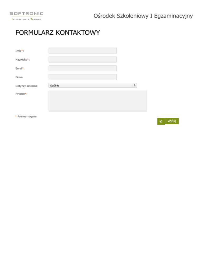 Ośrodek Szkoleniowy I Egzaminacyjny FORMULARZ KONTAKTOWY Imię*: Nazwisko*: Email*: Firma Dotyczy Ośrodka Ogólnie Pytanie*: * Pole wymagane Wyślij