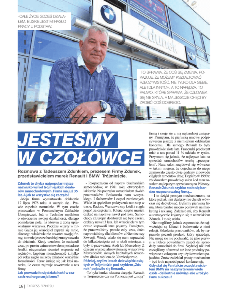-CAŁE ŻYCIE GDZIEŚ DZIAŁAŁEM. BLISKIE JEST MI HASŁO PRACY U PODSTAW. TO SPRAWIA, ŻE COŚ SIĘ ZMIENIA. POKAZUJE, ŻE MOŻEMY KSZTAŁTOWAĆ RZECZYWISTOŚĆ, NIE TYLKO DLA SIEBIE, ALE I DLA INNYCH. A TO NAPĘDZA. TO PALIWO, KTÓRE SPRAWIA, ŻE CZŁOWIEK SIĘ NIE SPALA, A MA JESZCZE CHĘCI BY ZROBIĆ COŚ DOBREGO. JESTEŚMY W CZOŁÓWCE Rozmowa z Tadeuszem Zdunkiem, prezesem Firmy Zdunek, przedstawicielem marek Renault i BMW Trójmieście. Zdunek to chyba najpopularniejsze nazwisko wśród trójmiejskich dealerów samochodowych. Firma ma już 35 lat. A jak to wszystko się zaczęło? -Moja firma wystartowała dokładnie 17 lipca 1978 roku. A zaczęło się... Prawie zupełnie normalnie. W tym czasie pracowałem w Powszechnym Zakładzie Ubezpieczeń. Już w Techniku myślałem o otworzeniu swojej działalności, dlatego posiadałem pole, na którym z żoną uprawialiśmy warzywa. Podczas wizyty w firmie Gajos jej właściciel zapytał się mnie, dlaczego właściwie nie otworze swojej firmy, to mnie jeszcze bardziej zmotywowało do działania. Kiedy uznałem, że nadszedł czas, po prostu zainwestowałem posiadane środki, otrzymałem również wsparcie od rodziców, kupiłem nieruchomość i...tylko pół roku zajęło mi żeby załatwić wszystkie formalności. Teraz śmieję się jak ktoś narzeka, ile czasu zajmuje otworzenie u nas firmy. Jak prowadziło się działalność w czasach realnego socjalizmu? 16 | EXPRESS BIZNESU - Rozpocząłem od napraw blacharskich samochodów, w 1981 roku otworzyłem lakiernię. Na początku zatrudniałem dwóch pracowników. Brakowało nam wszystkiego. I fachowców i części zamiennych. Wiele lat spędziłem praktycznie non stop w trasie: Radom, Warszawa czy Łódź i ciągła pogoń za częściami. Klienci często musieli czekać na naprawę nawet pół roku. Samochody z Europy, do których nie było części, czekały nawet 3 lata. Ich właściciele w tym czasie kupowali inne pojazdy. Pamiętam, że pracowaliśmy prawie cały czas, dużo naprawialiśmy dla klientów z Niemiec czy Szwecji. Wtedy udało się nam naprawiać do kilkudziesięciu aut w skali miesiąca, a były to przeważnie: Audi lub Mercedesy. Z czasem wyspecjalizowałem się w naprawie Mercedesów, samych kapitalnych remontów silnika robiłem do 30 miesięcznie. Później, czyli w latach dziewięćdziesiątych w Trójmieście pod szyldem „Zdunek” pojawiło się Renault.. -To była bardzo słuszna decyzja. Renault w Trójmieście czy na Pomorzu jest „moją” firmą i czuję się z nią najbardziej związany. Pamiętam, że pierwszą umowę podpisywałem jeszcze z niemieckim oddziałem koncernu. Dla samego Renault to były prawdziwie złote lata. Francuski producent miał u nas ponad 11 % udziału w rynku. Przyznam się jednak, że najlepsze lata na sprzedaż samochodów trochę „przespałem”. Nasz salon znajdował się wówczas w takim miejscu, że dojechanie do niego zajmowało często dwie godziny z powodu ciągłych remontów dróg. Dopiero w 1999 r. zbudowałem prawdziwy salon i od razu zostałem najlepszym sprzedawcą na Północy. Renault Zdunek szybko stało się bardzo rozpoznawalną firmą... - I to dzięki prostym mechanizmom, na które jednak inni dealerzy nie chcieli wówczas się decydować. Byliśmy pierwszą firmą, która bardzo mocno postawiła na marketing i reklamę. Zależało mi, aby Renault automatycznie kojarzyło się z nazwiskiem Zdunek. I to się udało. Nie mogliśmy jednak zapomnieć, że najważniejsi są klienci i budowanie z nimi relacji. Szkolenia pracowników, tak by naprawdę poczuli produkt, który sprzedają. Nie mogę się nie pochwalić, że jako pierwsi w Polsce powołaliśmy zespół ds. sprzedaży samochód do firm. Szybciej niż inni zaczęliśmy oferować też inne produkty powiązane z zakupem czy użytkowaniem pojazdów. Znów zadziałał prosty mechanizm – być krok naprzód przed konkurencją. Gdy stał się Pan także przedstawicielem BMW na naszym terenie wiele osób - delikatnie mówiąc- nie wróżyło Panu sukcesu? -Pod względem sprzedaży BMW cały czas jesteśmy w krajowej czołówce. Przyjęliśmy po prostu dobrą filozofię sprzedaży. Dziś klient do salonu popularnej marki przychodzi tylko raz i to już wyedukowany chociażby przez Internet. W przypadku takiej marki jak BMW do klienta musimy trafić sami. Salon wydaje się już niepotrzebny. -Nie do końca (śmiech). Dzięki temu w Gdyni, który obecnie budujemy, pracę zyska kilkadziesiąt osób. Dzięki budowie nowej drogi, jaka powstała przy okazji naszej inwestycji, skorzystali też mieszkańcy. Zapewniam, że to będzie najnowocześniejszy salon samochodowy w Trójmieście. -Jakie tam pojawią się nowoczesne, czy też nowatorskie rozwiązania? I czy to miejsce będzie potrafiło sprostać oczekiwaniom klienta, który najczęściej odwiedza salony po długiej lekturze prasy branżowej, przeglądaniu Internetu i słuchaniu rad znajomych na temat wyboru konkretnego modelu samochodu? - W dzisiejszych czasach ciężko jest się czymś wyróżnić, ponieważ wszystkie polskie stacje autoryzowane są doskonale wyposażone, związane jest to ze standardami producentów. Nasz gdyński salon będzie jednym z pierwszych w Europie zbudowanym i wyposażonym według najnowszych standardów BMW. Dotyczy to zarówno salonu jak i serwisu. Wystrój wnętrz będzie bardziej ciepły i przyjazny, punkty sprzedaży będą bardziej intymne i zamknięte, wyodrębnione będą strefy tematyczne. Serwis będzie prawie wyłącznie wyposażony w najnowsze urządzenia dostarczone przez BMW, dotyczy to serwisów, urządzeń diagnostycznych, jak i kluczy czy podnośników. Takie wyposażenie ma zapewnić najwyższy standard obsługi klientów. wych rozwiązań u nas w salonie. Pana nazwisko można odnaleźć także przy okazji wielu innych działań, sportowych, charytatywnych, działalności w Izbie Rzemieślniczej i innych organizacjach... -Całe życie gdzieś działałem. Bliskie 
