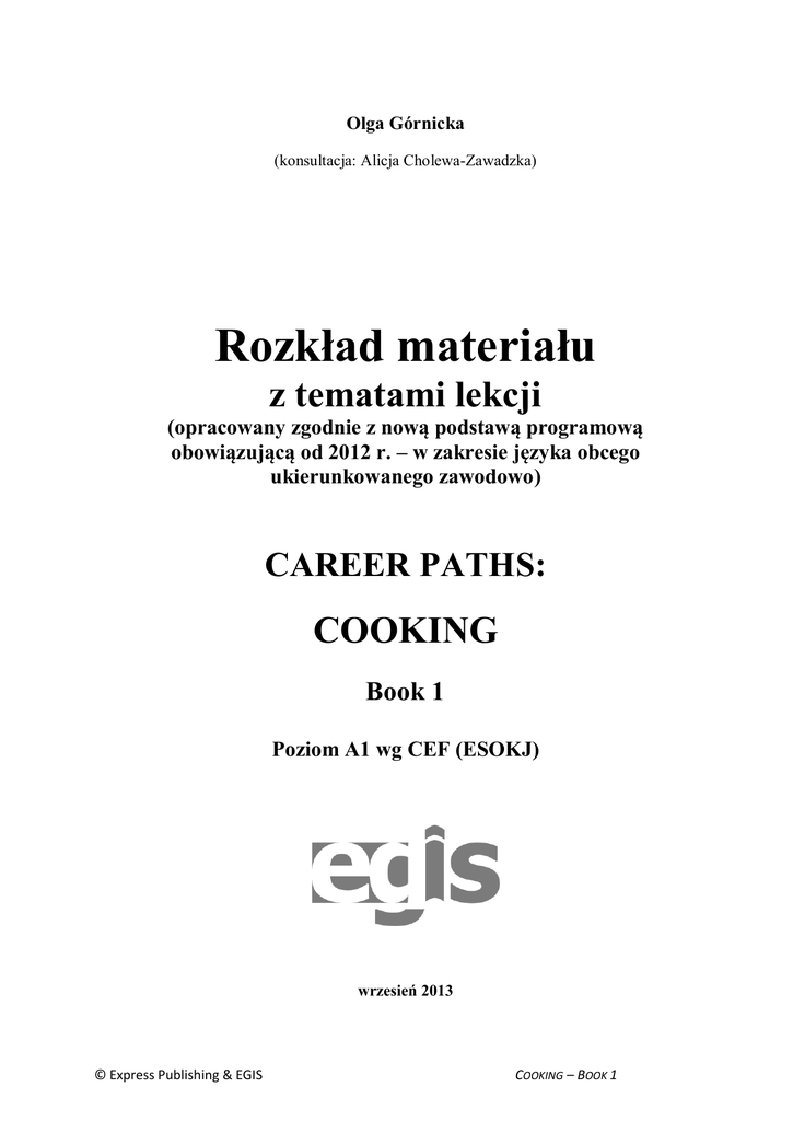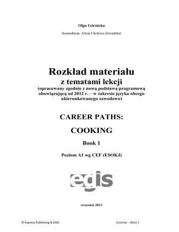 Olga Górnicka (konsultacja: Alicja Cholewa-Zawadzka) Rozkład materiału z tematami lekcji (opracowany zgodnie z nową podstawą programową obowiązującą od 2012 r. – w zakresie języka obcego ukierunkowanego zawodowo) CAREER PATHS: COOKING Book 1 Poziom A1 wg CEF (ESOKJ) wrzesień 2013 © Express Publishing & EGIS COOKING – BOOK 1 WSTĘP Cooking to publikacja należąca do serii Career Paths. Podręczniki z tej serii polecane są dla uczniów techników lub innych szkół zawodowych o odpowiednim profilu oraz tych, którzy chcą rozwijać swoje umiejętności językowe w zakresie języka angielskiego zawodowego (professional English). Autorzy serii założyli, że przystępujący do poznawania języka zawodowego znają już podstawy gramatyki języka angielskiego, a słownictwo ogólne mają opanowane na tyle, że potrafią się komunikować przynajmniej na podstawowym poziomie, wykorzystując właściwe funkcje językowe. Podręcznik podzielony został na trzy części: Book 1, Book 2 i Book 3, z których każda zawiera 15 rozdziałów. Poszczególne części odpowiadają kolejno poziomowi A1, A2 i B1 w Europejskim Systemie Opisu Kształcenia Językowego (Common European Framework of Reference for Languages). Prezentowany rozkład materiału podzielono na następujące rubryki: funkcje językowe; słownictwo; sprawności receptywne (czytanie i słuchanie); sprawności produktywne (mówienie i pisanie). Materiał zawarty w podręczniku jest przeznaczony na 30 godzin lekcyjnych. Na realizację każdego rozdziału przeznaczono 2 godziny lekcyjne. Pod rozkładem materiału nauczyciel znajdzie propozycje tematów lekcyjnych. Temat pierwszej godziny nawiązuje do prezentowanego tekstu i sugeruje również nauczycielowi przerobienie ćwiczeń leksykalnych, co stanowi przygotowanie do kolejnej lekcji, podczas której uczeń będzie w sposób czynny korzystał z nowo poznanych słów i zwrotów. Temat drugiej jednostki lekcyjnej wprowadza w świat słuchania oraz sprawności produktywnych, czyli mówienia i pisania. Pod hasłem Mówienie 1 kryje się odtworzenie przez uczniów wysłuchanego dialogu. Natomiast Mówienie 2 sugeruje wielokrotne powtarzanie własnych wersji tego dialogu, ze zmianą ról i wprowadzeniem różnych, proponowanych informacji. Ponieważ mówienie często sprawia uczniom – zwłaszcza mniej zaawansowanym językowo – największe problemy, proponuje się przeznaczenie na ćwiczenie tej sprawności językowej możliwie dużej ilości czasu. Samodzielne odegranie zadanej roli w języku angielskim zapewni uczniom nie tylko poczucie sukcesu i zadowolenia z siebie, ale będzie również motywacją do dalszej pracy. Pisanie to ostatni element każdego rozdziału, który nauczyciel może wykorzystać jako pracę domową. Po przerobieniu rozdziału uczeń jest przygotowany do wykonania zadania samodzielnie, zna potrzebne słownictwo i poznał wzór takiej formy pisemnej. Wiadomo, że w nauce, zwłaszcza języka obcego, bardzo ważne jest powtarzanie i utrwalanie nowopoznanego materiału. Po każdych trzech rozdziałach proponuje się więc jego powtórkę na lekcji w dowolnej formie (np. ponowne odegranie ról, gry językowe wykorzystujące słownictwo zawodowe itp.) albo sprawdzian pokazujący stopień opanowania przerobionego materiału. W poniższym rozkładzie materiału zamieszczono również informacje (kolor zielony) dotyczące realizacji wymagań nowej podstawy programowej (NPP) w zakresie języka obcego ukierunkowanego zawodowo (JOZ)1. Kurs składa się z: podręcznika, kompletu dwóch płyt CD do użytku w klasie, które zawierają nagrania wszystkich dialogów prezentowanych w podręczniku (zapisy nagrań znajdują się w książce nauczyciela), książki nauczyciela z kluczem odpowiedzi do wszystkich zadań znajdujących się w podręczniku. 1 Efekty kształcenia w zakresie JOZ przytoczono na końcu niniejszego Wstępu. © Express Publishing & EGIS COOKING – BOOK 1 Cooking to podręcznik, który zapewni korzystającym z niego nie tylko doskonalenie znajomości języka angielskiego, ale także poszerzenie wiedzy w interesującym ich obszarze zawodowym. Podstawa programowa kształcenia w zawodzie Efekty kształcenia: (JOZ). Język obcy ukierunkowany zawodowo Uczeń: 1. posługuje się zasobem środków językowych (leksykalnych, gramatycznych, ortograficznych oraz fonetycznych), umożliwiających realizację zadań zawodowych; 2. interpretuje wypowiedzi dotyczące wykonywania typowych czynności zawodowych artykułowane powoli i wyraźnie, w standardowej odmianie języka; 3. analizuje i interpretuje krótkie teksty pisemne dotyczące wykonywania typowych czynności zawodowych; 4. formułuje krótkie i zrozumiałe wypowiedzi oraz teksty pisemne umożliwiające komunikowanie się w środowisku pracy; 5. korzysta z obcojęzycznych źródeł informacji. © Express Publishing & EGIS COOKING – BOOK 1 Rozkład materiału – seria CAREER PATHS: Cooking BOOK 1 JEDNOSTKI LEKCYJNE FUNKCJE (NPP JOZ: 1) UMIEJĘTNOŚCI RECEPTYWNE PRODUKTYWNE (NPP JOZ: 2, 3) (NPP JOZ: 4) SŁOWNICTWO (NPP JOZ: 1) 1. The Kitchen 2 godz. ………… ………… – słownictwo związane z wymienienie kuchnią (appliances, stove, zastosowania różnych countertops itd.) urządzeń kuchennych – sprzęty kuchenne wyjaśnianie, dlaczego (refrigerator, freezer, kuchnia w restauracji dishwasher itd.) wymaga częstego – zwroty używane w czyszczenia i sprzątania rozmowie na temat stanu znajdowanie wyrazów o kuchni: What was wrong?, znaczeniu podobnym do I guess I forgot to…, I podanego w zdaniu won’t let it… itd. uzupełnianie luk w zdaniach wyrazami z podanego banku słów przekazywanie informacji wskazywanie błędów przepraszanie pisanie raportu o stanie kuchni (writing a report) Czytanie wykaz czynności (checklist) dla zmiany zamykającej kuchnię – wybór wielokrotny Słuchanie 1 rozmowa kierownika restauracji (restaurant manager) z szefem kuchni (chef) o stanie kuchni po o