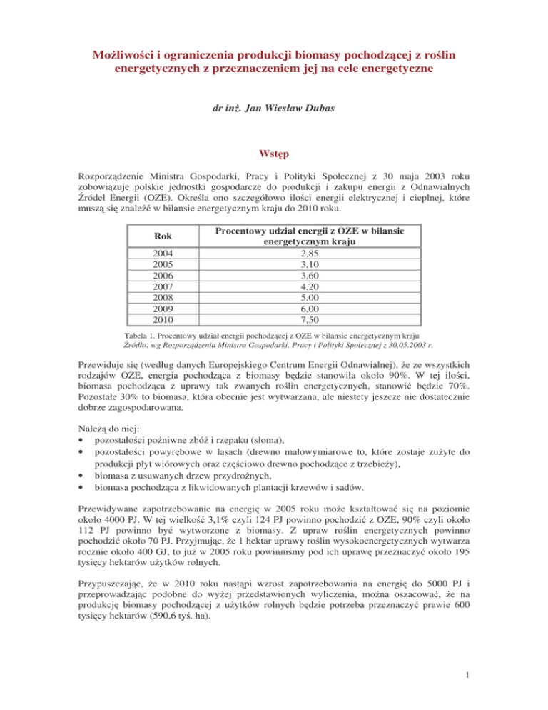 Mo liwo ci i ograniczenia produkcji biomasy pochodz cej z ro lin energetycznych z przeznaczeniem jej na cele energetyczne dr in . Jan Wiesław Dubas Wst p Rozporz dzenie Ministra Gospodarki, Pracy i Polityki Społecznej z 30 maja 2003 roku zobowi zuje polskie jednostki gospodarcze do produkcji i zakupu energii z Odnawialnych ródeł Energii (OZE). Okre la ono szczegółowo ilo ci energii elektrycznej i cieplnej, które musz si znale w bilansie energetycznym kraju do 2010 roku. Rok 2004 2005 2006 2007 2008 2009 2010 Procentowy udział energii z OZE w bilansie energetycznym kraju 2,85 3,10 3,60 4,20 5,00 6,00 7,50 Tabela 1. Procentowy udział energii pochodz cej z OZE w bilansie energetycznym kraju ródło: wg Rozporz dzenia Ministra Gospodarki, Pracy i Polityki Społecznej z 30.05.2003 r. Przewiduje si (według danych Europejskiego Centrum Energii Odnawialnej), e ze wszystkich rodzajów OZE, energia pochodz ca z biomasy b dzie stanowiła około 90%. W tej ilo ci, biomasa pochodz ca z uprawy tak zwanych ro lin energetycznych, stanowi b dzie 70%. Pozostałe 30% to biomasa, która obecnie jest wytwarzana, ale niestety jeszcze nie dostatecznie dobrze zagospodarowana. Nale do niej: • pozostało ci po niwne zbó i rzepaku (słoma), • pozostało ci powyr bowe w lasach (drewno małowymiarowe to, które zostaje zu yte do produkcji płyt wiórowych oraz cz ciowo drewno pochodz ce z trzebie y), • biomasa z usuwanych drzew przydro nych, • biomasa pochodz ca z likwidowanych plantacji krzewów i sadów. Przewidywane zapotrzebowanie na energi w 2005 roku mo e kształtowa si na poziomie około 4000 PJ. W tej wielko 3,1% czyli 124 PJ powinno pochodzi z OZE, 90% czyli około 112 PJ powinno by wytworzone z biomasy. Z upraw ro lin energetycznych powinno pochodzi około 70 PJ. Przyjmuj c, e 1 hektar uprawy ro lin wysokoenergetycznych wytwarza rocznie około 400 GJ, to ju w 2005 roku powinni my pod ich upraw przeznaczy około 195 tysi cy hektarów u ytków rolnych. Przypuszczaj c, e w 2010 roku nast pi wzrost zapotrzebowania na energi do 5000 PJ i przeprowadzaj c podobne do wy ej przedstawionych wyliczenia, mo na oszacowa , e na produkcj biomasy pochodz cej z u ytków rolnych b dzie potrzeba przeznaczy prawie 600 tysi cy hektarów (590,6 ty . ha). 1 Mo liwo ci produkcji biomasy pochodz cej z ro lin energetycznych uprawianych na u ytkach rolnych Bior c pod uwag warunki klimatyczne, a w tym: • rozkład opadów w ci gu roku, • długo okresu wegetacji ro lin, • długo dnia wietlnego w ci gu okresu wegetacyjnego, • rozkład temperatur w ci gu doby w okresie wegetacji oraz • warunki glebowe (w Polsce 50% gleb, czyli około 7 mln hektarów zalicza si do „bardzo dobrych” i „dobrych”, 16% czyli około 2,2 mln ha do „ rednich” i 34%, czyli około 4,8 mln ha do „słabych” i „bardzo słabych”) [1] i • poziom wód gruntowych, mo • • • • • • • na uprawia nast puj ce gatunki tak zwanych ro lin energetycznych: wierzby z rodzaju – Salix viminalis var. gigantea lazowiec pensylwa ski – Sida hermaphrodita Rusby ró a wielokwiatowa – Rosa multiflora topinambur (słonecznik bulwiasty) – Helianthus Ruberosus L. topole – Populus L. robinia akacjowa – Robina pseudacacia L. tak zwane trawy energetyczne głównie z rodzaju Miscanthus, w tym mi dzy innymi: Miskant olbrzymi – Miscanthus sinesis gigantea Miskant cukrowy – Miscanthus sacchariflorus Spartina preriowa – Spartina pretinata Palczatka Gerarda – Andropogon gerardi Z wymienionych gatunków tylko: wierzba, lazowiec pensylwa ski i by mo e topinambur b d szerzej uprawiane na gruntach rolnych. Obecnie, najpowszechniejsz ro lin uprawiana na cele energetyczne jest wierzba krzewiasta w ró nych odmianach. Szacuje si , e ro lina ta b dzie stanowi około 70% biomasy przeznaczonej na produkcj ciepła i energii elektrycznej. Dlatego te , w dalszych rozwa aniach przyj to okre lenie mo liwo ci i ograniczenia produkcji biomasy na u ytkach rolnych wła nie w odniesieniu do wierzby. Wierzb z rodzaju Salix viminalis mo na uprawia na wielu rodzajach gleb, od bielicowych gleb piaszczystych do gleb organicznych. Wa nym przy tym jest, aby plantacje wierzby zakładane były na u ytkach rolnych dobrze uwodnionych. Optymalny poziom wód gruntowych przeznaczonych od upraw wierzby energetycznej to: • 100-130 cm dla gleb piaszczystych • 160-190 cm dla gleb gliniastych. Takich gleb w Polsce jest dostatecznie du o. Ocenia si , e około 1,6-1,8 mln hektarów u ytków rolnych jest w Polsce odłogowana lub wykorzystywana rolniczo nie dostatecznie intensywnie. W wi kszo ci s to gleby mniej urodzajne. Przynajmniej jednak połowa z nich nadaje si pod upraw ro lin energetycznych takich, które gwarantuj przy prawidłowej agrotechnice wysokie plony biomasy. Podstawowy potencjał produkcyjny do wytworzenia biomasy, jakim jest ziemia wynosi obecnie w Polsce od 900 000 do 1 mln hektarów. Nie wyklucza si , e w najbli szych latach, wówczas, gdy poszczególni rolnicy przekonaj si , e warto ze wzgl dów finansowych zmieni tradycyjne kierunki uprawy ro lin na ro liny energetyczne, przeznacz cze swoich gruntów pod produkcj biomasy. T wielko obecnie jest jednak trudno oszacowa . Polsk zalicza si do krajów o klimacie przej ciowym [2], gdzie wyst puje znaczna zmienno elementów meteorologicznych w poszczególnych latach. Najbardziej niestabilnym czynnikiem jest ilo opadów. Zdarzaj si lata o du ej ilo ci opadów, nawet ponad 750 mm i 2 lata suche o opadach w wysoko ci około 500 mm. Korzystnym dla uprawy ro lin energetycznych jest fakt, e 2/3 opadów przypada na okres wegetacji ro lin. Długo okresu wegetacyjnego liczona od ostatnich wiosennych przymrozków do pierwszych przymrozków jesiennych jest ró na i waha si od 225 dni na zachodzie Polski do 210 na wschodzie. Czas ten jest wystarczaj cy dla wzrostu i rozwoju wi kszo ci ro lin energetycznych. Dobowe wahania temperatur nie powoduj strat plonu biomasy w okresie jej wzrostu. Na podstawie wielol