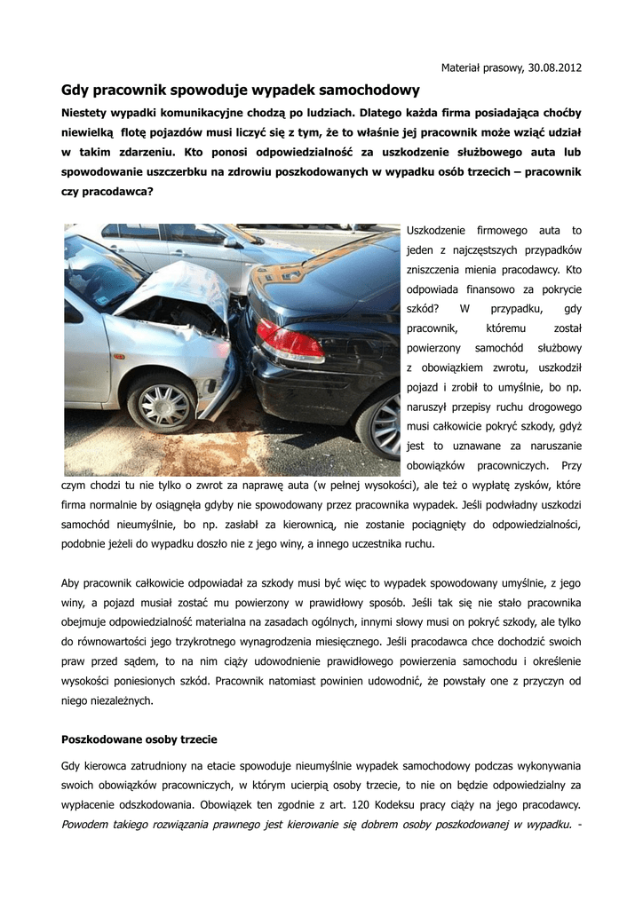 Materiał prasowy, 30.08.2012 Gdy pracownik spowoduje wypadek samochodowy Niestety wypadki komunikacyjne chodzą po ludziach. Dlatego każda firma posiadająca choćby niewielką flotę pojazdów musi liczyć się z tym, że to właśnie jej pracownik może wziąć udział w takim zdarzeniu. Kto ponosi odpowiedzialność za uszkodzenie służbowego auta lub spowodowanie uszczerbku na zdrowiu poszkodowanych w wypadku osób trzecich – pracownik czy pracodawca? Uszkodzenie firmowego auta to jeden z najczęstszych przypadków zniszczenia mienia pracodawcy. Kto odpowiada finansowo za pokrycie szkód? W przypadku, gdy pracownik, któremu został powierzony samochód służbowy z obowiązkiem zwrotu, uszkodził pojazd i zrobił to umyślnie, bo np. naruszył przepisy ruchu drogowego musi całkowicie pokryć szkody, gdyż jest to uznawane za naruszanie obowiązków pracowniczych. Przy czym chodzi tu nie tylko o zwrot za naprawę auta (w pełnej wysokości), ale też o wypłatę zysków, które firma normalnie by osiągnęła gdyby nie spowodowany przez pracownika wypadek. Jeśli podwładny uszkodzi samochód nieumyślnie, bo np. zasłabł za kierownicą, nie zostanie pociągnięty do odpowiedzialności, podobnie jeżeli do wypadku doszło nie z jego winy, a innego uczestnika ruchu. Aby pracownik całkowicie odpowiadał za szkody musi być więc to wypadek spowodowany umyślnie, z jego winy, a pojazd musiał zostać mu powierzony w prawidłowy sposób. Jeśli tak się nie stało pracownika obejmuje odpowiedzialność materialna na zasadach ogólnych, innymi słowy musi on pokryć szkody, ale tylko do równowartości jego trzykrotnego wynagrodzenia miesięcznego. Jeśli pracodawca chce dochodzić swoich praw przed sądem, to na nim ciąży udowodnienie prawidłowego powierzenia samochodu i określenie wysokości poniesionych szkód. Pracownik natomiast powinien udowodnić, że powstały one z przyczyn od niego niezależnych. Poszkodowane osoby trzecie Gdy kierowca zatrudniony na etacie spowoduje nieumyślnie wypadek samochodowy podczas wykonywania swoich obowiązków pracowniczych, w którym ucierpią osoby trzecie, to nie on będzie odpowiedzialny za wypłacenie odszkodowania. Obowiązek ten zgodnie z art. 120 Kodeksu pracy ciąży na jego pracodawcy. Powodem takiego rozwiązania prawnego jest kierowanie się dobrem osoby poszkodowanej w wypadku. - mówi Agnieszka Kaźmierczak z firmy Flotis zajmującej się monitoringiem GPS pojazdów - Istnieje po prostu większe prawdopodobieństwo uzyskania odszkodowania od strony dysponującej większymi środkami finansowymi. Poza tym pracodawca z racji zatrudniania osób wykonujących zleconą przez niego pracę musi liczyć się z pewnym ryzykiem osobowym związanym właśnie z nieumyślnym wyrządzeniem szkody przez pracownika. Jednak, aby to firma ponosiła odpowiedzialność muszą zostać spełnione pewne warunki. Po pierwsze pracownik musi zawinić nieumyślnie. Po drugie szkoda musi zostać popełniona w momencie wypełniania przez pracownika swoich obowiązków. Jeżeli warunki te zostaną spełnione pracodawca jest zobowiązany do wypłacenia odszkodowania zarówno w zakresie pokrycia szkód materialnych, jak i np. kosztów leczenia poszkodowanego. Nie oznacza to jednak, że pracownik nie poniesie żadnych konsekwencji i może beztrosko powodować wypadki. Zgodnie z art. 120 Kodeksu pracy obowiązuje go wobec pracodawcy tzw. odpowiedzialność regresowa. Pracodawca może więc domagać się od pracownika zwrotu wypłaconego odszkodowania. Niemniej maksymalna kwota jakiej może oczekiwać pracodawca nie może przekroczyć wysokości trzykrotnej miesięcznej pensji pracownika, przysługującej mu w momencie wyrządzenia szkody. Wiele firm posiada ubezpieczenie AC, które pokrywa koszty związane z naprawieniem szkód spowodowanych w wypadkach samochodowych czy np. związanych z kradzieżą samochodu służbowego z winy pracownika. Jednak w pewnych sytuacjach ubezpieczyciel może odmówić wypłaty odszkodowania. Zazwyczaj dzieje się tak w przypadku, gdy kierowca spowodował wypadek będąc pod wpływem alkoholu lub na skutek nieprzestrzegania przepisów ruchu drogowego. W świetle polskiego prawa posiadanie ubezpieczenia AC nie jest konieczne, a jego brak może powodować pociągnięcie pracownika do odpowiedzialności finansowej. Dobrym rozwiązaniem jest ustalenie zawczasu zasad postępowania w razie wypadku i przekazanie pracownikowi z jakimi konsekwencjami musi się liczyć. W autach służbowych natomiast można umieścić instrukcje co robić i do kogo w firmie zadzwonić w pierwszej kolejności, gdy zdarzy się wypadek, dzięki temu pracownicy będą wiedzieli jak się zachować mimo silnego stresu. Źródło: Creandi.pl