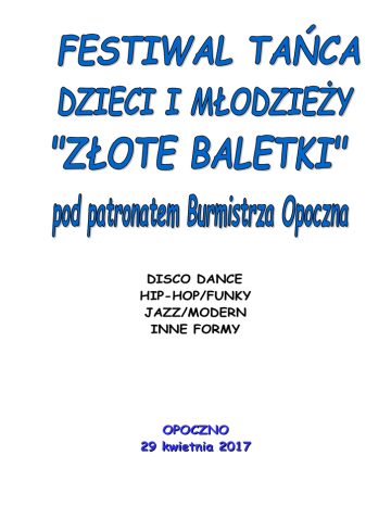 DISCO DANCE HIP-HOP/FUNKY JAZZ/MODERN INNE FORMY OPOCZNO 29 kwietnia 2017 REGULAMIN ORGANIZATORZY Klub Sportowy „ASTER” Urząd Gminy Opoczno MIEJSCE IMPREZY Miejski Dom Kultury ul. Biernackiego 4 26-300 Opoczno WARUNKI UCZESTNICTWA 1. Przesłanie zgłoszenia uczestników do dnia 08.04.2017 r na adres: Klub Sportowy „ASTER” ul. Jana Pawła II 41/41 A, 97-200 Tomaszów Maz. lub e-mail: [email protected] i potwierdzić telefonicznie Bardzo proszę o terminowe zgłaszanie zawodników, po tym terminie nie zostanie utworzona żadna dodatkowa kategoria wiekowa i taneczna. 2. Przedstawienie ważnej polisy ubezpieczeniowej NW. 3. W przypadku braku dokumentów z punktu 2 należy przedstawić oświadczenie opiekunów/instytucji delegującej lub rodziców/ o przejęciu odpowiedzialności za stan zdrowia i konsekwencji NW. 4. Wniesienie opłaty startowej na konto Klubu do dnia 20.04.2017 wysokości: - w kategoriach solowych: 30 zł, duety - 50 zł, - mini formacje: 120 zł, formacje 270 zł. PKO BP o/Tomaszów Maz. 78 1020 3916 0000 0602 0113 9161 (prosimy o niedokonywanie wpłat gotówkowych, tylko przelewowe) 5. Odebranie numeru startowego najpóźniej godzinę przed daną kategorią w dniu imprezy. w NAGRANIA SOLO i DUETY: DISCO DANCE, HIP-HOP - muzyka organizatora, w eliminacjach prezentacje grupowe 2-4 osobowe (czas do 45 sekund) w finałach prezentacje indywidualne (czas do 1 minuty) pozostałe kategorie - muzyka własna (czas 1.15 do 2 minut) MINI FORMACJE I FORMACJE: WSZYSTKIE KATEGORIE - muzyka własna, czas mini form.: 2.00-2.30, formacje: 2.30-4.00 SĘDZIOWANIE Imprezę oceniać będzie 3-osobowa komisja sędziowska wyznaczona przez organizatora. Prawidłowy przebieg imprezy nadzorować będzie Przedstawiciel Organizatora. KATEGORIE WIEKOWE Dzieci 2004 i młodsi Juniorzy 2001-2003 Seniorzy 2000 i starsi Organizator zastrzega sobie prawo do stworzenia oddzielnych kategorii wiekowych przy dużej ilości zgłoszeń podstawą do utworzenia większej ilości kategorii wiekowych jest podanie dokładnych dat urodzenia wszystkich zawodników (w tym też w dużych składach). O przynależności do kategorii wiekowej mini formacji czy formacji decyduje większość wieku całej grupy (mf do 2 osób może tańczyć w młodszej kategorii przy 7 osobowej mf, w formacji do 9 osób przy składzie 24). W kategorii disco dance formacje akrobatyka i podnoszenia są dozwolone ale nie muszą występować i nie mogą dominować. Po uzyskaniu zgłoszeń od Klubów organizator zastrzega sobie prawo połączenia lub podziału kategorii wiekowych i tanecznych oraz odwołania prezentacji solo i duetów. W przypadku kilku zgłoszeń dzieci do 8 roku życia powstanie oddzielna kategoria wiekowa. Organizator podczas trwania imprezy zapewnia opiekę medyczną nad uczestnikami. Numery Startowe może odebrać wyłącznie opiekun grupy bądź osoba przez niego upoważniona. NAGRODY Dyplomy, ponadto medale dla laureatów wszystkich kategorii. INFORMACJE DODATKOWE Wymiary sceny 8 m x 9 m Organizator nie odpowiada za przedmioty wartościowe pozostawione w szatni. Ubezpieczenia zawodników dokonują instytucje zgłaszające. Organizator nie sprawuje opieki nad uczestnikami Festiwalu. Wszyscy tancerze zobowiązani są do używania obuwia sportowego (lub tańczenia bez obuwia). Niedozwolone jest używanie obuwia, które może zniszczyć - zarysować parkiet. Na prowadzenie reklamy w każdej postaci należy uzyskać pisemną zgodę organizatora. Należy przestrzegać przepisów p. poż. i zasad bezpieczeństwa. Dokonanie zgłoszenia i udział w Festiwalu Tańca Dzieci i Młodzieży „Złote Baletki” równoznaczne jest z wyrażeniem na zawsze i bezwarunkowo nieodpłatnej zgody na rejestrację fotograficzną, video i telewizyjną wszystkich prezentacji oraz ich wykorzystanie, publikację i emisję w dowolnych mediach przez organizatorów, a także na wykorzystanie danych osobowych w materiałach z Festiwalu. Protesty wyłącznie w formie pisemnej należy składać u Organizatora. WSTĘPNY PROGRAM IMPREZY ZOSTANIE PODANY PO PRZYJĘCIU ZGŁOSZEŃ NA STRONIE www.asterklub.pl KARTA ZGŁOSZENIA NAZWA KLUBU – MIEJSCOWOŚĆ ………………………………………………………… INSTRUKTOR ……………………………………………………………………………………………… NUMER TELEFONU …………………………………………………………………………………… DANE DO FAKTURY …………………………………………………………………………………. ………………………………………………………………………………………………………………………… …………………………………………………………………………………………………………………………. Kategorie SOLO: Lp. 1 2 3 4 5 6 7 8 9 10 11 12 13 14 15 16 17 18 19 Nazwisko i imię Data ur. DD HH J/M IF Kategorie DUETY: Lp. Nazwisko i imię Data ur. DD HH 1 2 3 4 5 Kategorie MINI FORMACJI: L p. Nazwisko i imię Data ur. DD HH J/M IF DD HH J/M IF 1 2 3 4 5 6 7 Kategorie FORMACJI: Lp. 1 2 3 4 5 6 7 8 Nazwisko i imię Data ur. J/M IF 9 10 11 12 13 14 15 16 17 18 19 20 21 22 23 24