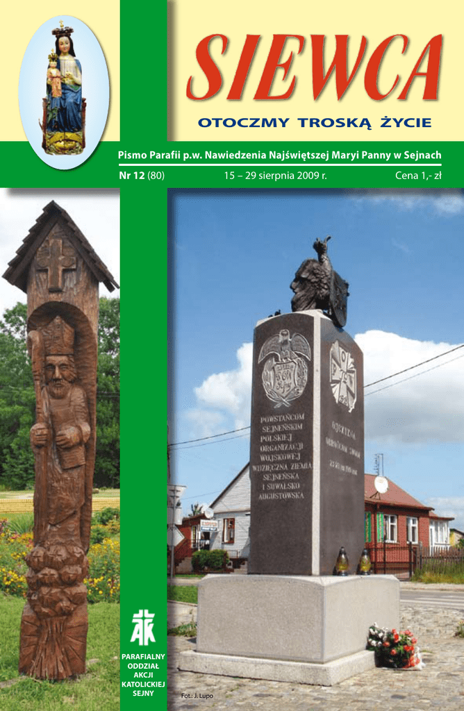 OTOCZMY TROSKĄ ŻYCIE Pismo Parafii p.w. Nawiedzenia Najświętszej Maryi Panny w Sejnach Nr 12 (80) PARAFIALNY ODDZIAŁ AKCJI KATOLICKIEJ SEJNY 15 – 29 sierpnia 2009 r. Fot.: J. Lupo Cena 1,- zł MOC SŁOWA Niedziela XX Zwykła – 16.08.2009 J 6,51-58 J ezus powiedział do tłumów: „Ja jestem chlebem żywym, który zstąpił z nieba. Jeśli kto spożywa ten chleb, będzie żył na wieki. Chlebem, który Ja dam, jest moje ciało za życia świata”. Sprzeczali się więc między sobą Żydzi mówiąc: „Jak On może nam dać swoje ciało na pożywienie?” Rzekł do nich Jezus: „Zaprawdę, zaprawdę powiadam wam: Jeżeli nie będziecie spożywać ciała Syna Człowieczego i nie będziecie pili krwi Jego, nie będziecie mieli życia w sobie. Kto spożywa moje ciało i pije moją krew, ma życie wieczne, a Ja go wskrzeszę w dniu ostatecznym. Ciało moje jest prawdziwym pokarmem, a krew moja jest prawdziwym napojem. Kto spożywa moje ciało i krew moją pije, trwa we Mnie, a Ja w nim. Jak Mnie posłał żyjący Ojciec, a Ja żyję przez Ojca, tak i ten, kto Mnie spożywa, będzie żył przeze Mnie. To jest chleb, który z nieba zstąpił – nie jest on taki jak ten, który jedli wasi przodkowie, a poumierali. Kto spożywa ten chleb, będzie żył na wieki”. Refleksja niedzielna: Co żywi człowieka? Już czwartą niedzielę czytamy fragmenty z długiej mowy Jezusa o chlebie, zapisanej w Ewangelii Jana. Chleb i pytanie, co żywi, co czyni sytym, należą, jak się wydaje, do centralnych tematów wiary i bycia człowiekiem w ogóle. Jezus sam podejmuje ten obraz (i wzbudza tym niemałe poruszenie, a nawet zgorszenie):,, Ja jestem chlebem żywym, który zstąpił z nieba”. Co żywi człowieka, nasze ciało, naszą duszę, naszego ducha, naszą tęsknotę, nasze wspomnienie i naszą nadzieję? W zasadzie człowieka nic nie żywi tak naprawdę. Wszystko jest tymczasowe, wszystko pozostaje niegotowe i niedopełnione, nic nie jest w stanie nas nasycić raz na zawsze. Pozostajemy wciąż głodni i bezustannie szukamy, niekiedy nawet chciwie i nienasycenie, i wreszcie czasami – słowami Ingeborga Bach-manna – wyznajemy: ,,Wżyciu musi być coś więcej niż to wszystko”. Bez obawy, nie patrzę na człowieka przez czarne okulary, ale widzę istotę, która wciąż czegoś potrzebuje, stale doświadcza nędzy, bez przerwy jest zdana na kogoś i której dusza z wielkim trudem znajduje ukojenie. W tutejszej parafii, w Wiedniu, gdzie z moimi współsiostrami chętnie chodzę na Mszę Świętą, kapłan podczas Komunii Świętej składa cząstkę wielkiej Hostii na dłoni wiernych. Trzymam ten mały, niepozorny, kawałek chleba jeszcze przez moment na dłoni i modlę się: ,,Jezu, zostałeś połamany, niecały, niepozorny - ale żywisz mnie, i sycisz mnie”. Christine Rod MC Niedziela XXI Zwykła – 23.08.2009 J 6,54.60-69 Ucząc w synagodze w Kafarnaum Jezus powiedział: „Kto spożywa moje ciało i pije moją krew, ma życie wieczne, a Ja go wskrzeszę w dniu ostatecznym”. A spośród Jego uczniów, którzy to usłyszeli, wielu mówiło: „Trudna jest ta mowa. Któż jej może słuchać?” Jezus jednak świadom tego, że uczniowie Jego na to szemrali, rzekł do nich: „To was gorszy? A gdy ujrzycie Syna Człowieczego, jak będzie wstępował tam, gdzie był przedtem? Duch daje życie; ciało na nic się nie przyda. Słowa, które Ja wam powiedziałem, są duchem i życiem. Lecz pośród was są tacy, którzy nie wierzą”. Jezus bowiem na początku wiedział, którzy SIEWCA to są, co nie wierzą, i kto miał Go wydać. Rzekł więc:„Oto dlaczego wam powiedziałem: Nikt nie może przyjść do Mnie, jeżeli mu to nie zostało dane przez Ojca”. Odtąd wielu uczniów Jego się wycofało i już z Nim nie chodzili. Rzekł więc Jezus do Dwunastu: „Czyż i wy chcecie odejść?” Odpowiedział Mu Szymon Piotr: „Panie, do kogóż pójdziemy? Ty masz słowa życia wiecznego. A myśmy uwierzyli i poznali, że Ty jesteś Świętym Boga”. Refleksja niedzielna: Jezus i Jego uczniowie -niewyczerpany temat. Już tylko Jezus i Piotr dostarczają dość materiału, by nakręcić pełnometrażowy, pasjonujący film. Niekiedy Piotr jest bardzo wymowny, niekiedy małomówny, niekiedy nawet kłamcą. Ale w jego życiu zdarzają się tak jasne momenty, jakimi nie może poszczycić się żaden z uczniów Jezusa. Na przykład podczas wielkiego sporu dotyczącego nauki Jezusa o sobie jako chlebie życia, gdy już wielu Jego uczniów Go opuściło, proroczo powiedział:,,Panie, do kogóż pójdziemy? Ty masz słowa życia wiecznego”. Któż mógłby to piękniej powiedzieć niż Piotr, ów do wszystkiego zdolny naśladowca Jezusa. Często sam nie wie dokładnie, co mówi. Mimo to trafia w samo sedno. Odnosi się nieodparte wrażenie, że to sam Bóg przemawia przez niego. Tak musiało być, skoro sam Jezus zwrócił na to uwagę: „Błogosławiony jesteś, Szymonie, synu Jony. Albowiem nie objawiły ci tego ciało i krew, lecz Ojciec mój, który jest w niebie”. Tak jest też w dzisiejszej Ewangelii. Trafia w samo sedno:,,Panie, Ty masz słowa życia wiecznego. Nie możemy więc odejść od Ciebie. Jeśli to uczynimy, zginiemy”. To właśnie powiedział Piotr. Ale wkrótce potem chce uciec od swego Mistrza. Żałośnie zawodzi. A tylko ten, kto pozostaje przy Jezusie, zyska życie. Z Jezusem będziemy żyć, nawet gdy umrzemy. Michael Becker Nr 12/2009 KALENDARZ LITURGICZNY NIEDZIELA XX W CIĄGU ROKU, 16 sierpnia 2009 Słowo Boże: Prz 9,1-6; Ef 5,15-20; J 6,51-58 PONIEDZIAŁEK, 17 sierpnia 2009, wsp. św. Jacka, prezbitera Słowo Boże: Sdz 2,11-19; Mt 19,16-22 WTOREK, 18 sierpnia 2009, dzień powszedni Słowo Boże: Sdz 6,11-24; Mt 19,23-30 ŚRODA, 19 sierpnia 2009, wsp. św. Jana Eudesa, prezbitera Słowo Boże: Sdz 9,6-15; Mt 20,1-16 CZWARTEK, 20 sierpnia 2009, wsp. św. Bernarda, opata i doktora Kościoła Słowo Boże: Sdz 11,29-39; Mt 22,1-14 PIĄTEK, 21 sierpnia 2009, ws