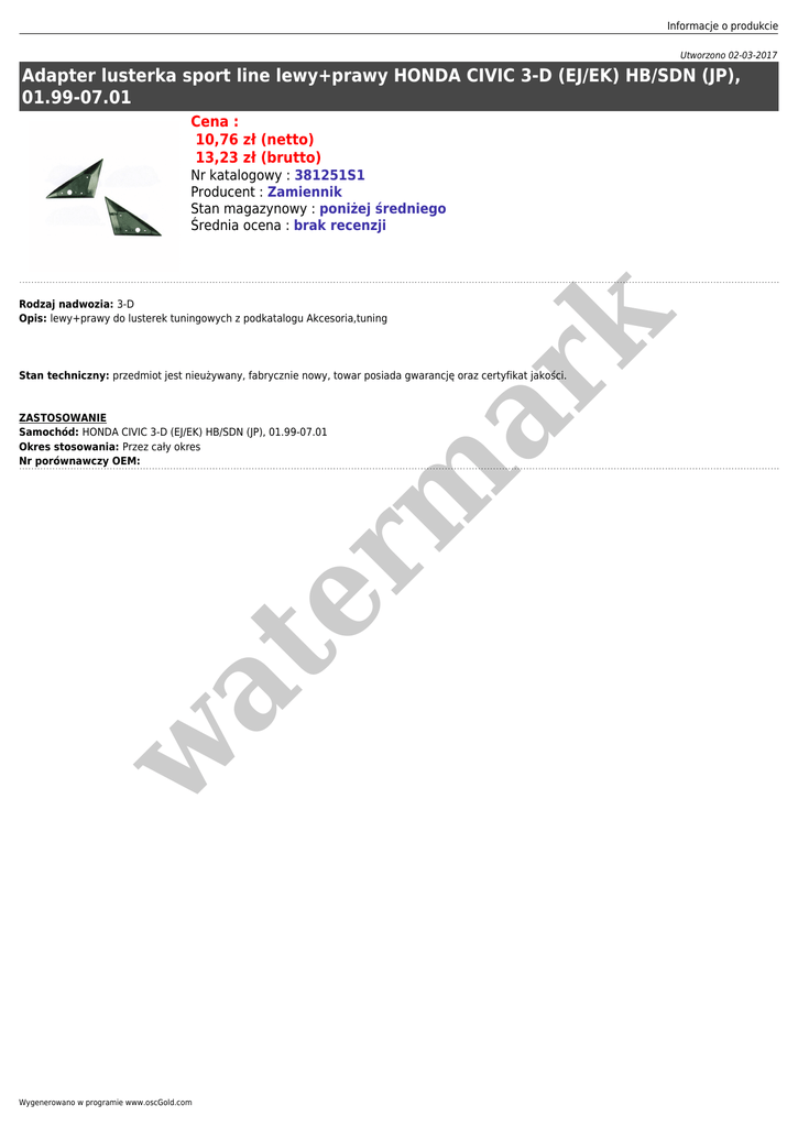 Informacje o produkcie Utworzono 02-03-2017 Adapter lusterka sport line lewy+prawy HONDA CIVIC 3-D (EJ/EK) HB/SDN (JP), 01.99-07.01 Cena : 10,76 zł (netto) 13,23 zł (brutto) Nr katalogowy : 381251S1 Producent : Zamiennik Stan magazynowy : poniżej średniego Średnia ocena : brak recenzji er m ar k Rodzaj nadwozia: 3-D Opis: lewy+prawy do lusterek tuningowych z podkatalogu Akcesoria,tuning Stan techniczny: przedmiot jest nieużywany, fabrycznie nowy, towar posiada gwarancję oraz certyfikat jakości. w at ZASTOSOWANIE Samochód: HONDA CIVIC 3-D (EJ/EK) HB/SDN (JP), 01.99-07.01 Okres stosowania: Przez cały okres Nr porównawczy OEM: Wygenerowano w programie www.oscGold.com