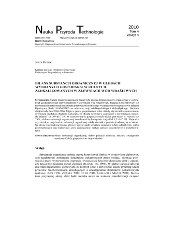 Nauka Przyroda Technologie ISSN 1897-7820 http://www.npt.up-poznan.net 2010 Tom 4 Zeszyt 4 Dział: Rolnictwo Copyright ©Wydawnictwo Uniwersytetu Przyrodniczego w Poznaniu JERZY KUPIEC Katedra Ekologii i Ochrony Środowiska Uniwersytet Przyrodniczy w Poznaniu BILANS SUBSTANCJI ORGANICZNEJ W GLEBACH WYBRANYCH GOSPODARSTW ROLNYCH ZLOKALIZOWANYCH W ZLEWNIACH WÓD WRAŻLIWYCH Streszczenie. Celem przeprowadzonych badań była analiza bilansu materii organicznej w wybranych gospodarstwach indywidualnych w zlewniach wód wrażliwych. Badania koncentrowały się na obszarach narażonych na azotany pochodzenia rolniczego wyznaczonych na podstawie zaleceń Dyrektywy Rady 91/676/EWG na obszarze woj. wielkopolskiego i dolnośląskiego. Badania obejmowały lata 2004-2006. Ujęte w pracy gospodarstwa rolne różniły się kierunkiem oraz intensywnością produkcji. Badania wykazały, że obsada zwierząt w zagrodach z inwentarzem wyniosła średnio 1,4 DJP·ha-1 UR. W analizowanych gospodarstwach udział gleb klasy VI wyniósł aż 23%, a bilans substancji organicznej kształtował się korzystnie i wyniósł 1,5 t·ha-1 UR. Największy udział w przychodzie substancji organicznej miały obornik z produkcji własnej oraz słoma. Na stronę rozchodową bilansu główny wpływ miała struktura zasiewów i duży udział zbóż, roślin przemysłowych oraz kukurydzy, przy jednocześnie małym udziale strączkowych i motylkowatych. Słowa kluczowe: bilans substancji organicznej, dobre praktyki rolnicze, obszary szczególnie narażone (OSN), gospodarstwa indywidualne Wstęp Substancja organiczna spełnia szereg korzystnych funkcji w środowisku glebowym. Jest regulatorem pobierania składników pokarmowych przez rośliny, chroniąc pierwiastki przed wymywaniem, poprawia właściwości fizyczno-chemiczne gleb i ogranicza toksyczne działanie metali ciężkich (MAZUR i IN. 1993). W glebie stanowi substrat dla mikroorganizmów glebowych, od których ilości i aktywności zależy przebieg wielu procesów biochemicznych, decydujących o udostępnianiu składników pokarmowych roślinom (KUŚ 1996, ZIĘTARA 2000, DUER 2002, GORLACH i MAZUR 2002). Każda tona przyoranej słomy zbóż bądź rzepaku może na wskutek immobilizacji związać 2 Kupiec J., 2010. Bilans substancji organicznej w glebach wybranych gospodarstw rolnych zlokalizowanych w zlewniach wód wrażliwych. Nauka Przyr. Technol. 4, 4, #49. około 10 kg azotu mineralnego. Utrzymanie równowagi w obiegu materii i przepływie energii w agroekosystemach, prowadzące do wzrostu zasobności i urodzajności gleb, jest celem ekologicznym rolnictwa i jednym z celów opracowywanej obecnie Ramowej Dyrektywy Glebowej UE. Sporządzone pod koniec lat dziewięćdziesiątych XX wieku bilanse wykazały spadek dopływu materii organicznej do gleby o 60% w porównaniu z latami osiemdziesiątymi. Spowodowane to było trudną sytuacją rolnictwa na początku lat dziewięćdziesiątych XX wieku, a co się z tym wiąże – spadkiem obsady inwentarza żywego o blisko 30% i spadkiem produkcji nawozów naturalnych, będących głównym źródłem materii organicznej w glebie. O 45% zmniejszyła się również powierzchnia upraw roślin motylkowatych i ich mieszanek z trawami, strączkowych oraz mieszanek strączkowo-zbożowych, które mają najwyższy wśród roślin uprawnych współczynnik reprodukcji materii organicznej w glebie (LASOCKI 1998). Międzyplony stanowią również doskonałe źródło paszy dla zwierząt, ale przede wszystkim ograniczają erozję wietrzną i wodną (ZWYKŁA... 2004, ŚWIĘTOCHŁOWSKI i IN. 1996). Poza tym mogą związać większą ilość azotu aniżeli przyorana słoma (1,6 ha z przyoraną słomą = 1 ha zielonego pola), z tych powodów są zaliczane do elementów dobrej praktyki rolniczej, obowiązującej m.in. na obszarach szczególnie narażonych na azotany (OSN), a także są traktowane jako jeden z pakietów przedsięwzięć rolnośrodowiskowych realizowanych w strefach priorytetowych (K01 – ochrona gleb i wód; KRAJOWY... 2007). Materiał i metody Badania prowadzone w latach 2004-2006 obejmowały gospodarstwa, których grunty w całości lub częściowo były zlokalizowane na obszarach szczególnie narażonych na azotany pochodzenia rolniczego wyznaczonych zgodnie z wymogami Dyrektywy Azotanowej UE (DYREKTYWA... 1991) w rejonie wodnym Warty i Odry (rys. 1). Dotyczyły one zlewni następujących rzek: Kopli, Pogony i Dąbrówki, Olszynki, Samicy Stęszewskiej i Mogilnicy (RZGW w Poznaniu) oraz Rowu Polskiego i Orli (RZGW we Wrocławiu). Obszary szczególnie narażone (OSN), na których prowadzono badania, były umiejscowione w zlewniach rzek, które na całej długości bądź na określonych odcinkach uznano – na podstawie Rozporządzenia Ministra Środowiska z dnia 23 grudnia 2002 (ROZPORZĄDZENIE... 2003) za wody wrażliwe na zanieczyszczenie związkami azotu ze źródeł rolniczych. Przedmiotem badań było 65 indywidualnych gospodarstw rolnych zlokalizowanych w Wielkopolsce oraz na Dolnym Śląsku. Do badań wybrano gospodarstwa o powierzchni powyżej 10 ha o zróżnicowanej specjalizacji produkcji i różnym poziomie gospodarowania oraz o różnych warunkach glebowych (tab. 1, rys. 2). Podstawowym źródłem danych były specjalnie opracowane ankiety oraz dodatkowe informacje, które uzyskano bezpośrednio w analizowanych gospodarstwach. Zakres danych obejmował przede wszystkim gospodarkę słomą, nawozami naturalnymi oraz materią organiczną z produkcji roślinnej. Dane zawierały również informacje na temat zakupionej substancji organicznej (nawozy naturalne i organiczne, słoma), która została przyorana na polach, a także o sprzedanych produktach (nawozy naturalne i organiczne, 3 Kupiec J., 2010. Bilans substancji organicznej w glebach wybranych gospodarstw rolnych zlokalizowanych w zlewniach wód wrażliwych. Nauka Przyr. Technol. 4, 4, #49. Rys. 1. Lokalizacja badanych obszarów szczególnie narażonych na azotany
