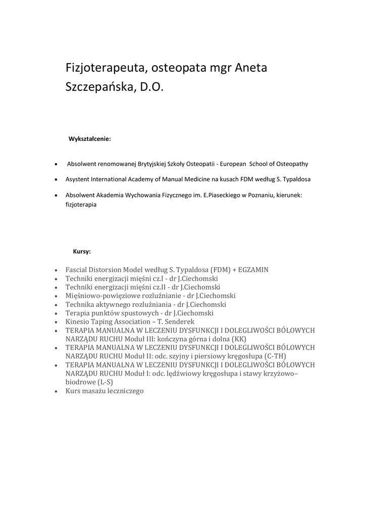 Fizjoterapeuta, osteopata mgr Aneta Szczepańska, D.O. Wykształcenie: Absolwent renomowanej Brytyjskiej Szkoły Osteopatii - European School of Osteopathy Asystent International Academy of Manual Medicine na kusach FDM według S. Typaldosa Absolwent Akademia Wychowania Fizycznego im. E.Piaseckiego w Poznaniu, kierunek: fizjoterapia Kursy: Fascial Distorsion Model według S. Typaldosa (FDM) + EGZAMIN Techniki energizacji mięśni cz.I - dr J.Ciechomski Techniki energizacji mięśni cz.II - dr J.Ciechomski Mięśniowo-powięziowe rozluźnianie - dr J.Ciechomski Technika aktywnego rozluźniania - dr J.Ciechomski Terapia punktów spustowych - dr J.Ciechomski Kinesio Taping Association – T. Senderek TERAPIA MANUALNA W LECZENIU DYSFUNKCJI I DOLEGLIWOŚCI BÓLOWYCH NARZĄDU RUCHU Moduł III: kończyna górna i dolna (KK) TERAPIA MANUALNA W LECZENIU DYSFUNKCJI I DOLEGLIWOŚCI BÓLOWYCH NARZĄDU RUCHU Moduł II: odc. szyjny i piersiowy kręgosłupa (C-TH) TERAPIA MANUALNA W LECZENIU DYSFUNKCJI I DOLEGLIWOŚCI BÓLOWYCH NARZĄDU RUCHU Moduł I: odc. lędźwiowy kręgosłupa i stawy krzyżowo– biodrowe (L-S) Kurs masażu leczniczego