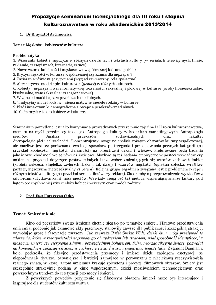 Propozycje seminarium licencjackiego dla III roku I stopnia kulturoznawstwa w roku akademickim 2013/2014 1. Dr Krzysztof Arcimowicz Temat: Męskość i kobiecość w kulturze Problematyka 1. Wizerunki kobiet i mężczyzn w różnych dziedzinach i tekstach kultury (w serialach telewizyjnych, filmie, reklamie, czasopismach, internecie, sztuce). 2. Nowe wzorce kobiecości i męskości we współczesnej kulturze polskiej. 3. Kryzys męskości w kulturze współczesnej czy szansa dla mężczyzn? 4. Zacieranie różnic między płciami (wygląd zewnętrzny, role społeczne). 5. Alternatywne modele płci kulturowej (gender) w różnych kulturach. 6. Kobiety i mężczyźni o nienormatywnej tożsamości seksualnej i płciowej w kulturze (osoby homoseksualne, biseksualne, transseksualne i transgenderowe). 7. Wizerunki matki i ojca w przekazach medialnych. 8. Tradycyjny model rodziny i nienormatywne modele rodziny w kulturze. 9. Płeć i inne czynniki demograficzne a recepcja przekazów medialnych. 10. Ciało męskie i ciało kobiece w kulturze. Seminarium pomyślane jest jako kontynuacja prowadzonych przeze mnie zajęć na I i II roku kulturoznawstwa, mam tu na myśli przedmioty takie, jak: Antropolgia kultury w badaniach marketingowych, Antropologia mediów, Analiza przekazów audiowizualnych oraz fakultet Antropologia płci i seksualności. Skoncentrujemy uwagę na analizie różnych obszarów kultury współczesnej, ale możliwe jest też porównanie ewolucji sposobów postrzegania i przedstawiania pewnych kategorii (na przykład kobiecości, męskości, cielesności) na przestrzeni dekad i wieków. Preferowane będą badania jakościowe, choć możliwe są również ilościowe. Możliwe są też badania empiryczne w postaci wywiadów czy ankiet, na przykład dotyczące postaw młodych ludzi wobec zmieniających się wzorów zachowań kobiet (kobieta sukcesu, singielka, zwierzchniczka i tak dalej) i wzorców męskości (opiekun dziecka, wrażliwy partner, mężczyzna metroseksualny et cetera). Kolejna grupa zagadnień związana jest z problemem recepcji różnych tekstów kultury (na przykład seriali, filmów czy reklam). Chodziłoby o przeprowadzenie wywiadów z odbiorcami/użytkownikami mass mediów. Wywiady mogą być też metodą wspierającą analizę kultury pod kątem obecnych w niej wizerunków kobiet i mężczyzn oraz modeli rodziny. 2. Prof. Ewa Katarzyna Citko Temat: Śmierć w kinie Kino od początków swego istnienia chętnie sięgało po tematykę śmierci. Filmowe przedstawienia umierania, podobnie jak ekranowe akty przemocy, stanowiły zawsze dla publiczności szczególną atrakcję, wywołując grozę i fascynację zarazem. Jak zauważa Rafał Syska: Widz, dzięki kinu, mógł przeżywać te zdarzenia, które w rzeczywistości napawały go obrzydzeniem lub strachem, miał sposobność identyfikacji z niosącym śmierć czy cierpienie silnym i bezwzględnym bohaterem. Film, tworząc fikcyjne światy, pozwalał na kontemplację zakazanych scen, w zachwycie i z żarliwością penetrując tematy tabu. Zygmunt Bauman z kolei podkreśla, że fikcyjne przedstawienia przemocy i śmierci dzięki zabiegom estetyzacji są nieporównanie żywsze, barwniejsze i bardziej zajmujące w porównaniu z nieciekawą rzeczywistością realnego świata, w której aktom umierania brakuje splendoru i precyzji filmowych obrazów. Śmierć jest szczególnie atrakcyjnie podana w kinie współczesnym, dzięki możliwościom technologicznym oraz powszechnym trendom do estetyzacji przemocy i śmierci. Z powyższych powodów przyjrzenie się filmowym obrazom śmierci może być interesujące i inspirujące dla studentów kulturoznawstwa. Problematyka szczegółowa: Obrazy śmierci: Lekkość i uroda zabijania Igrzyska śmierci Apokaliptyczne wizje śmierci Śmierć codzienna i śmierć herosów Śmierć dekadencka, śmierć odhumanizowana Estetyzacja śmierci Oblicza morderców Ofiary śmierci. 3. Prof. Sławomir Raube Przewiduję dwa zakresy problemowe prac licencjackich: 1) Zagadnienia związane z klasycznymi i współczesnymi koncepcjami kultury; to problematyka z pogranicza antropologii kulturowej, filozofii, socjologii i psychologii społecznej. Przykładowe zagadnienie z tego zakresu mogłoby brzmieć: Problem śmierci w koncepcji kultury Freuda; albo: Aspekty psychologiczne w kulturze według Ruth Benedict. Tematy oczywiście do uzgodnienia, to znaczy nie przewiduję ich narzucania studentom. 2) Wybrane problemy kultury współczesnej. Ten rodzaj problematyki obejmuje węższe zagadnienia niż w punkcie 1). Tu widziałbym omówienia i analizy konkretnych (ściśle określonych) problemów z zakresu zjawisk kulturowych, takich jak – kultura popularna (funkcjonowanie mediów, nowe media i ich wpływ na zachowania społeczne), subkultury, kultury regionalne, wpływ procesów globalizacji na kulturę, zagadnienia komercjalizacji w kulturze...Także tutaj ostateczna decyzja co do tematu pracy licencjackiej należy do studentów. 4. Prof. Alicja Kisielewska Nowa telewizja XXI wieku Tematyka seminarium będzie dotyczyła wybranych problemów telewizji, traktowanej jako kulturowe doświadczenie oraz dyskurs, u progu ery postsieci początków XXI wieku. Przemiany modelu telewizji związane z rozwojem telewizji satelitarnej, stacji kablowych, postępującej segmentacji widowni, zdobyciem silnej pozycji przez stacje, takie jak HBO a także konwergencja mediów spowodowały, że w nowej konfiguracji środków komunikacji stanowi ona doświadczenie o zasadniczym znaczeniu. Przedmiotem namysłu na seminarium będą związki między telewizją a internetem oraz mediami mobilnymi. Spróbujemy się zastanowić: czym dzisiaj jest telewizja?, w jaki sposób zmienia się produkcja telewizyjna?, jak zmieniają się społeczne praktyki odbiorcze? Istotnym elementem zajęć będą dyskusje wokół przeczytanych tekstów teoretycznych. Pozwolą one wypracować odpowiednie do podejmowanej problematyki stanowiska metodologic