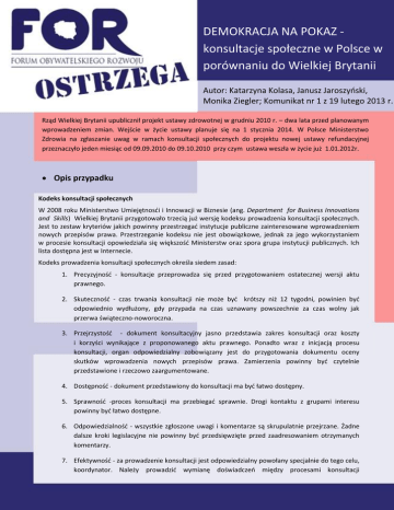 DEMOKRACJA NA POKAZ konsultacje społeczne w Polsce w porównaniu do Wielkiej Brytanii Autor: Katarzyna Kolasa, Janusz Jaroszyński, Monika Ziegler; Komunikat nr 1 z 19 lutego 2013 r. Rząd Wielkiej Brytanii upublicznił projekt ustawy zdrowotnej w grudniu 2010 r. – dwa lata przed planowanym wprowadzeniem zmian. Wejście w życie ustawy planuje się na 1 stycznia 2014. W Polsce Ministerstwo Zdrowia na zgłaszanie uwag w ramach konsultacji społecznych do projektu nowej ustawy refundacyjnej przeznaczyło jeden miesiąc od 09.09.2010 do 09.10.2010 przy czym ustawa weszła w życie już 1.01.2012r. Opis przypadku Kodeks konsultacji społecznych W 2008 roku Ministerstwo Umiejętnosći i Innowacji w Biznesie (ang. Department for Business Innovations and Skills) Wielkiej Brytanii przygotowało trzecią już wersję kodeksu prowadzenia konsultacji społecznych. Jest to zestaw kryteriów jakich powinny przestrzegać instytucje publiczne zainteresowane wprowadzeniem nowych przepisów prawa. Przestrzeganie kodeksu nie jest obowiązkowe, jednak za jego wykorzystaniem w procesie konsultacji opowiedziała się większość Ministerstw oraz spora grupa instytucji publicznych. Ich lista dostępna jest w Internecie. Kodeks prowadzenia konsultacji społecznych określa siedem zasad: 1. Precyzyjność - konsultacje przeprowadza się przed przygotowaniem ostatecznej wersji aktu prawnego. 2. Skuteczność - czas trwania konsultacji nie może być krótszy niż 12 tygodni, powinien być odpowiednio wydłużony, gdy przypada na czas uznawany powszechnie za czas wolny jak przerwa świąteczno-noworoczna. 3. Przejrzystość - dokument konsultacyjny jasno przedstawia zakres konsultacji oraz koszty i korzyści wynikające z proponowanego aktu prawnego. Ponadto wraz z inicjacją procesu konsultacji, organ odpowiedzialny zobowiązany jest do przygotowania dokumentu oceny skutków wprowadzenia nowych przepisów prawa. Zamierzenia powinny być czytelnie przedstawione i rzeczowo zaargumentowane. 4. Dostępność - dokument przedstawiony do konsultacji ma być łatwo dostępny. 5. Sprawność -proces konsultacji ma przebiegać sprawnie. Drogi kontaktu z grupami interesu powinny być łatwo dostępne. 6. Odpowiedzialność - wszystkie zgłoszone uwagi i komentarze są skrupulatnie przejrzane. Żadne dalsze kroki legislacyjne nie powinny być przedsięwzięte przed zaadresowaniem otrzymanych komentarzy. 7. Efektywność - za prowadzenie konsultacji jest odpowiedzialny powołany specjalnie do tego celu, koordynator. Należy prowadzić wymianę doświadczeń między procesami konsultacji prowadzonymi w ramach różnych projektów. Ocena eksperta FOR Konsultacje społeczne w Wiekiej Brytanii a Polsce W celu ułatwienia przygotowania komentarzy do propozycji reformy brytyjskiej ochrony zdrowia przygotowano dokument konsultacyjny prezentujący stan obecny, proponowane zmiany oraz zawierający listę 20 pytań do dyskusji w procesie konsultacji. W Polsce takich pytań nie zadano w ogóle. Przeprowadzono jednak bardzo szybkie, trwające jeden miesiąc konsultacje społeczne tak naprawdę nie mające większego znaczenia, bowiem rząd nie miał fizycznej możliwości zapoznania się z proponowanymi rozwiązaniami, gdyż kilka dni po terminie ich wnoszenia tj. 14 października 2010 roku został zatwierdzony projekt ustawy. Jednak na pytanie czy konsultacje się odbyły, rząd jednogłośnie odpowiada „tak”. Z kolei w Wielkiej Brytanii ujawniono nadesłanie 188 samodzielnych komentarzy. W przedstawionym zestawieniu w podziale na reprezentowane profesje, okazało się, iż najwięcej odpowiedzi wpłynęło od przemysłu farmaceutycznego oraz pracowników NHS. W dokumencie podsumowującym przeprowadzone konsultacje społeczne znalazły się zbiorcze odpowiedzi uczestników konsultacji na każde z 20 pytań w podziale na opinie pozytywne, negatywne i obojętne. Ponadto w paru punktach w formie opisowej przedstawiono otrzymane uwagi do każdego pytania oraz szczegółowe wyjaśnienia Ministerstwa w odpowiedzi na owe komentarze. Dokument podsumowujący przeprowadzone konsultacje liczył w sumie 43 strony. W Polsce dokumentu podsumowującego stan konsultacji społecznych, uwag i komentarzy nie opublikowano. W jego miejsce pojawił się natomiast projekt ustawy, który „zawierał” wszelkie wnioski i uwagi zgłoszone przez osoby zainteresowane. Gdyby tak było rzeczywiście, to zasygnalizowane problemy pojawiłyby się w projekcie i w przyszłości nie wywołałyby m.in. tak znacznych strajków lekarzy. W Wielkiej Brytanii, poza poddaniem konsultacjom społecznym głównych założeń nowej ustawy w formie dokumentu konsultacyjnego, opublikowano również ocenę wpływu proponowanej regulacji na funkcjonowanie systemu ochrony zdrowia. Według uniwersalnej checklisty, analizowano ekonomiczne konsekwencje – jak np. wpływ propozycji na konkurencyjność rynku farmaceutyków, rozwój rynku badań klinicznych itp. Ponadto badano społeczne konsekwencje ze szczególnym uwzględnieniem respektowania zasady równości i sprawiedliwości – przygotowany został dokument precyzujący szczegółowo negatywne i pozytywne konsekwencje wprowadzenia nowych regulacji na aspekt realizacji zasady równości i sprawiedliwości społecznej. W Polsce w uzasadnieniu do projektu ustawy możemy przeczytać, że celem jest min. takie przekształcenie systemu refundacji, by w ramach dostępnych środków finansowych najlepiej odpowiadał zapotrzebowaniu społecznemu w zakresie zaopatrzenia w leki. Jednak zamierzone cele nie były przedmiotem konsultacji społecznych. Ponadto sposób przygotowania OSR (Ocena Skutków Regulacji) świadczy o niezastosowaniu się do obowiązujących przepisów lub rekomendowanych wytycznych. W Ministerstwie Zdrowia nie przeprowadzono niezależnych badań wpływu na rynek ani analiz ekonomicznych. Podsumowując stwierdzić można iż nasze konsultacje społeczne odbiegają od standardów krajów rozwiniętych. Przy tak wa